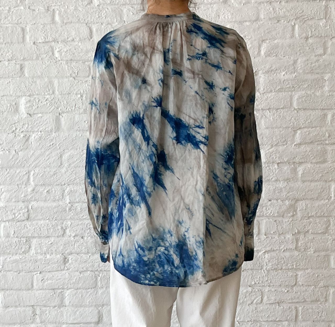 ミロバランという草木の染料で柄を付けた後に、藍柄を重ねています。