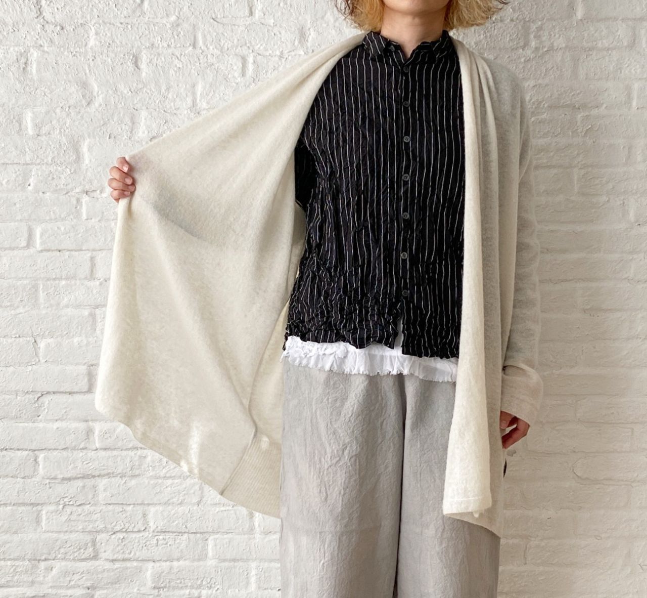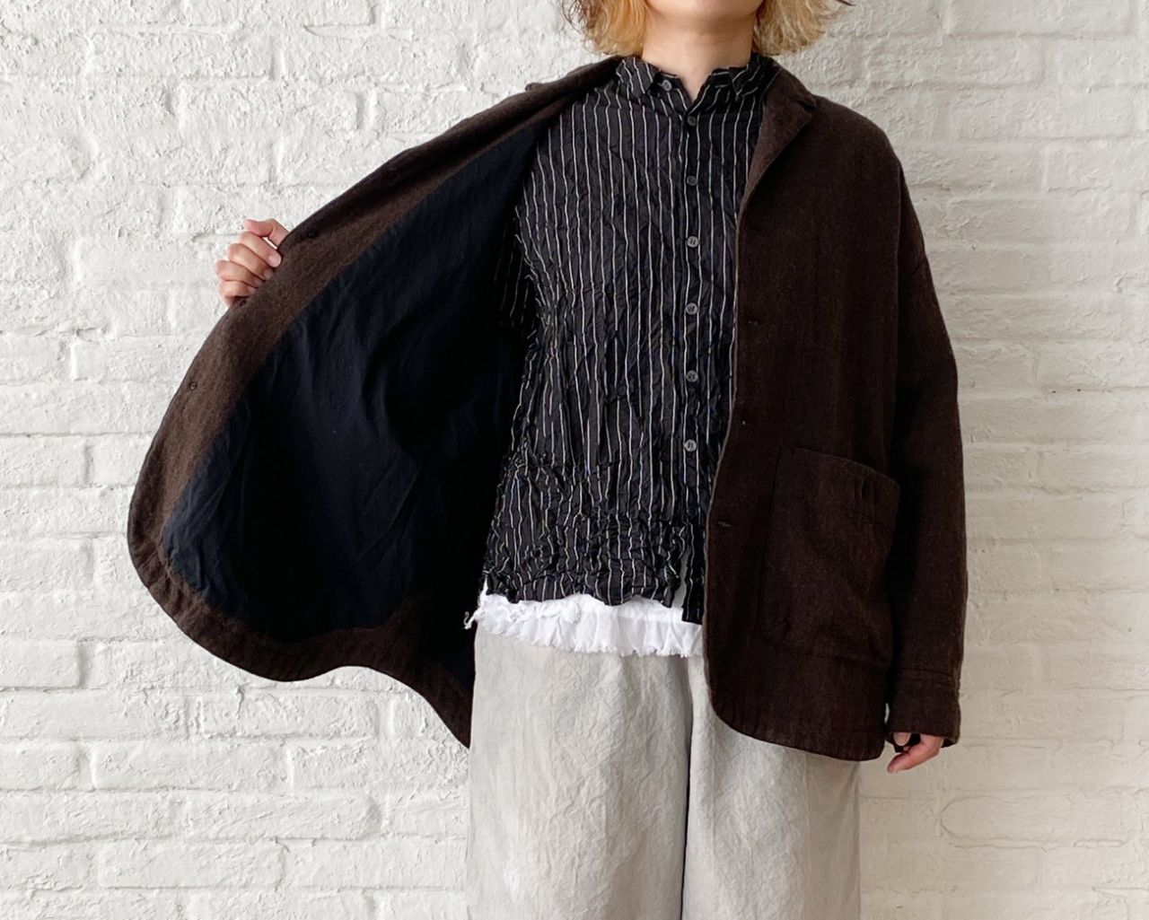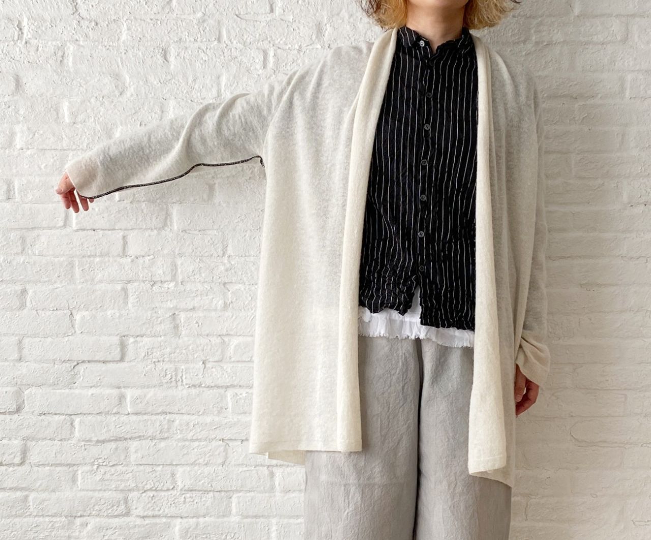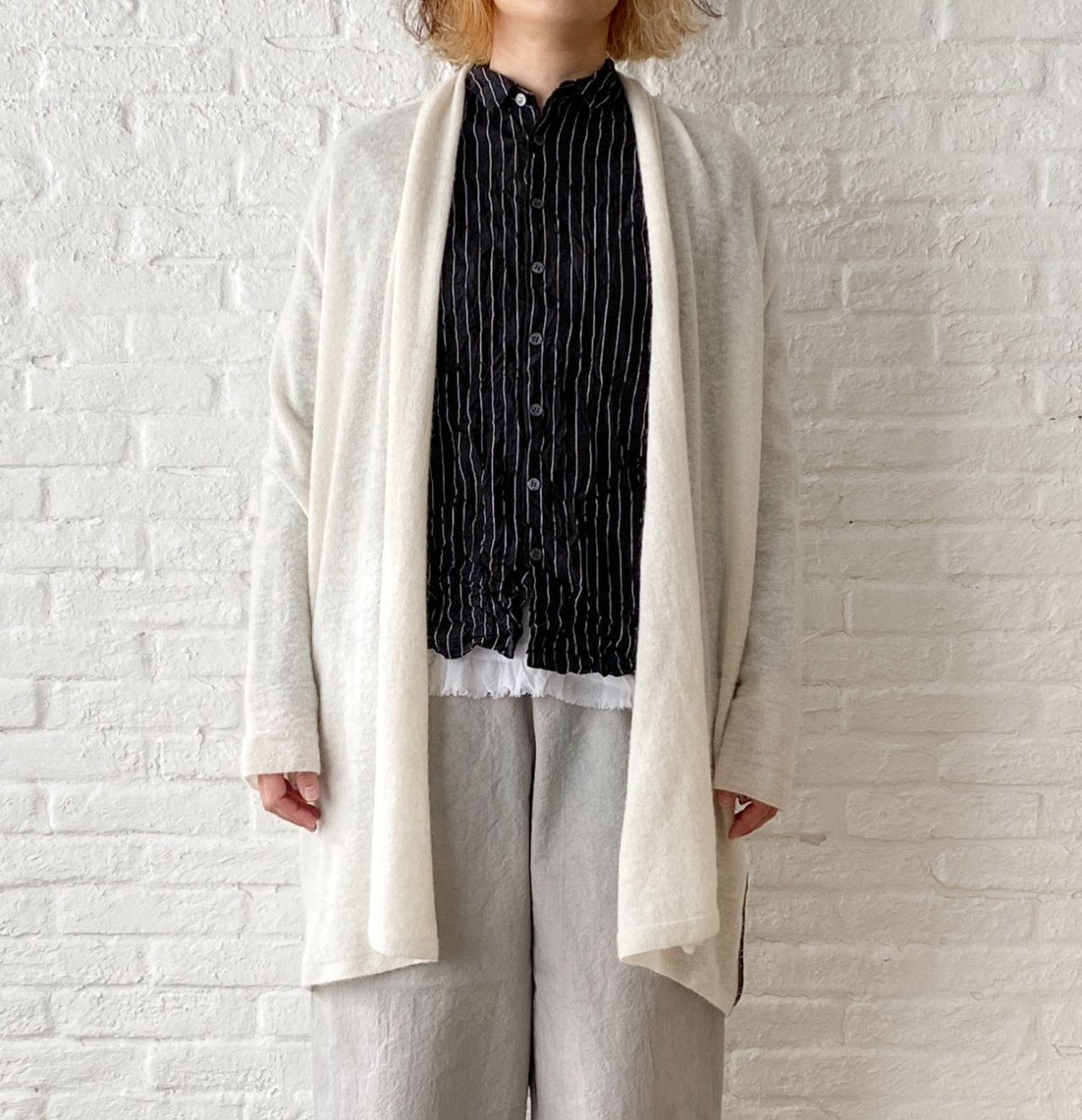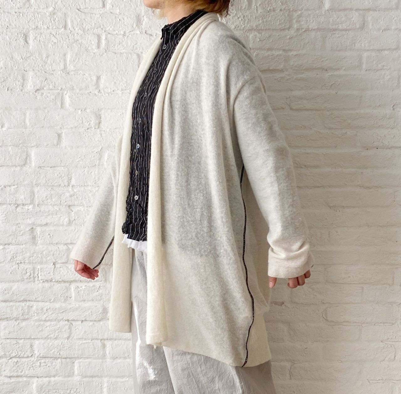 クロにホワイトのストライプ柄がシャープな印象になるので、中に新作のレース付きタンク(2月中旬発売予定:no.1460)を合わせてかわいらしさを入れました。