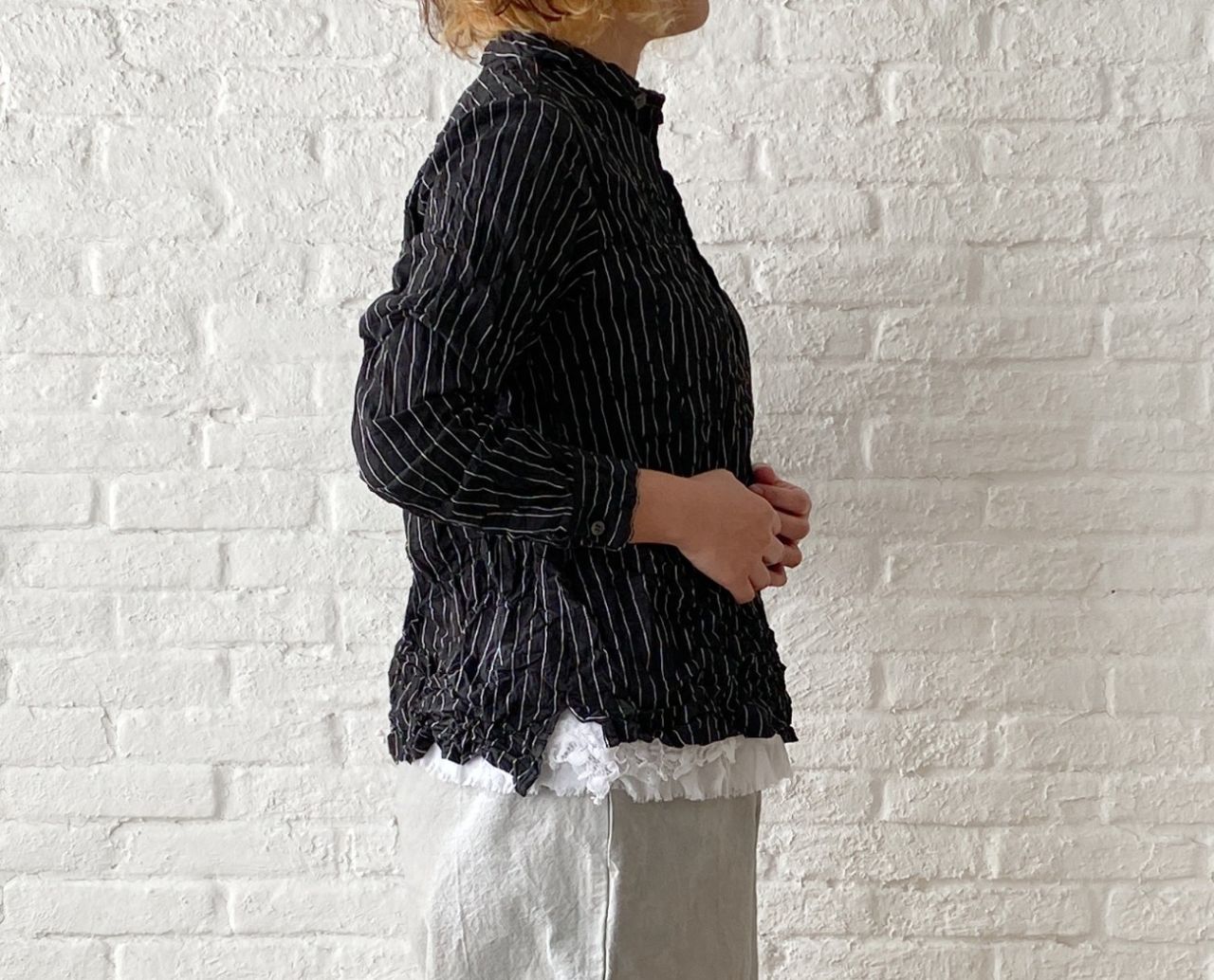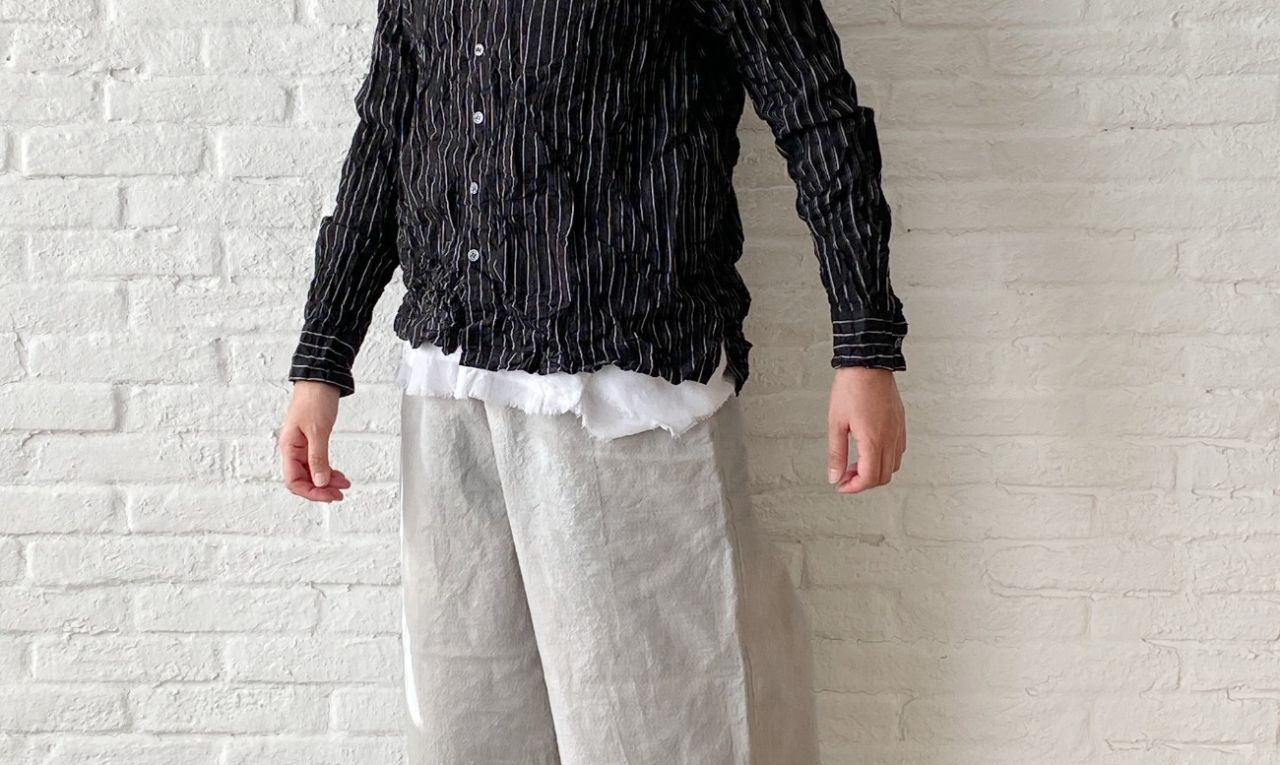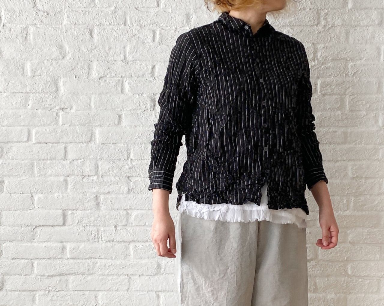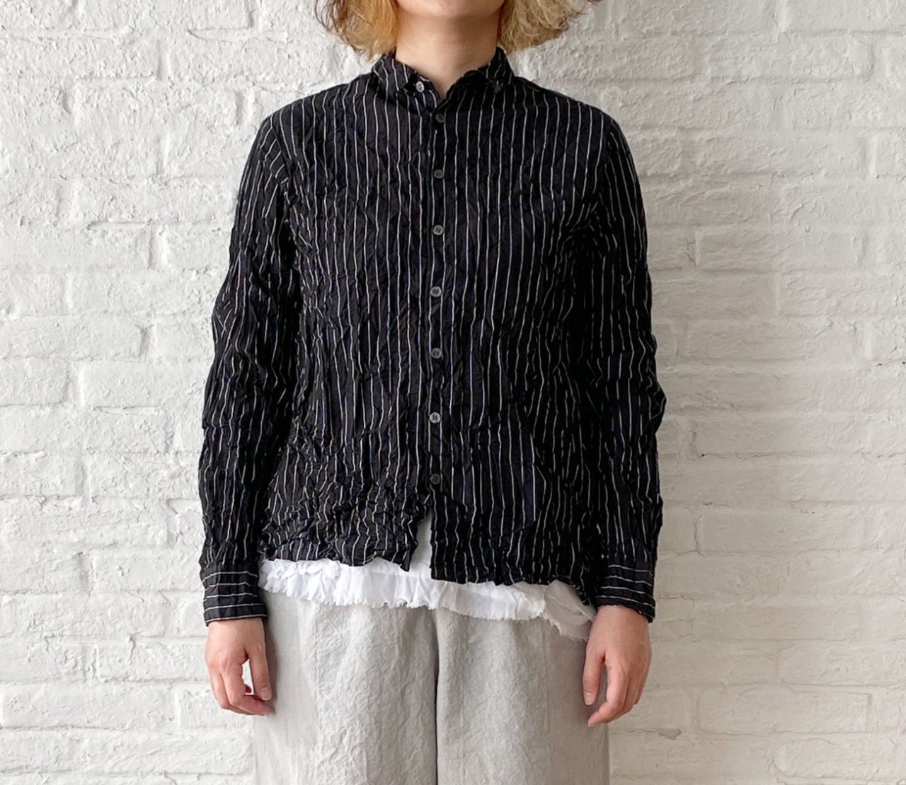 ギュッと入れたシワ加工がアクセントになったブラウス。