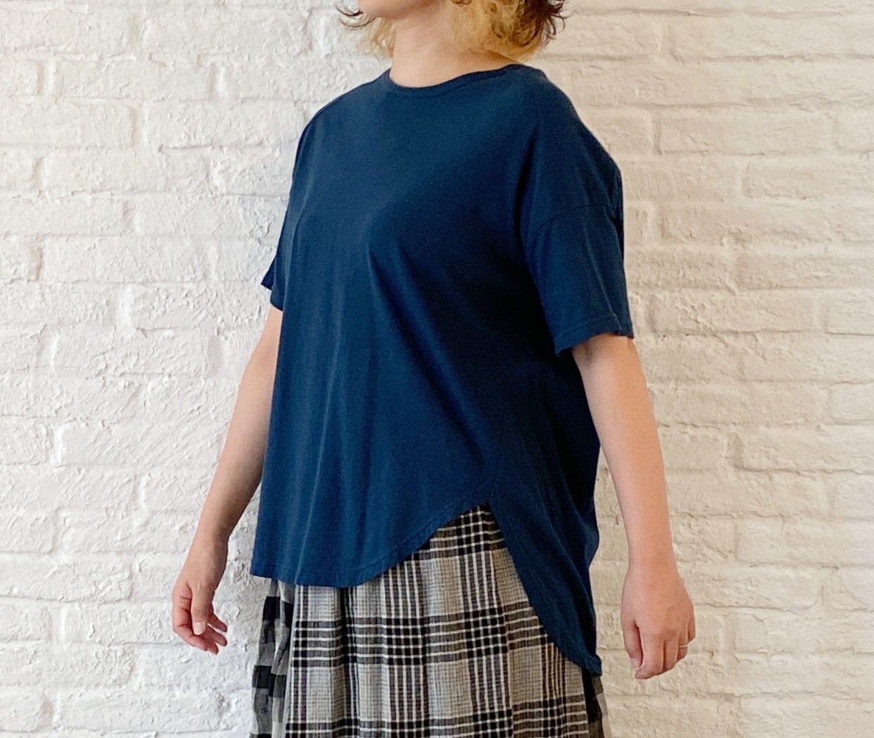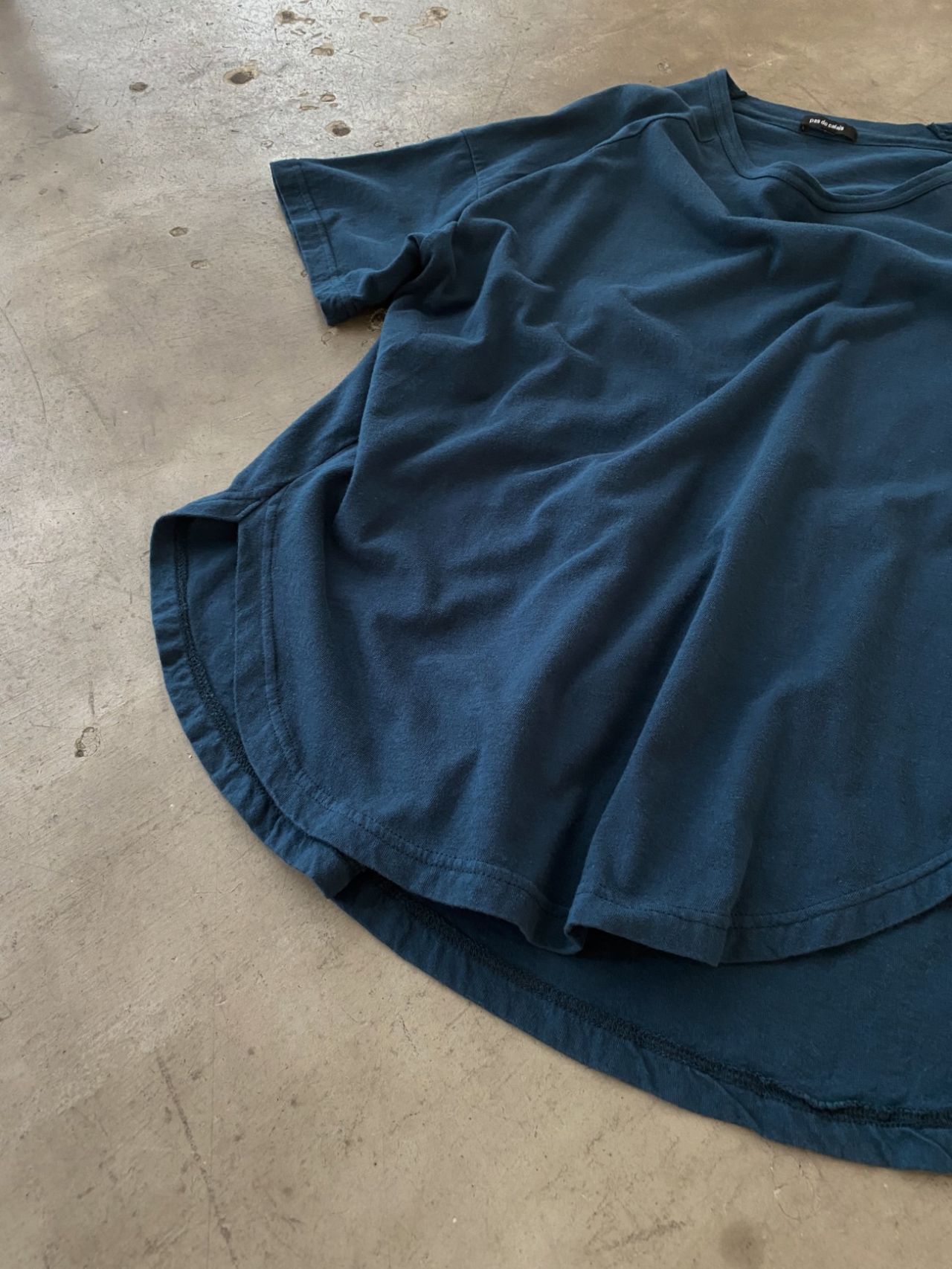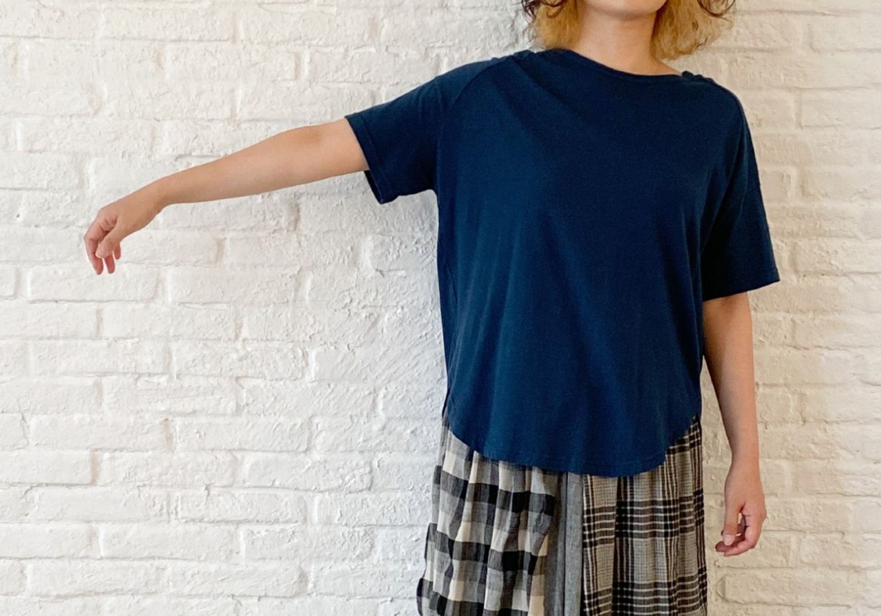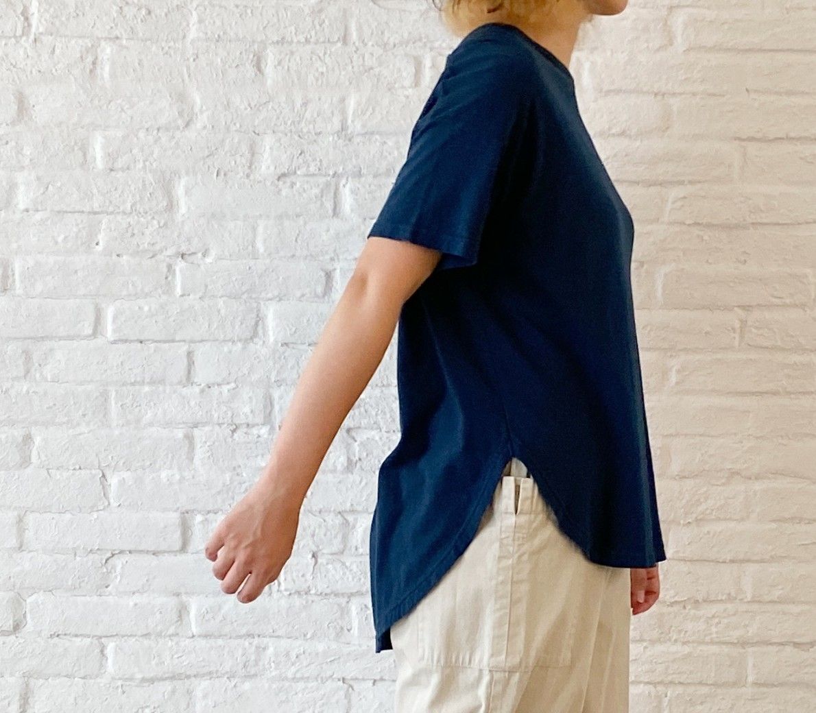 ラウンドを帯びた裾のラインが特徴の、植物染めTシャツ。