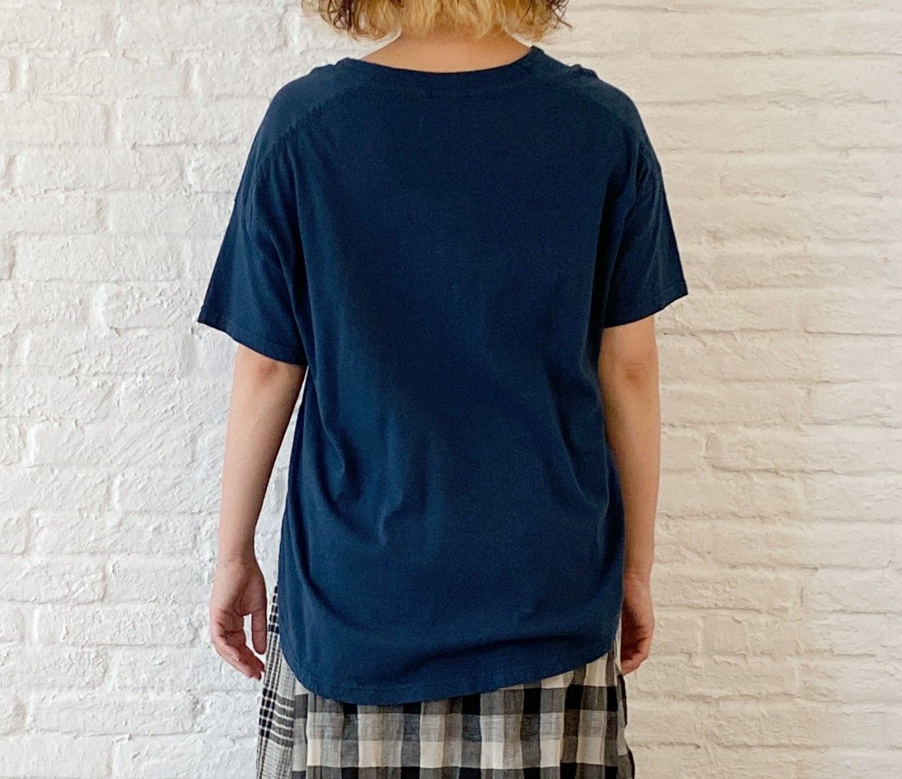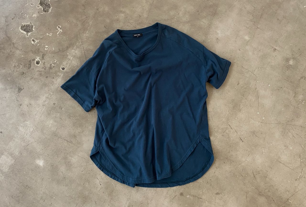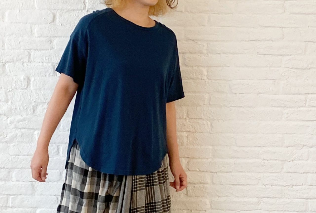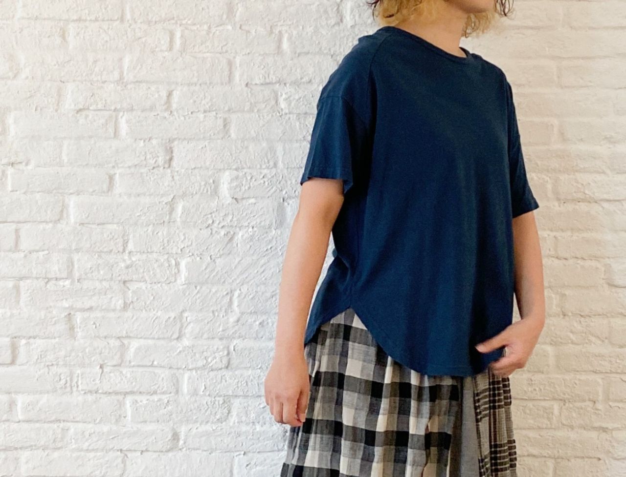 ラウンドを帯びた裾のラインが特徴の、植物染めTシャツ。