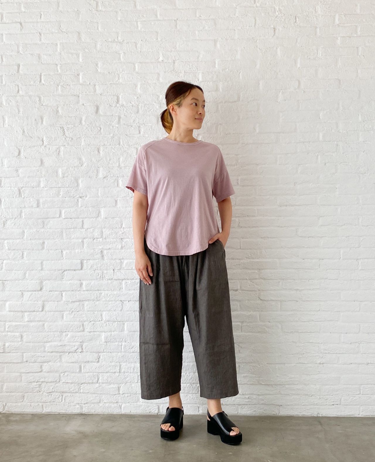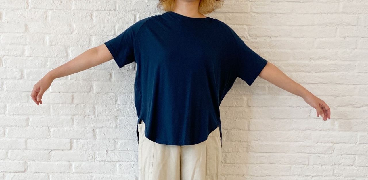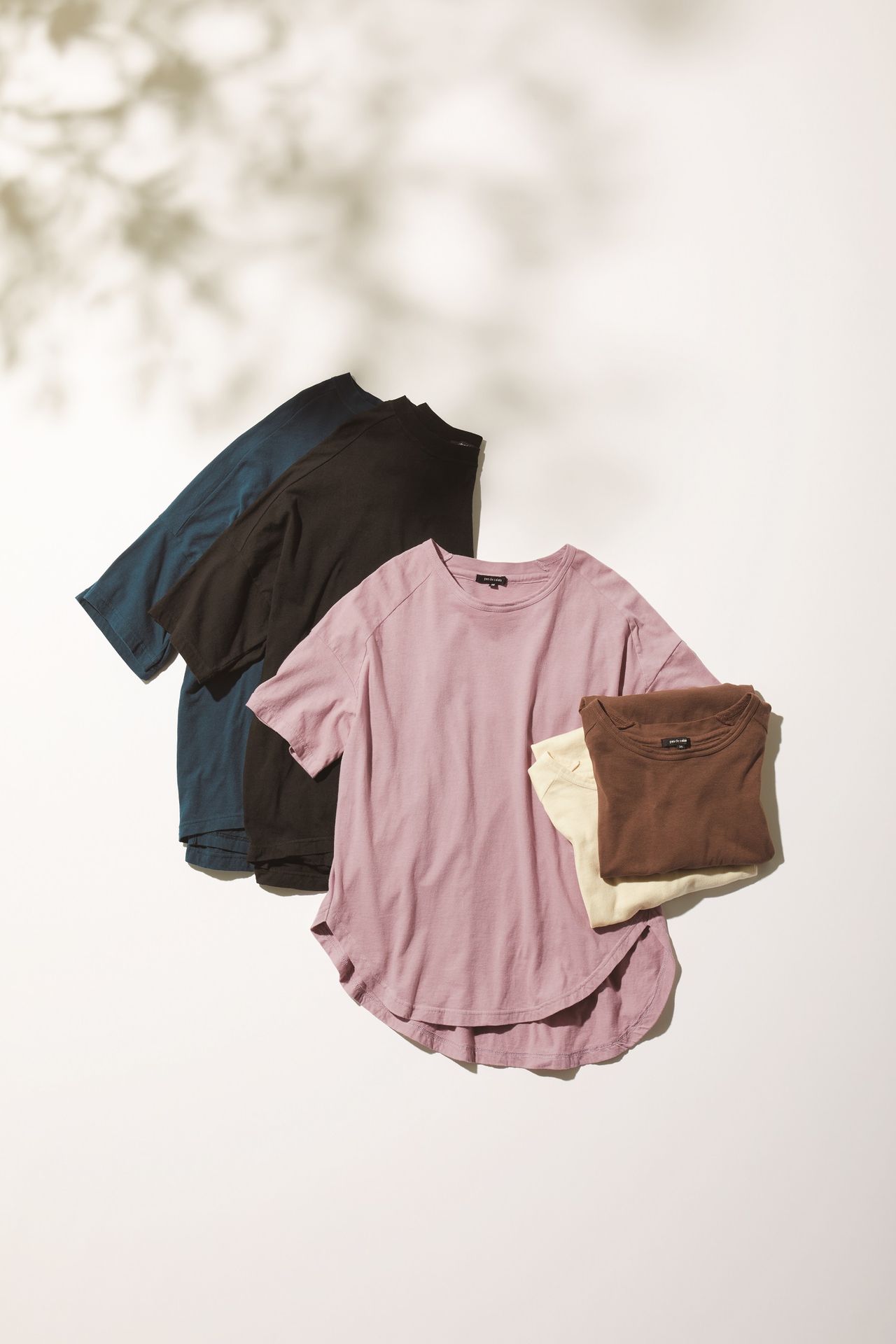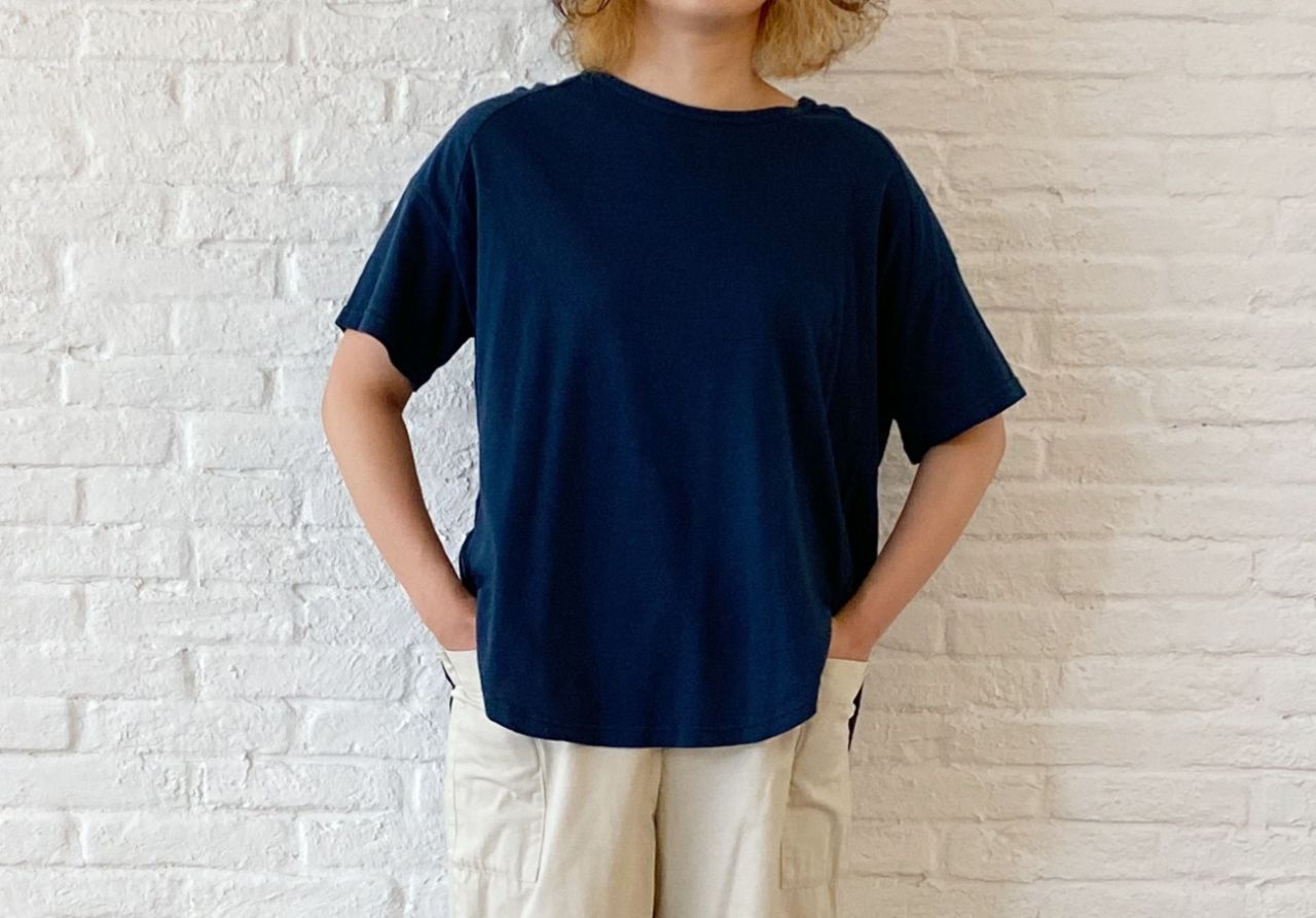 ラウンドを帯びた裾のラインが特徴の、植物染めTシャツ。
