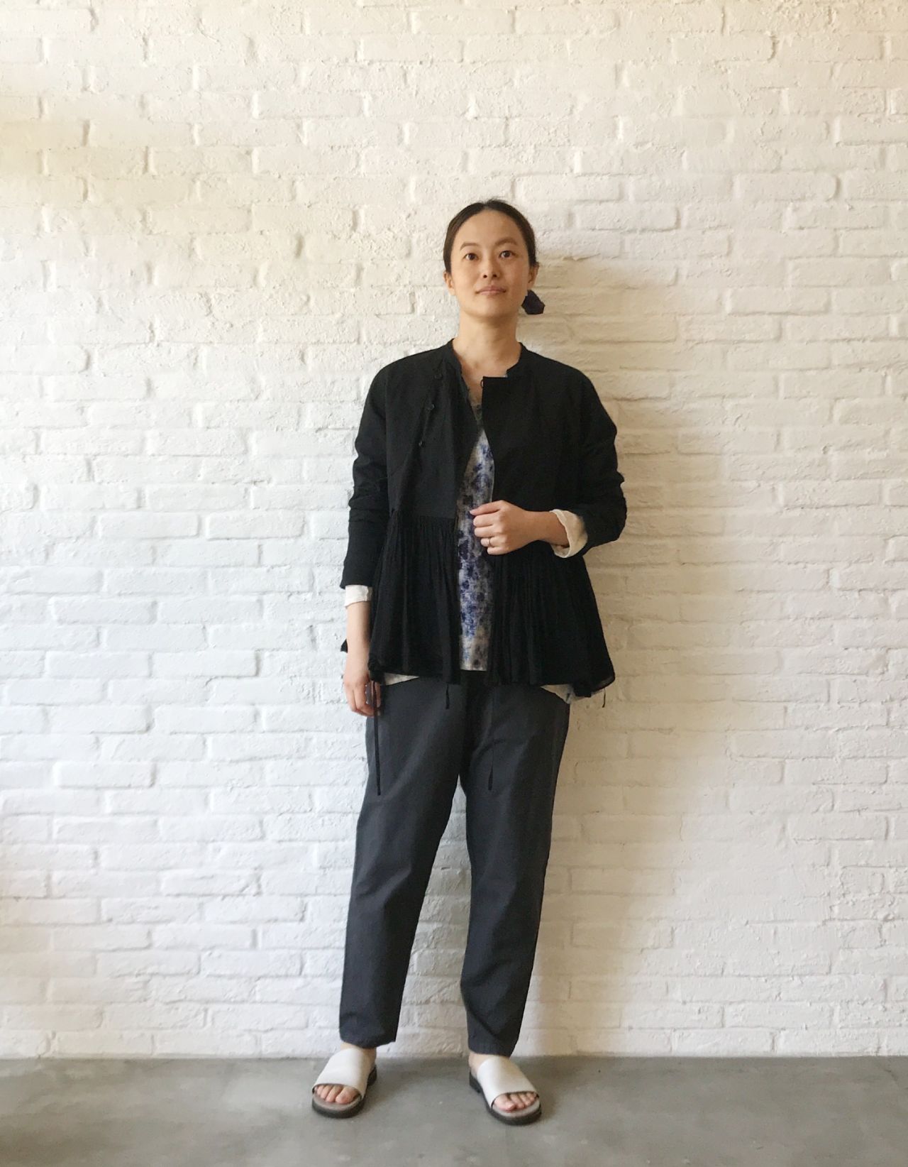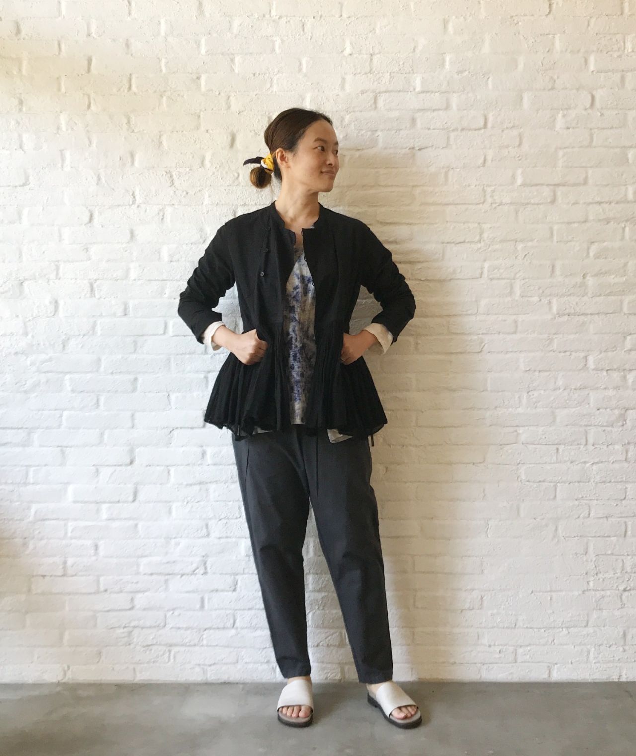 別布フリルがアクセントになったデザインジャケットで、おとなカジュアルに。