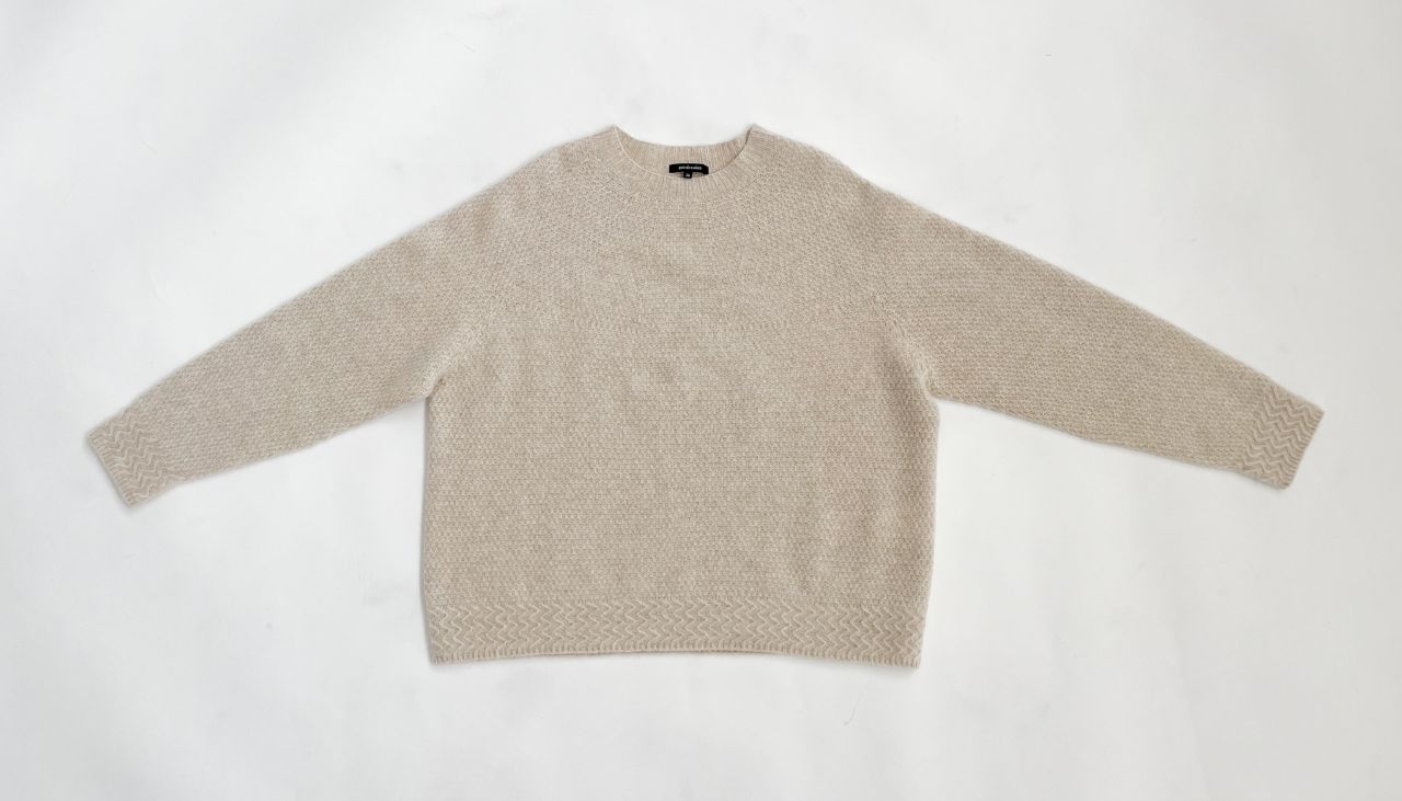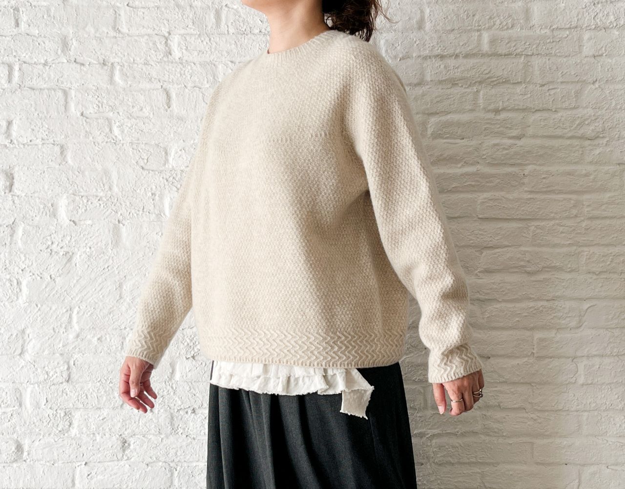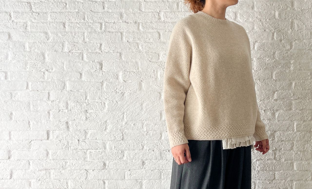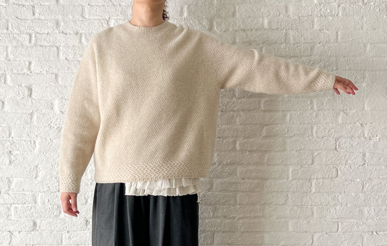 シンプルなクルーネックニットながらも、編地が非常にかわいくてポイントに!