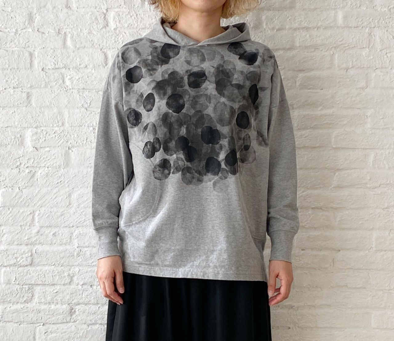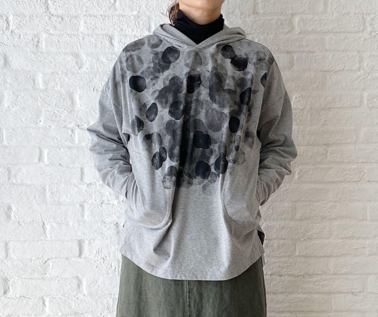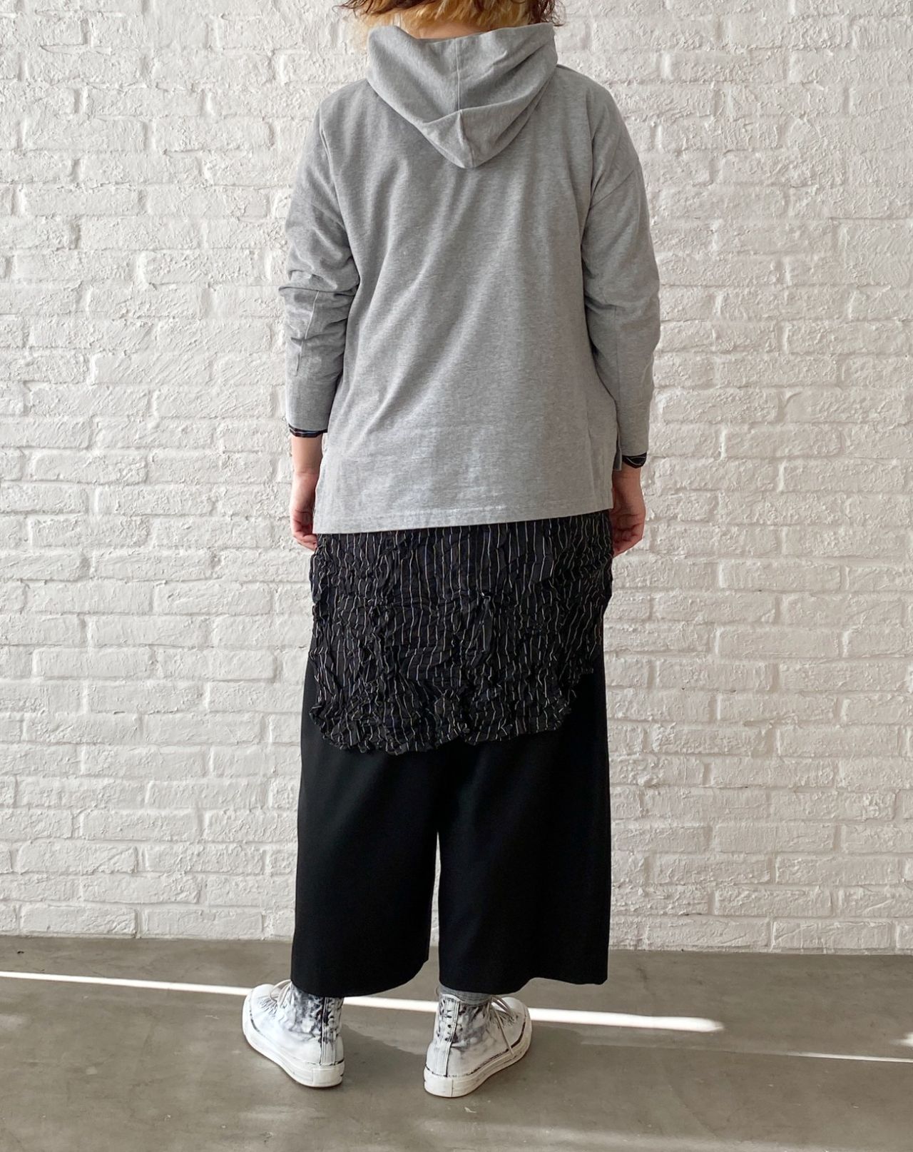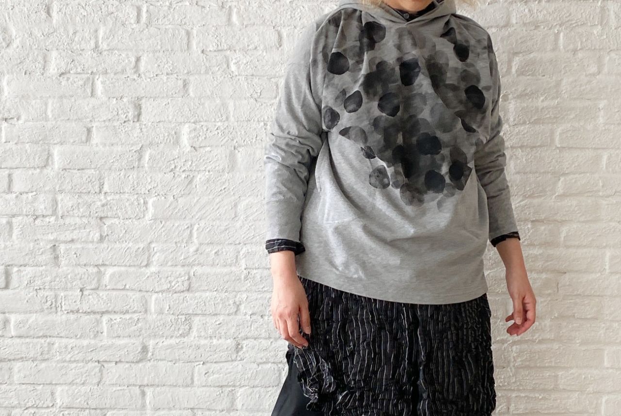 お尻を隠す着丈になりますが、長すぎないパーカープルオーバー。
