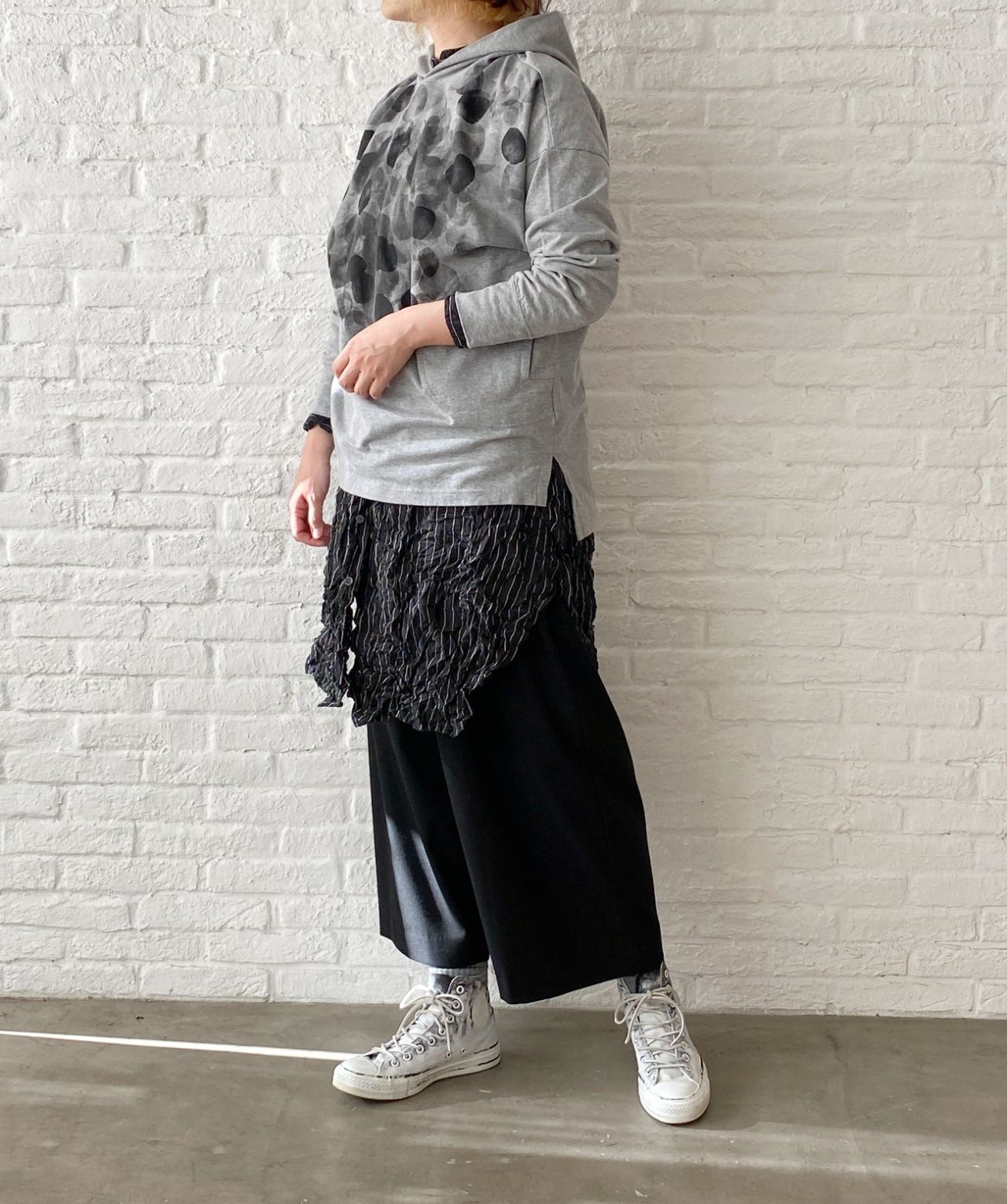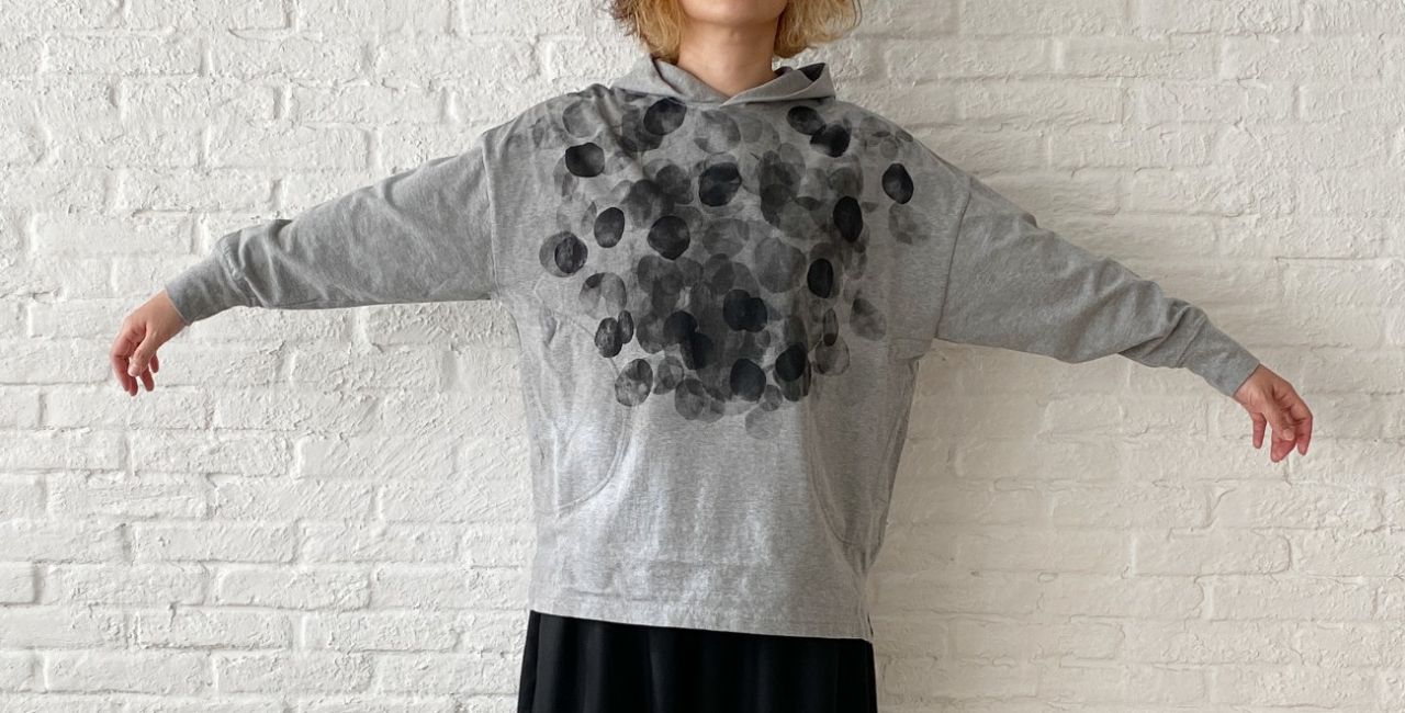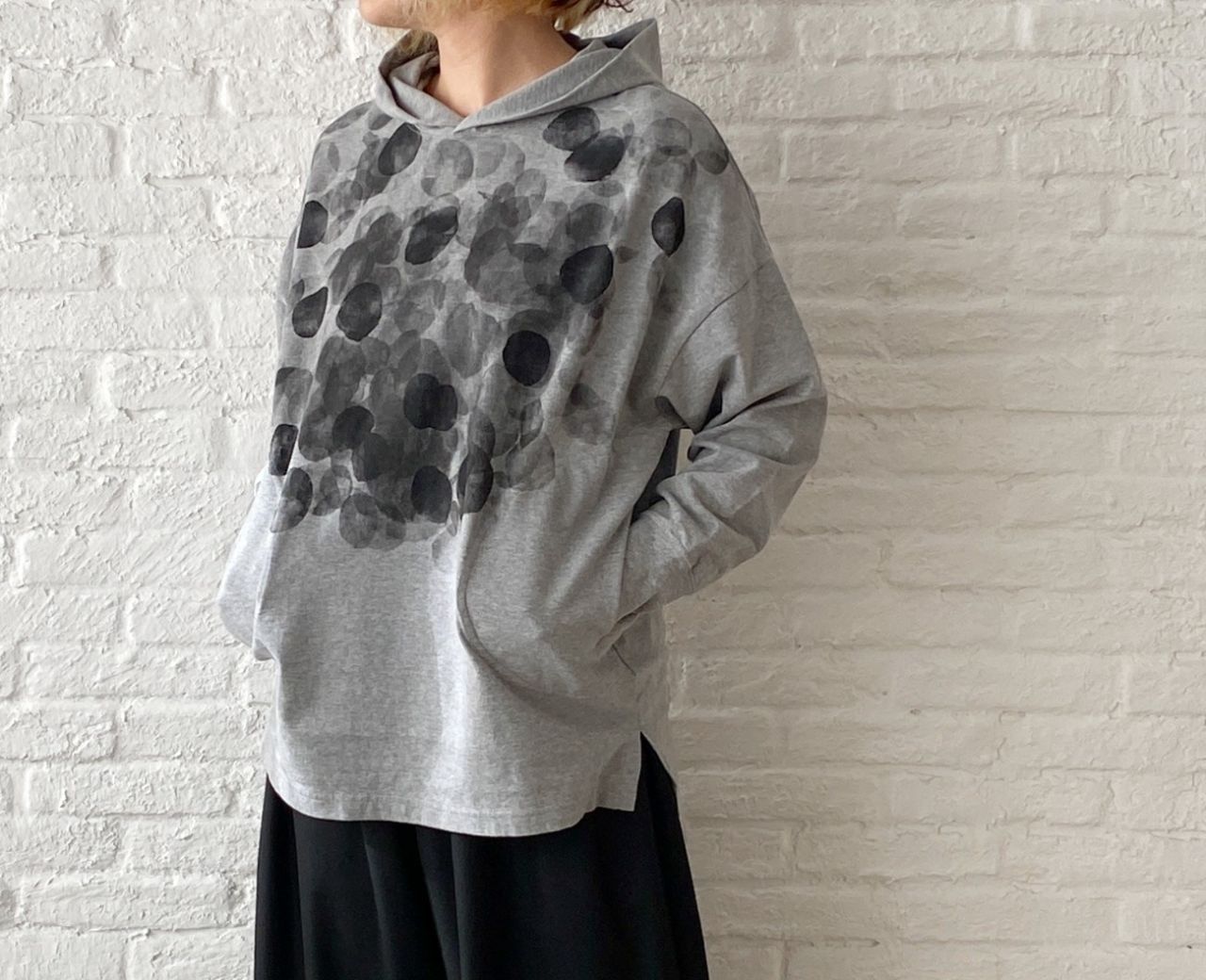 お尻を隠す着丈になりますが、長すぎないパーカープルオーバー。