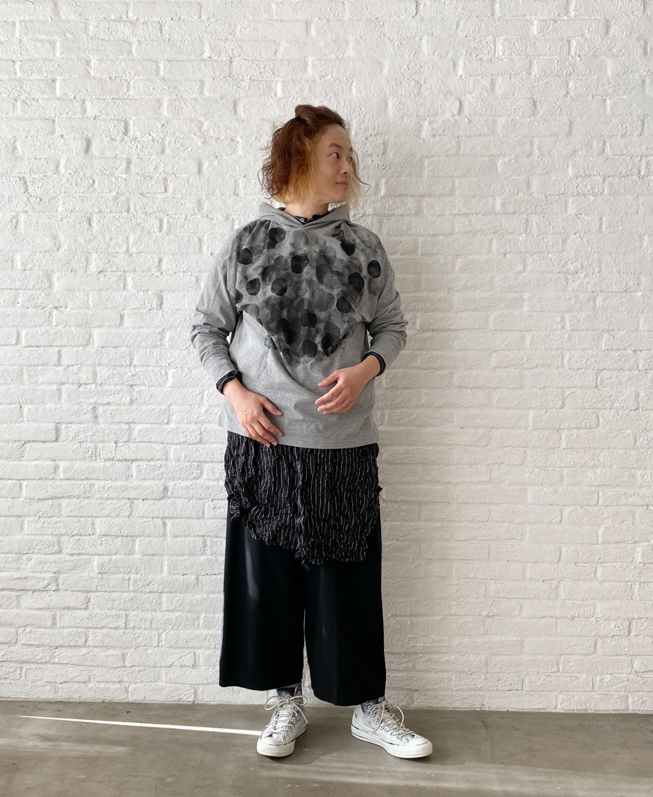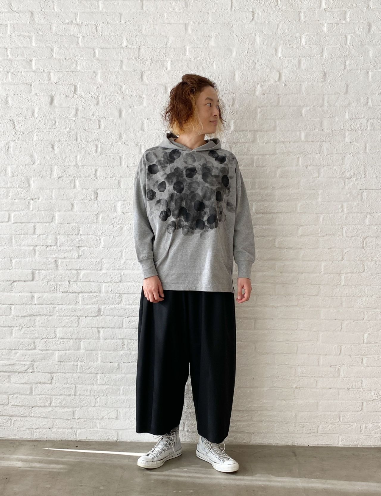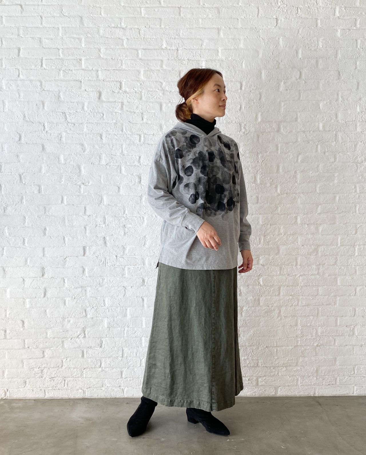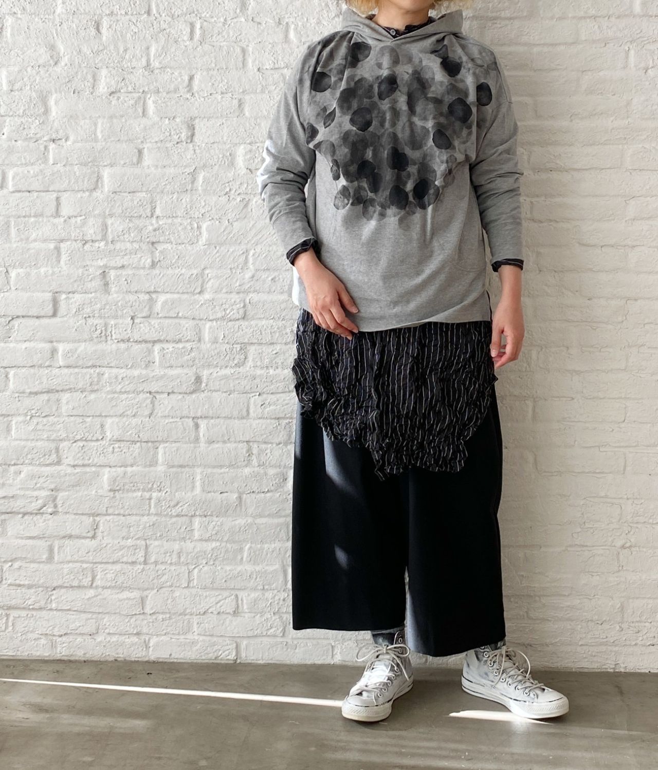 お尻を隠す着丈になりますが、長すぎないパーカープルオーバー。