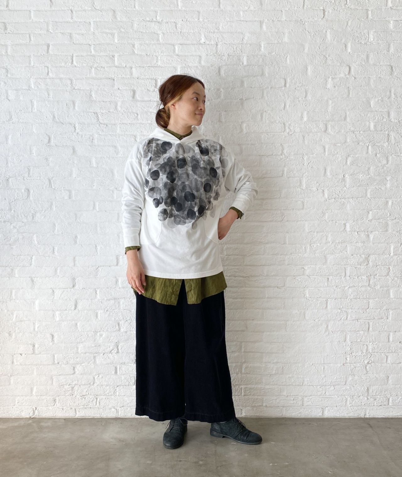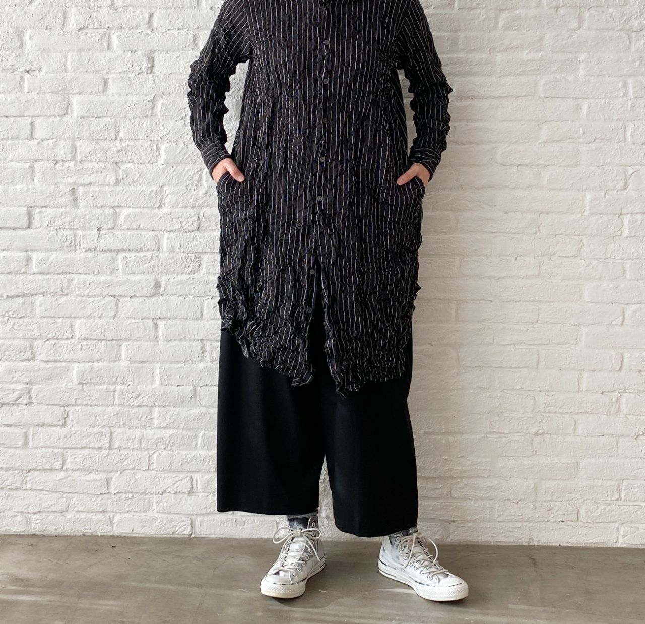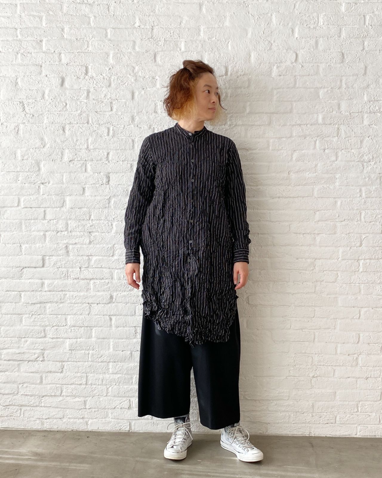 重ね着が目立ちすぎないように、パンツに合わせてクロのシャツワンピースを中に合わせました。