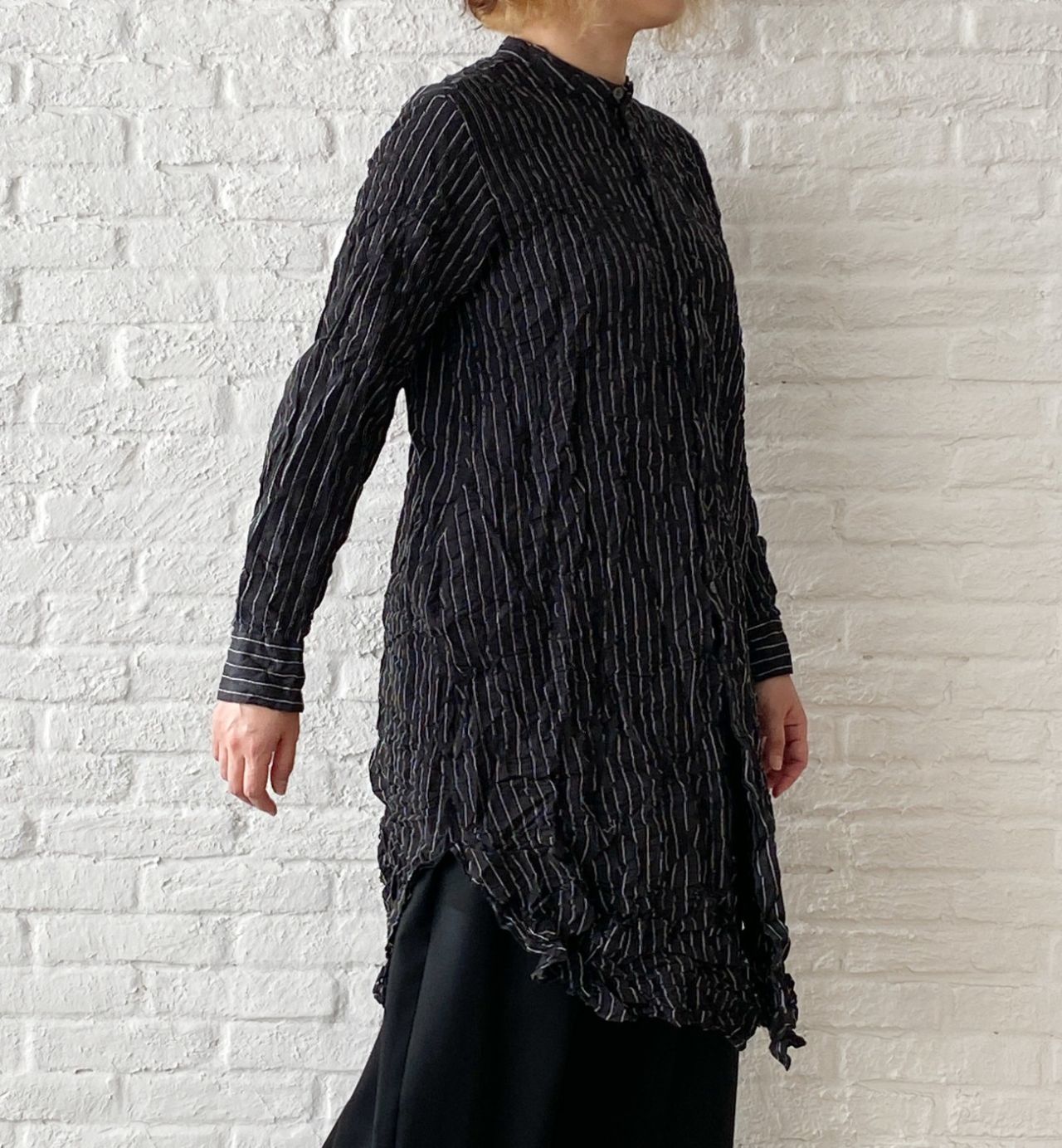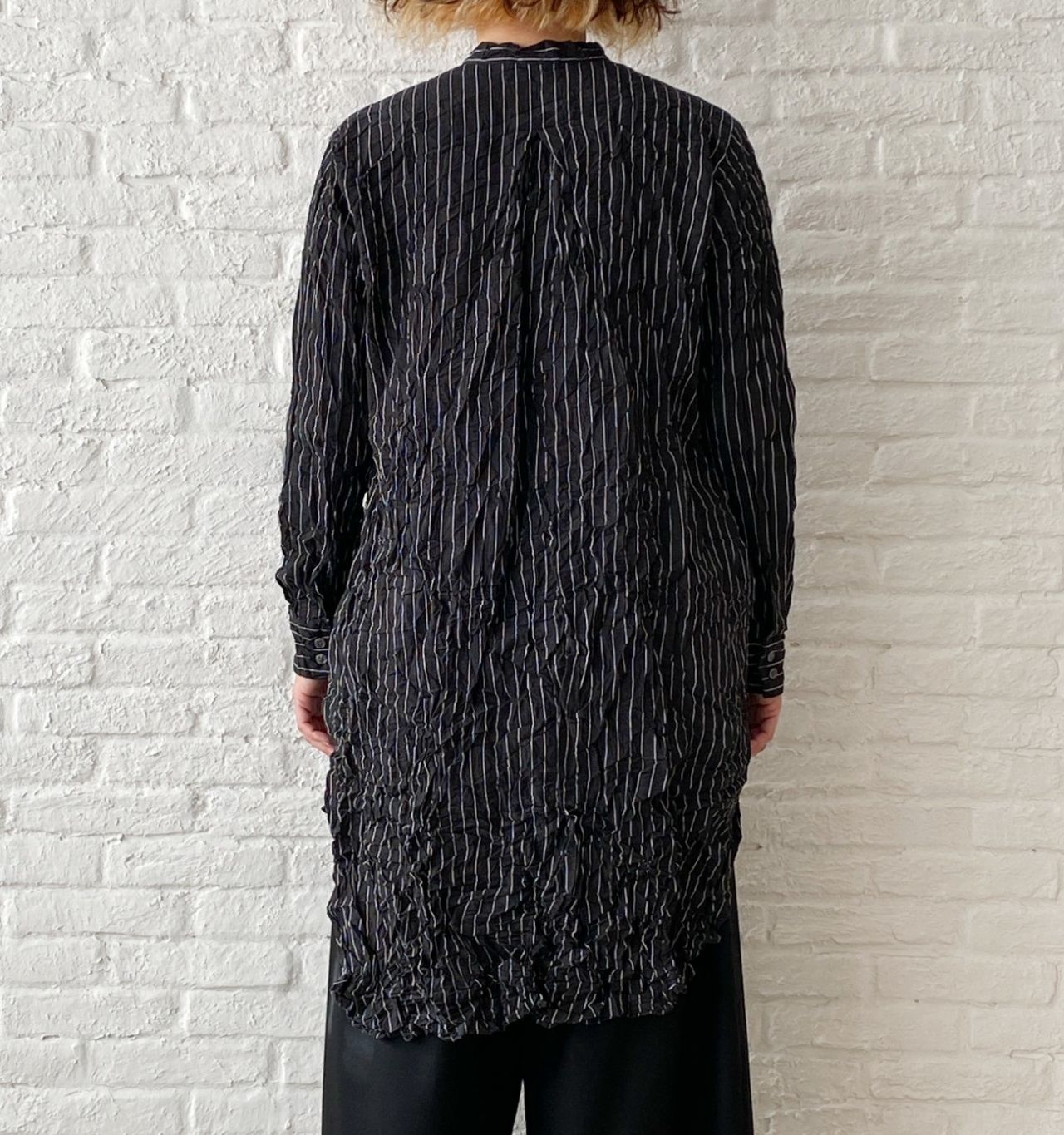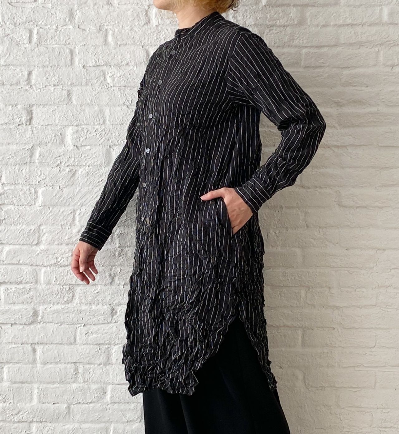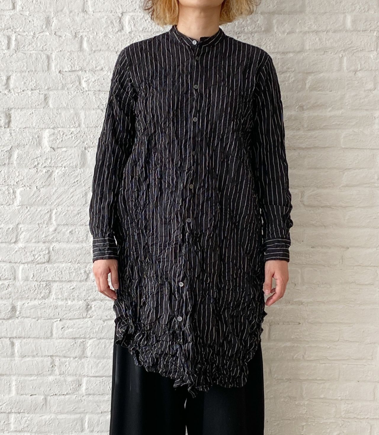 ギュッとシワのかかったシャツワンピースは、1枚で着るには短いのでパンツやスカート、ワンピースを下に合わせるのがおすすめです。