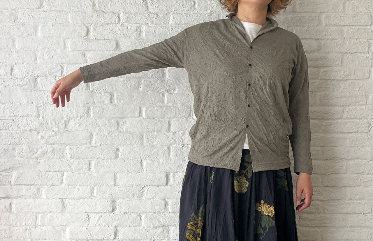 衿があるカーディガンは、前を閉めればジャケット風な印象にも。