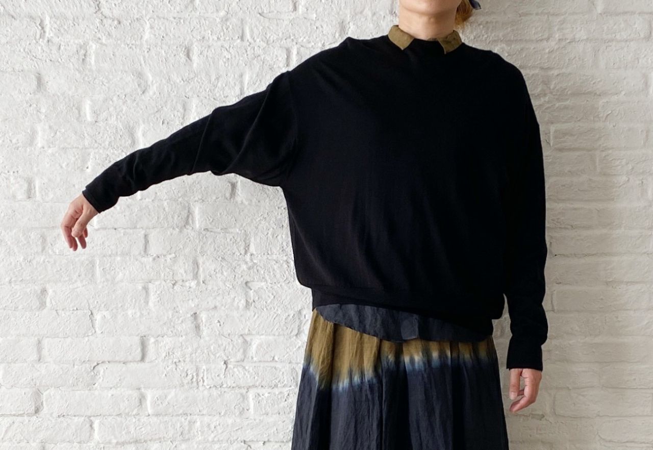 ドルマンスリーブのようにゆったりした身幅~袖ラインなので、重ね着もしやすいニットです。
