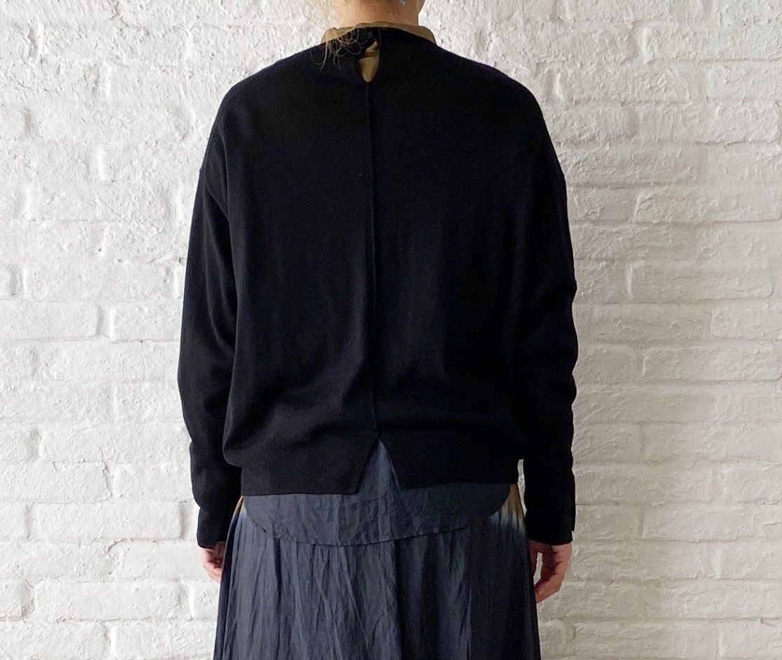 雰囲気を壊さないように、黒の丸首ニットを重ねて。
