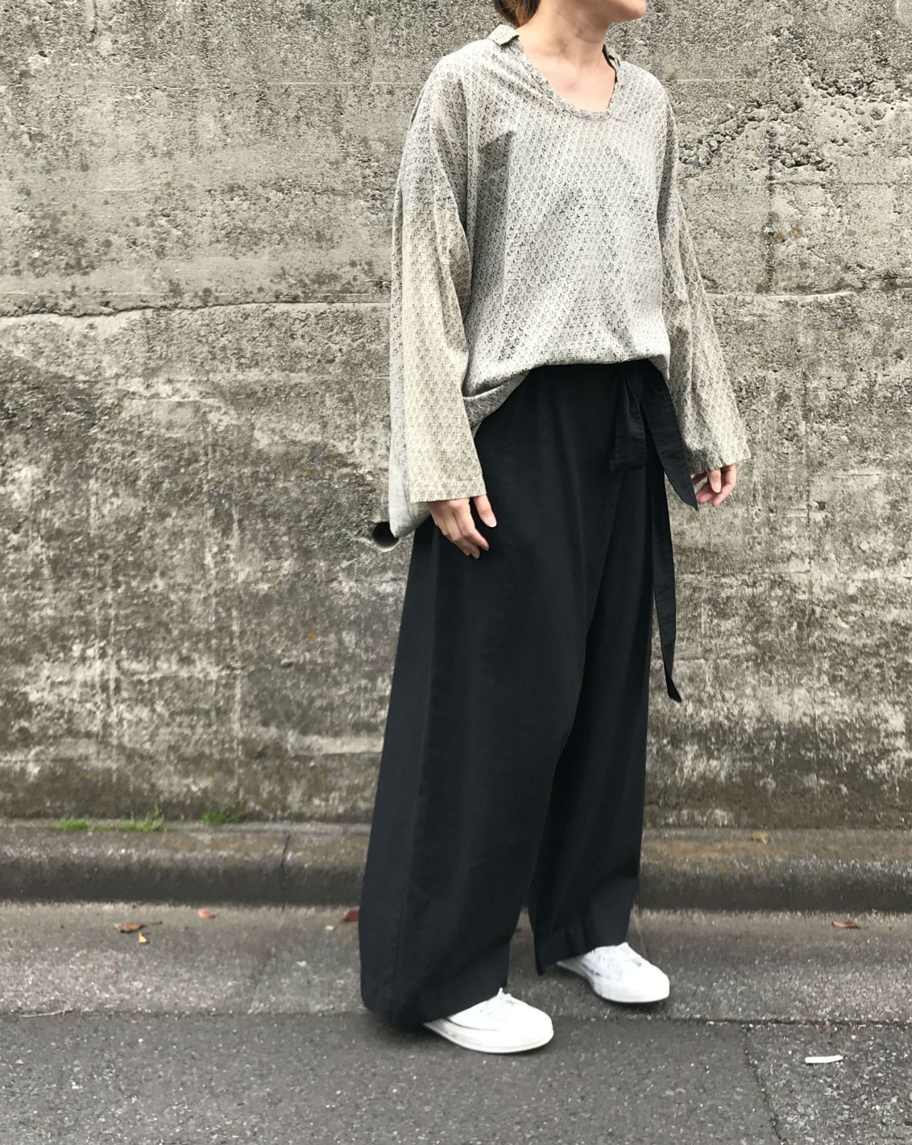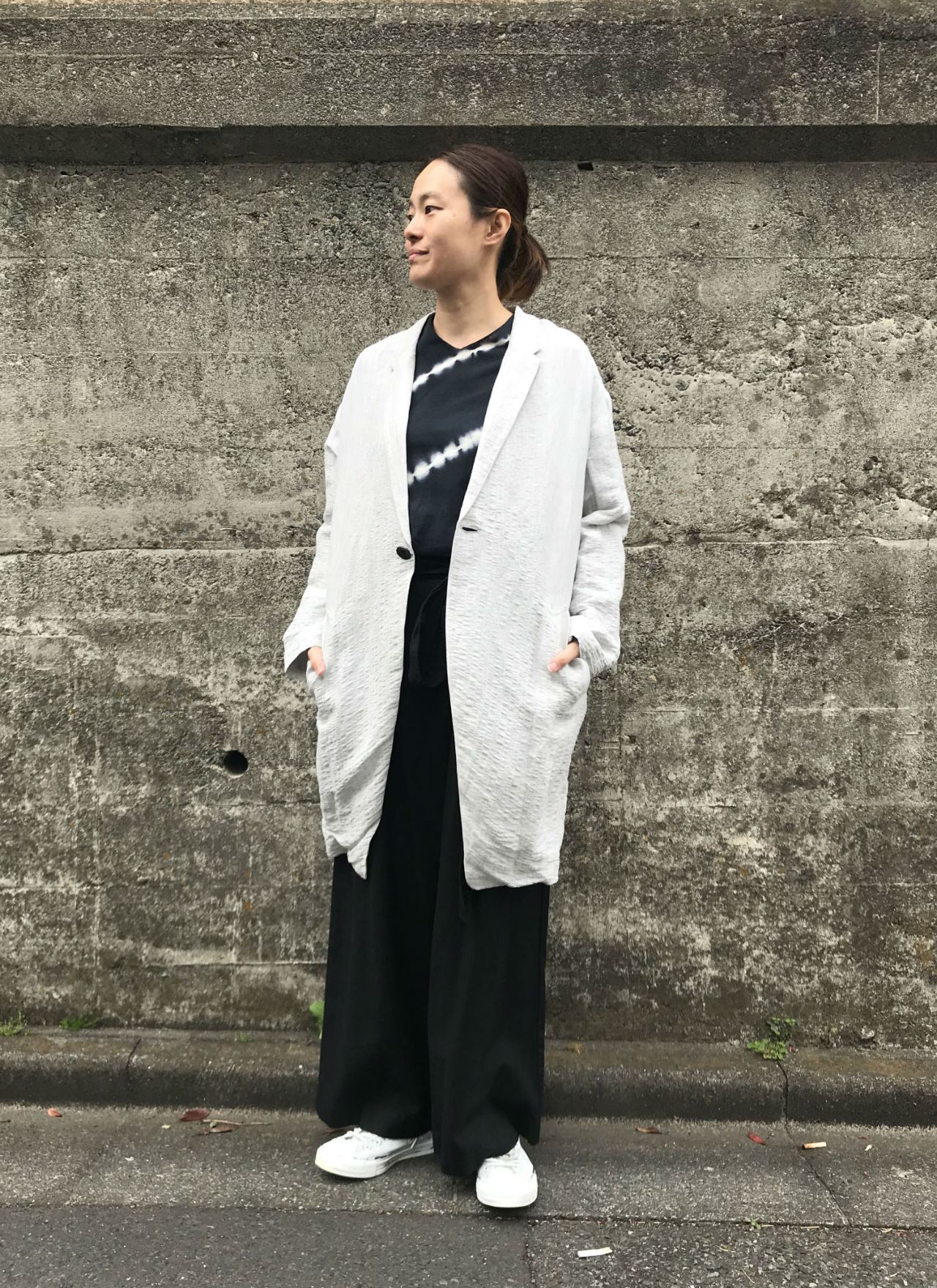 春らしさを取り入れて、ライトグレーのゆったりアウターを。