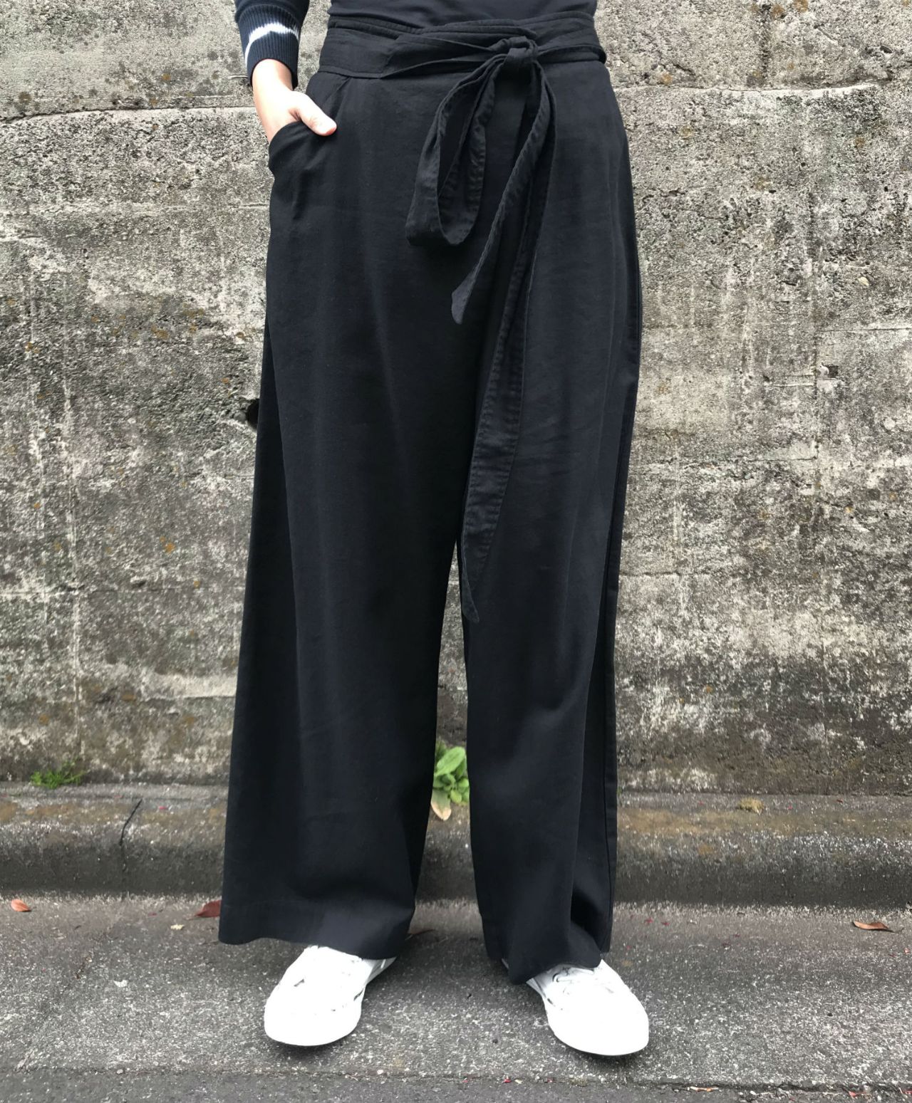 左側でリボンを結んで履くアシンメトリーなデザイン。
