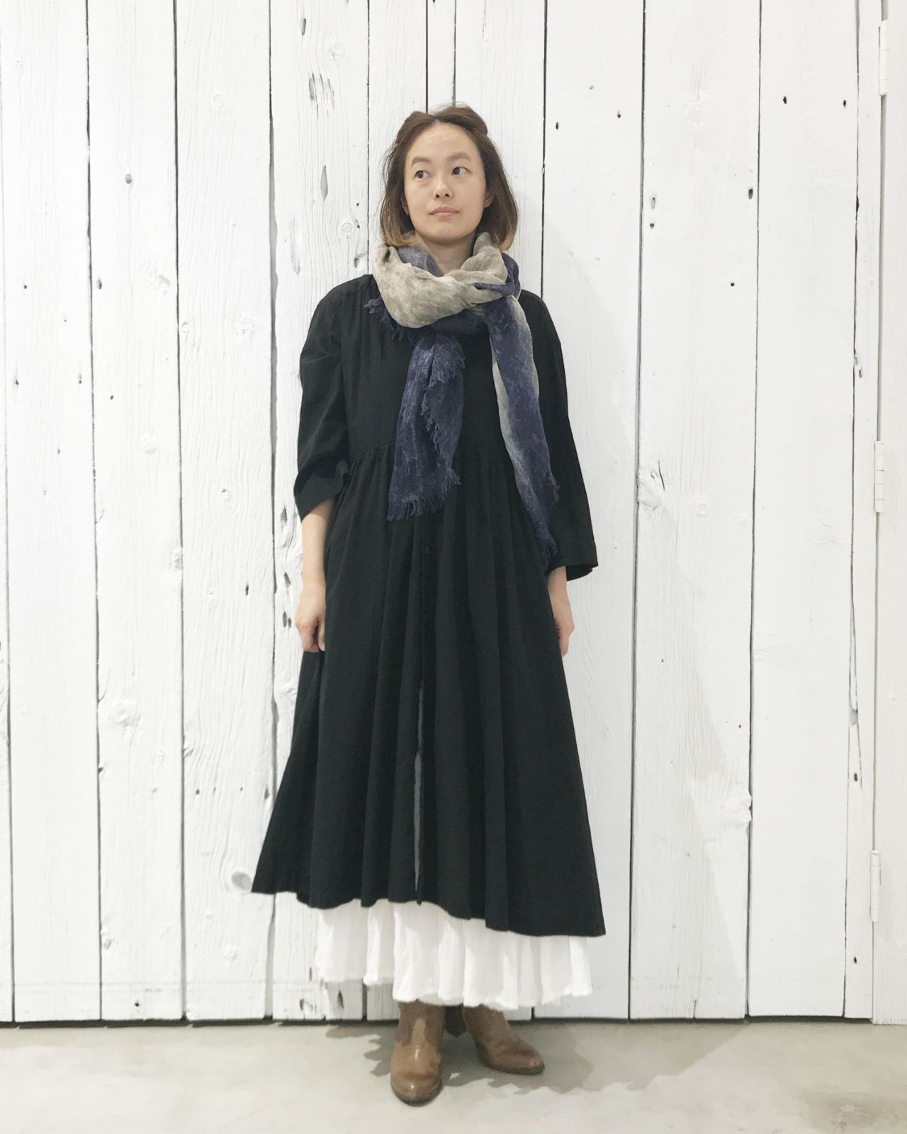 前を軽く閉めて、ストールをポイントに。