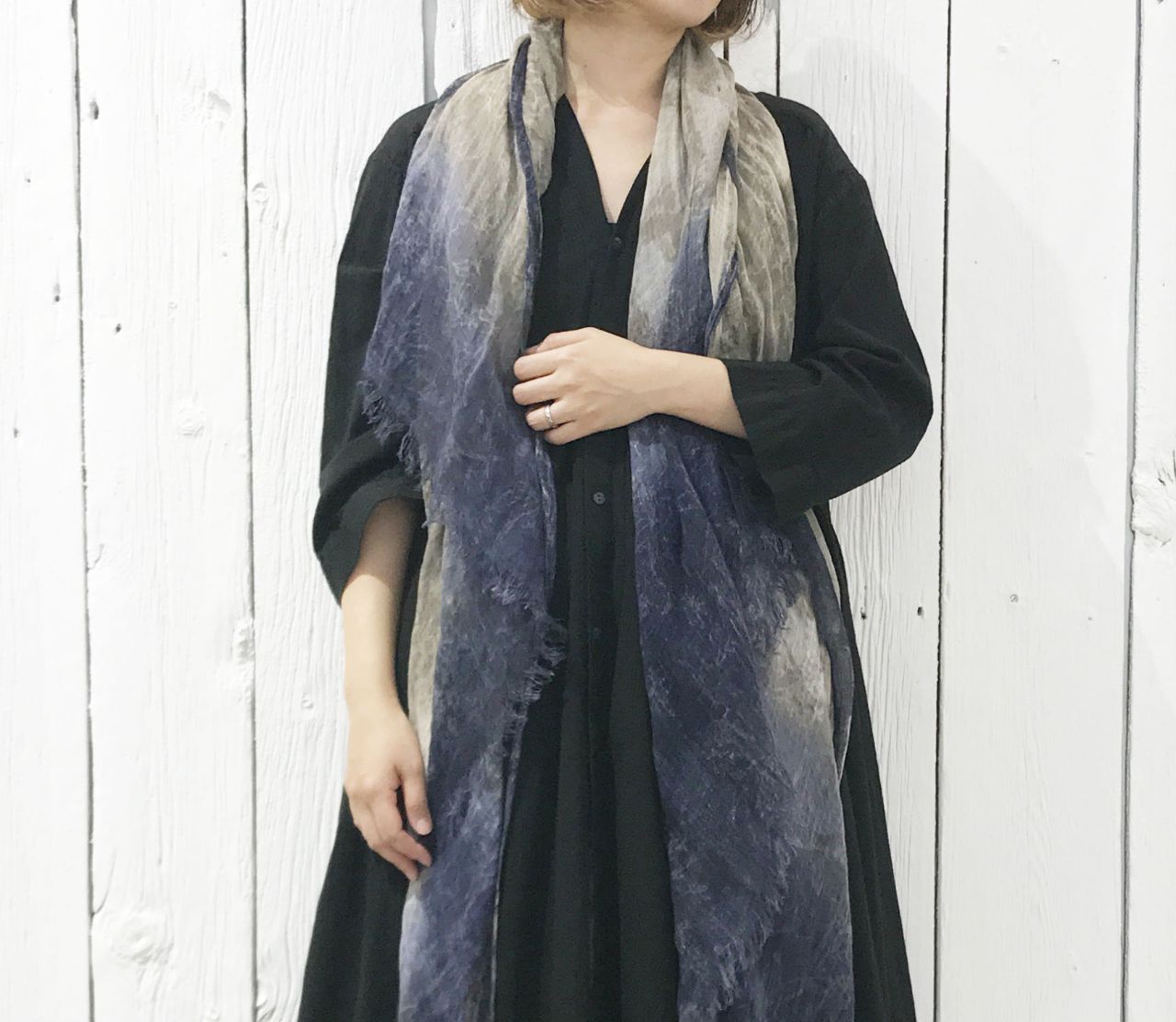 グラデーションプリントが良いアクセントになるストールです。