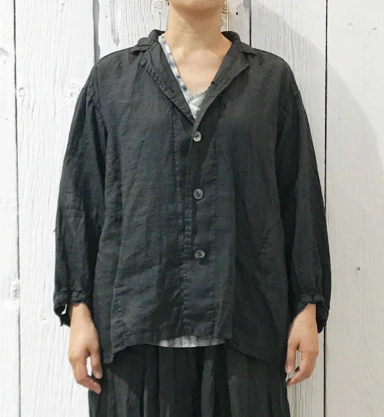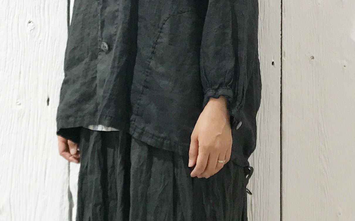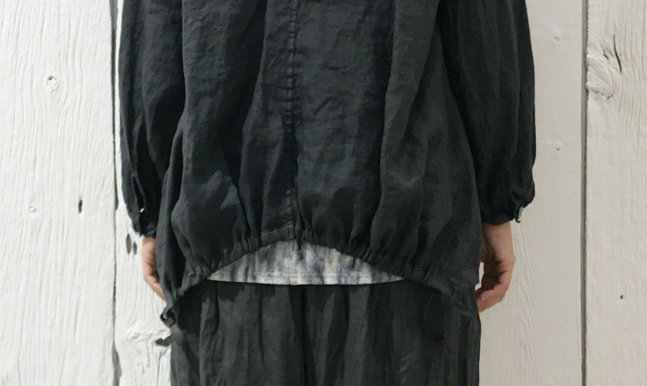 袖口にギャザーが寄っていたり、ラウンドを描いた後ろ裾など全体的にゆったり。