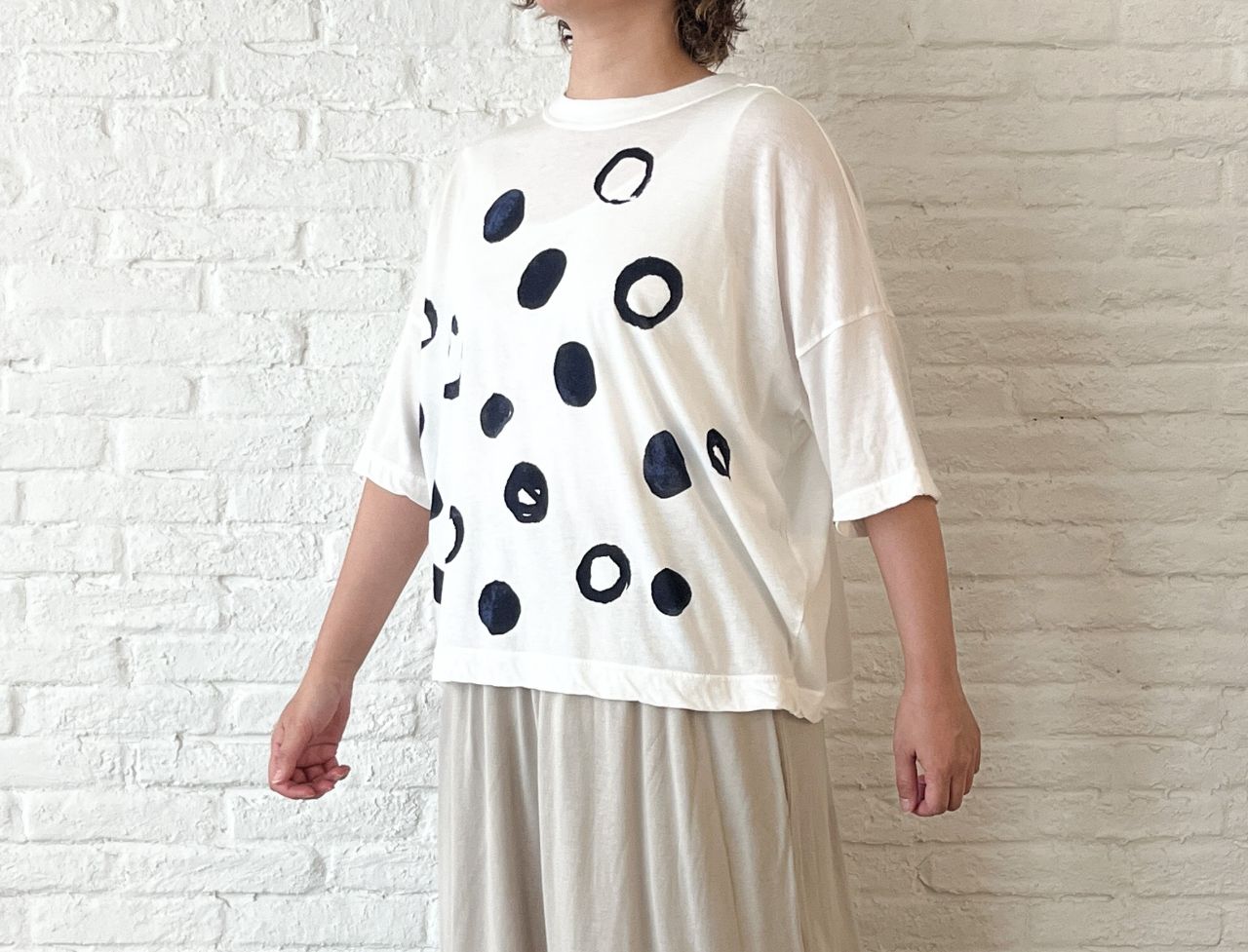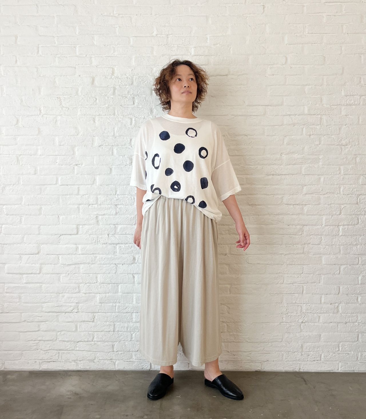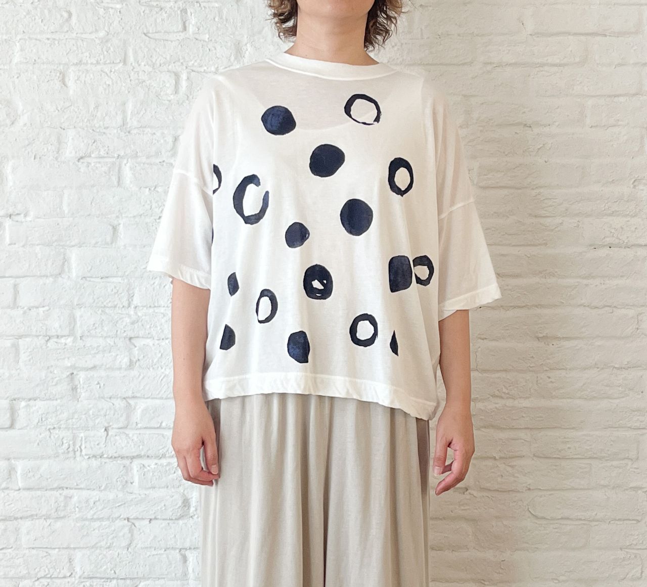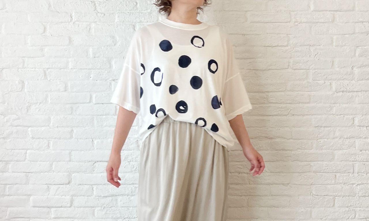 不揃いで大きめな丸は、和のテイストを感じる落ち着いたプルオーバーです。