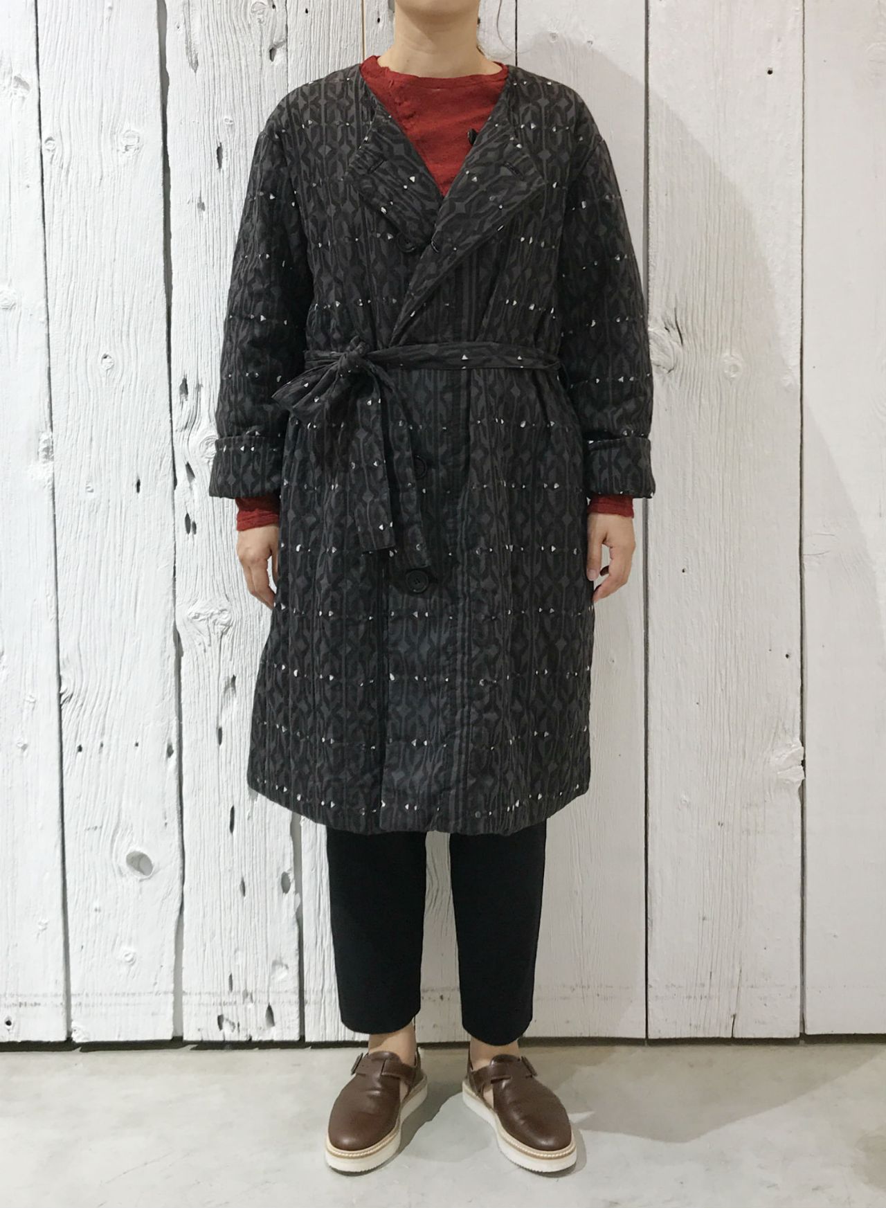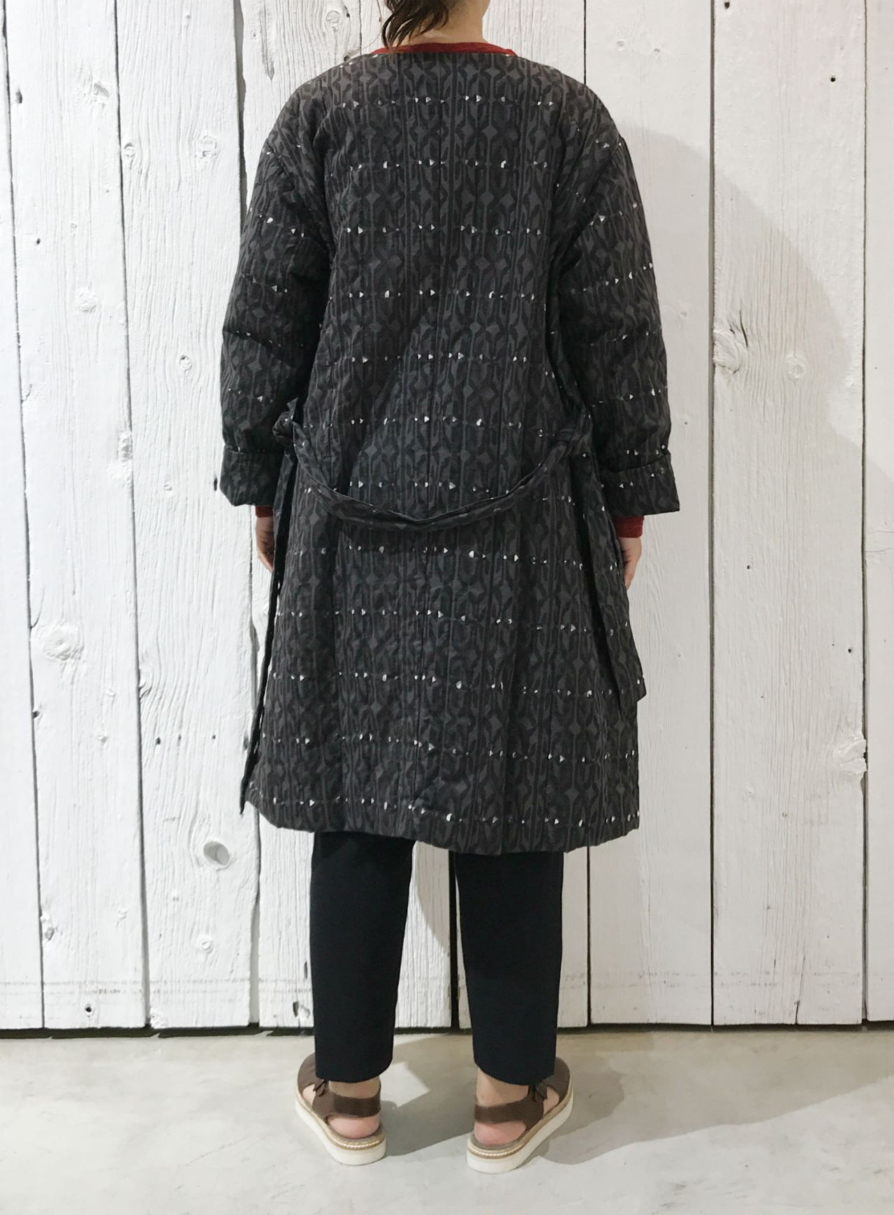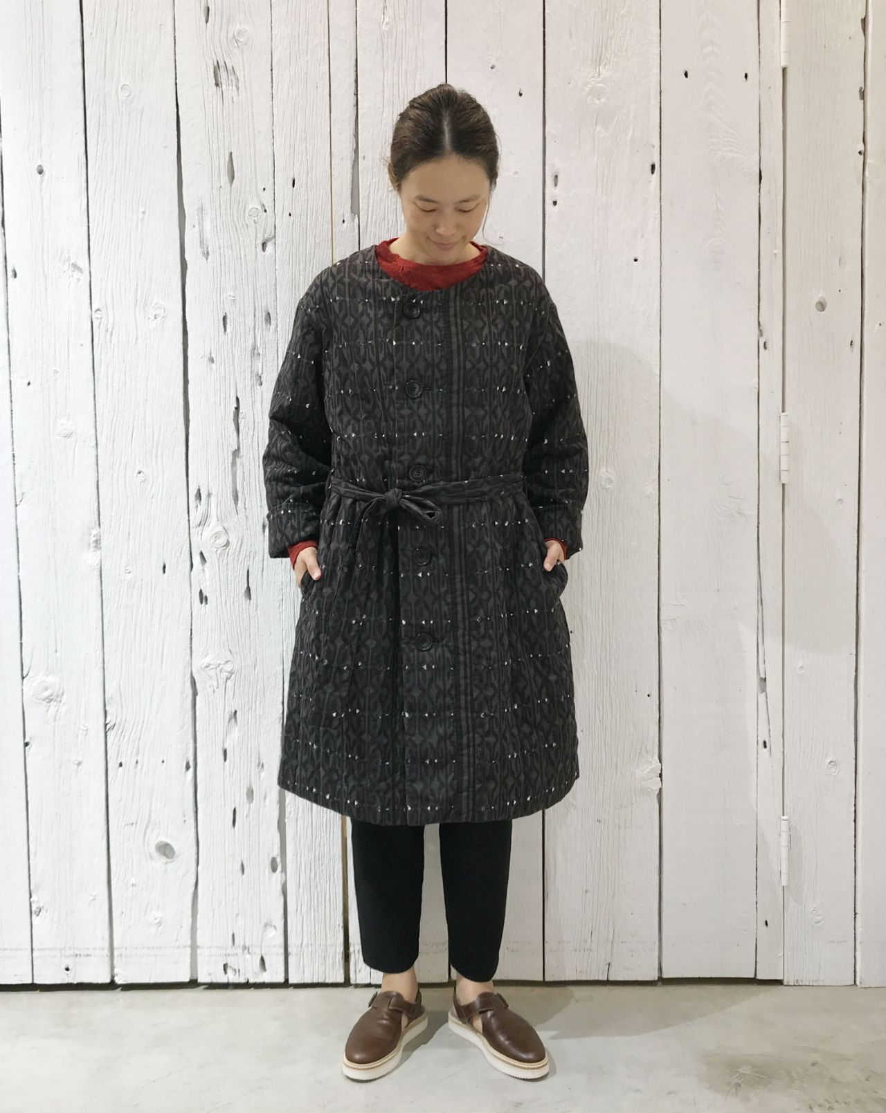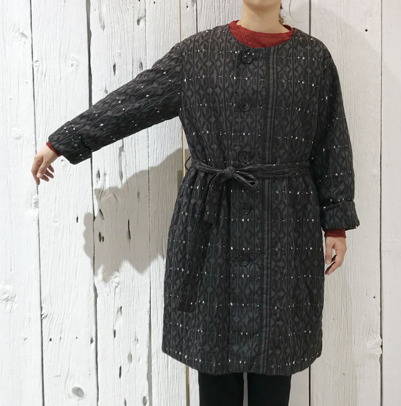 幾何学のブロックプリント生地に薄綿シートを入れて、タテラインのステッチ加工でキルト。