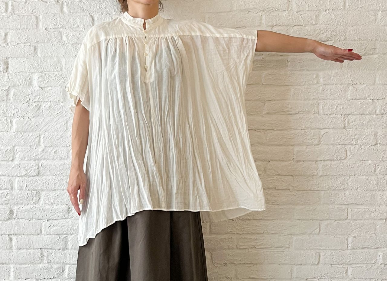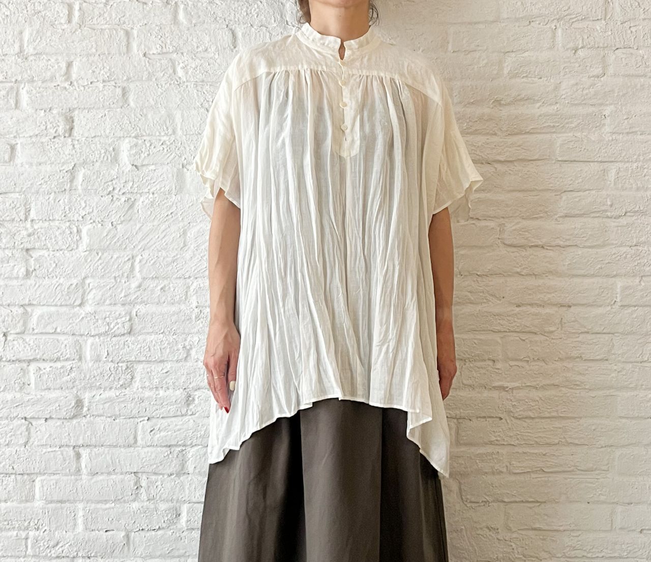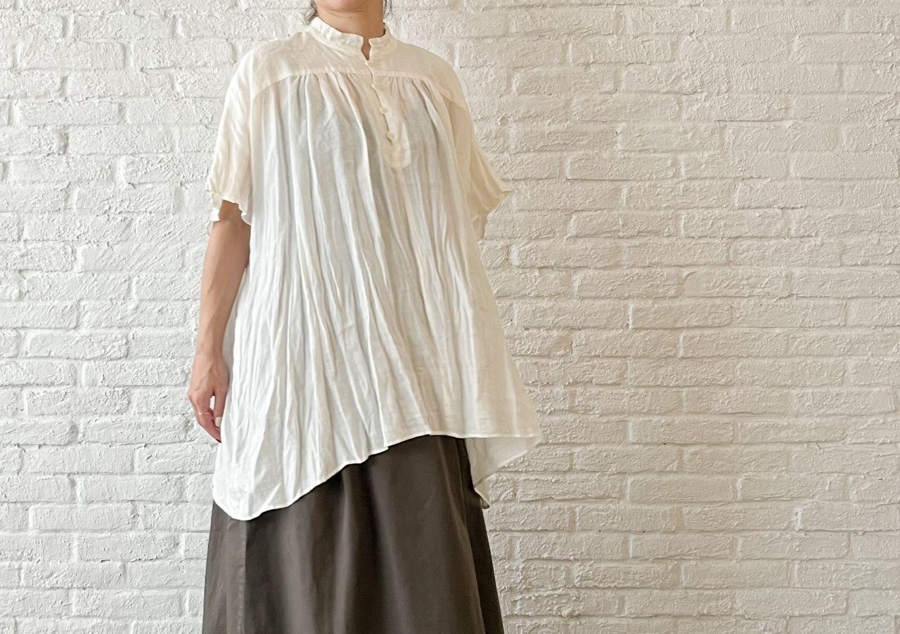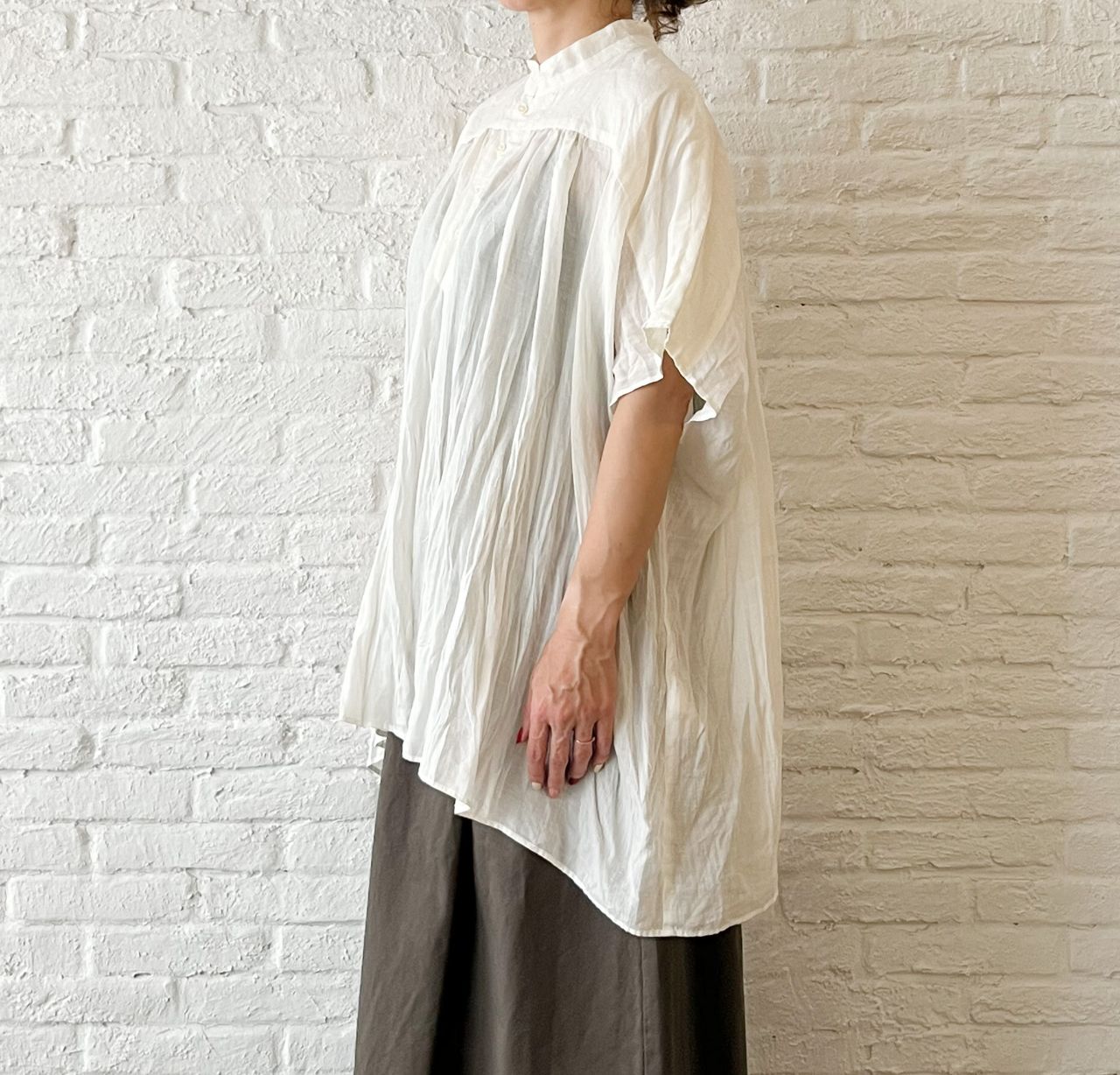 広げると四角くゆったりとしたブラウスに、しわ加工。