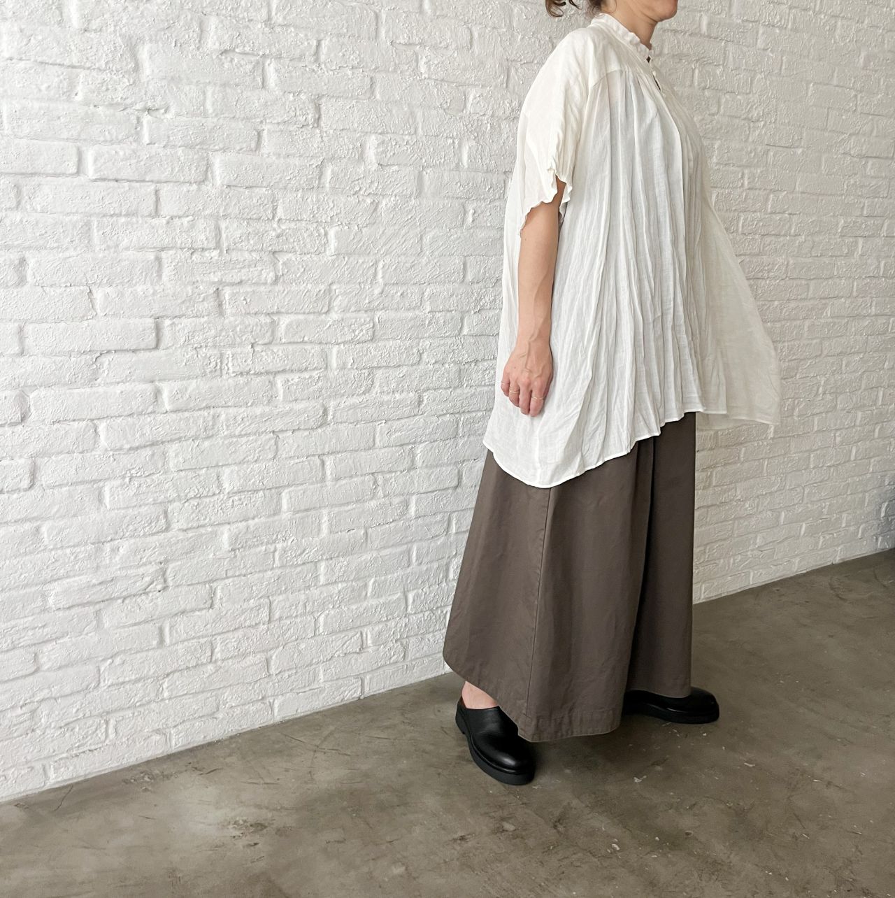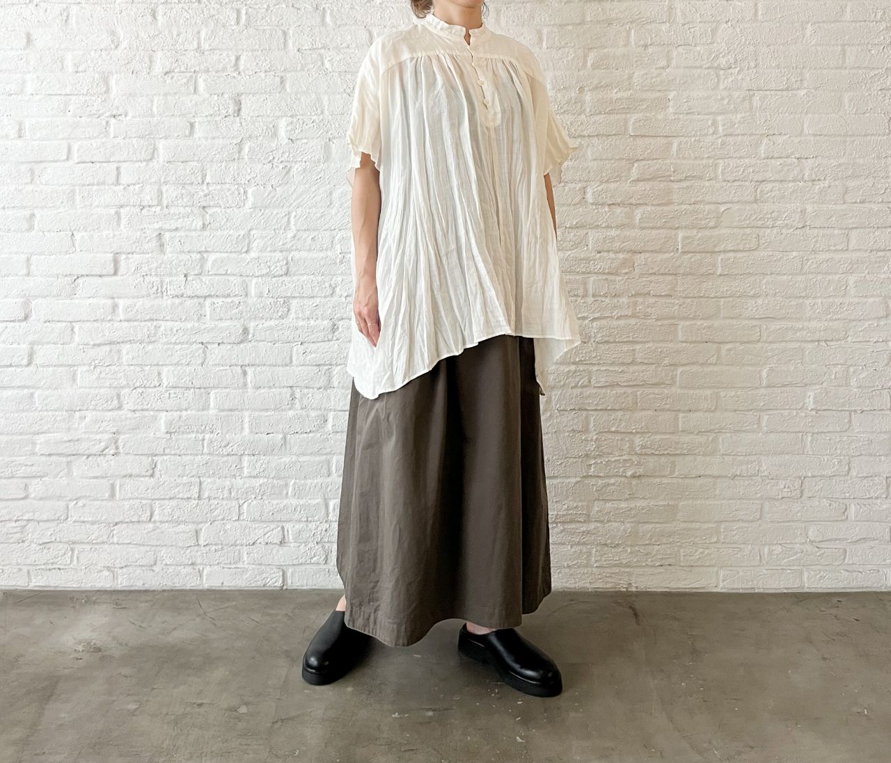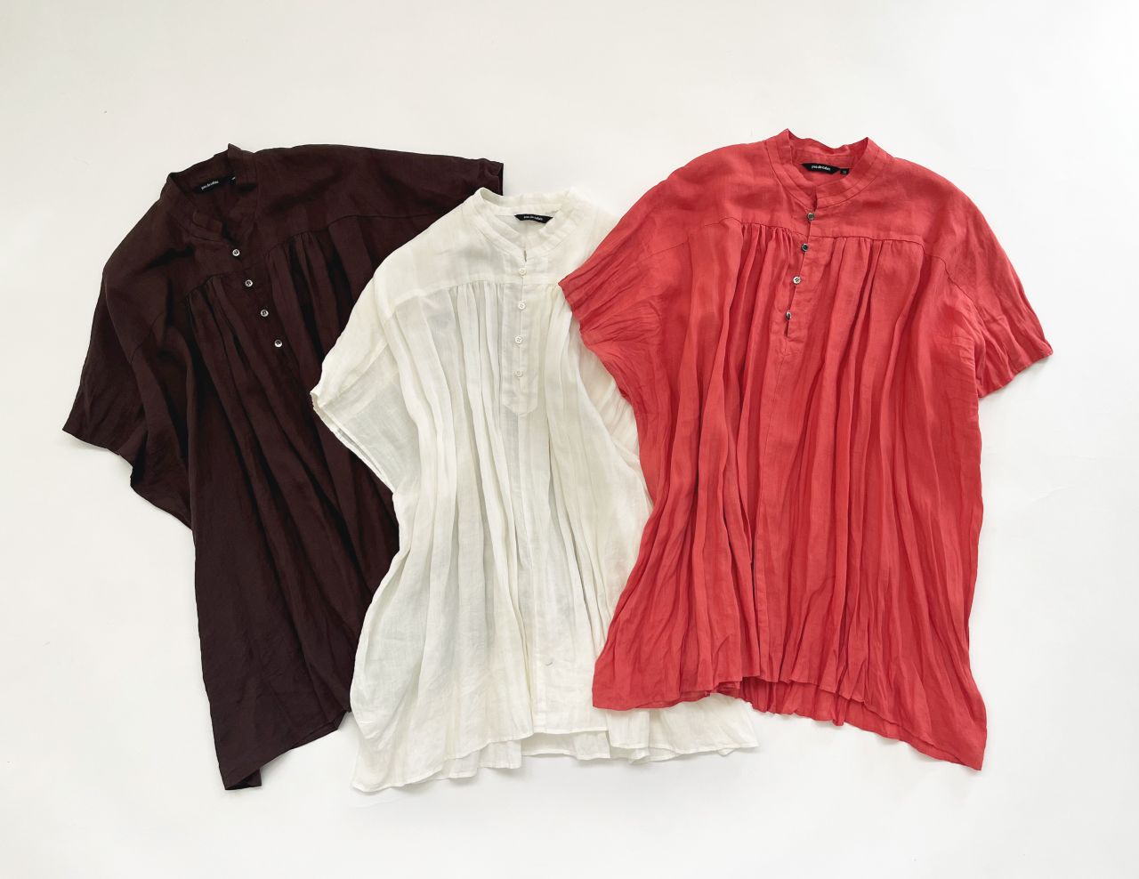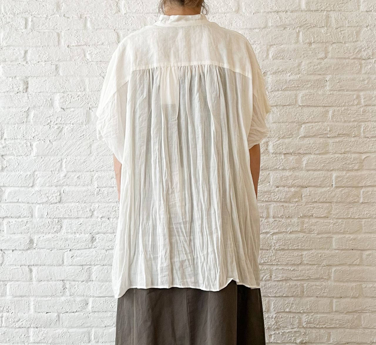 広げると四角くゆったりとしたブラウスに、しわ加工。