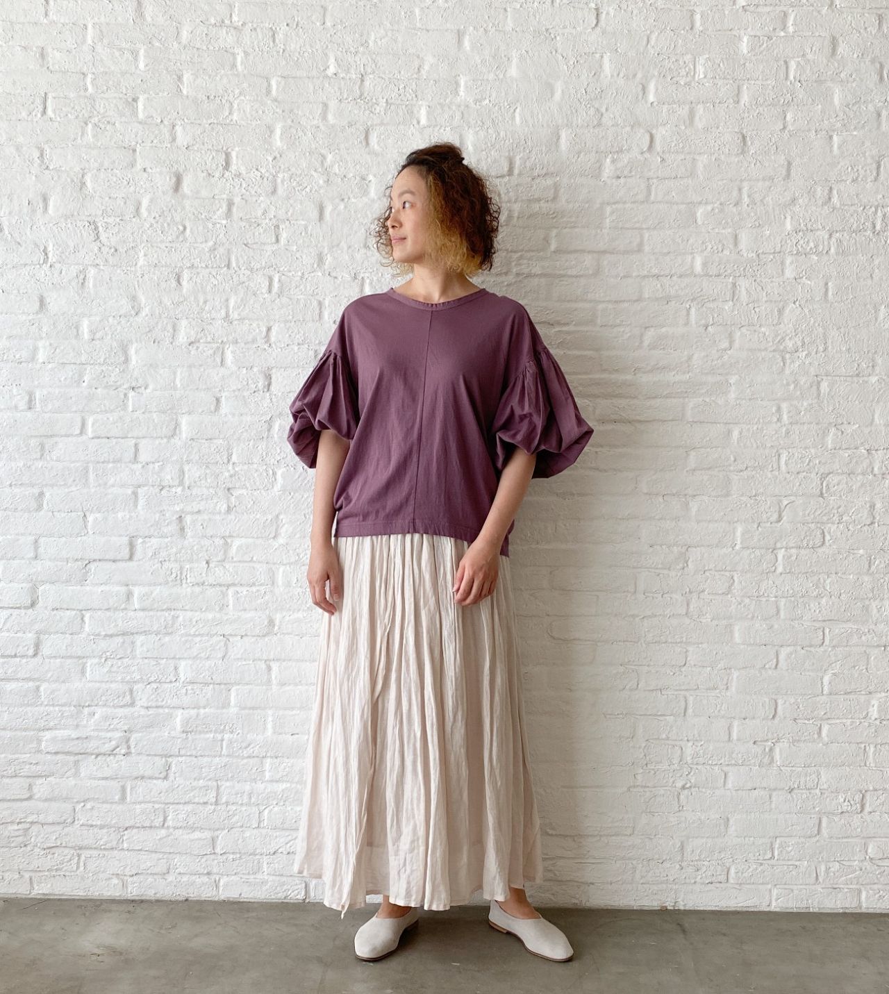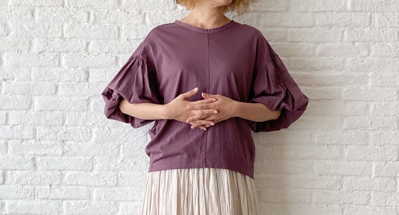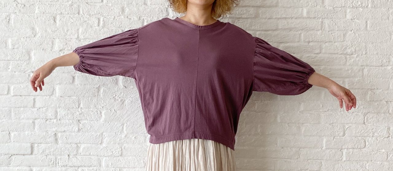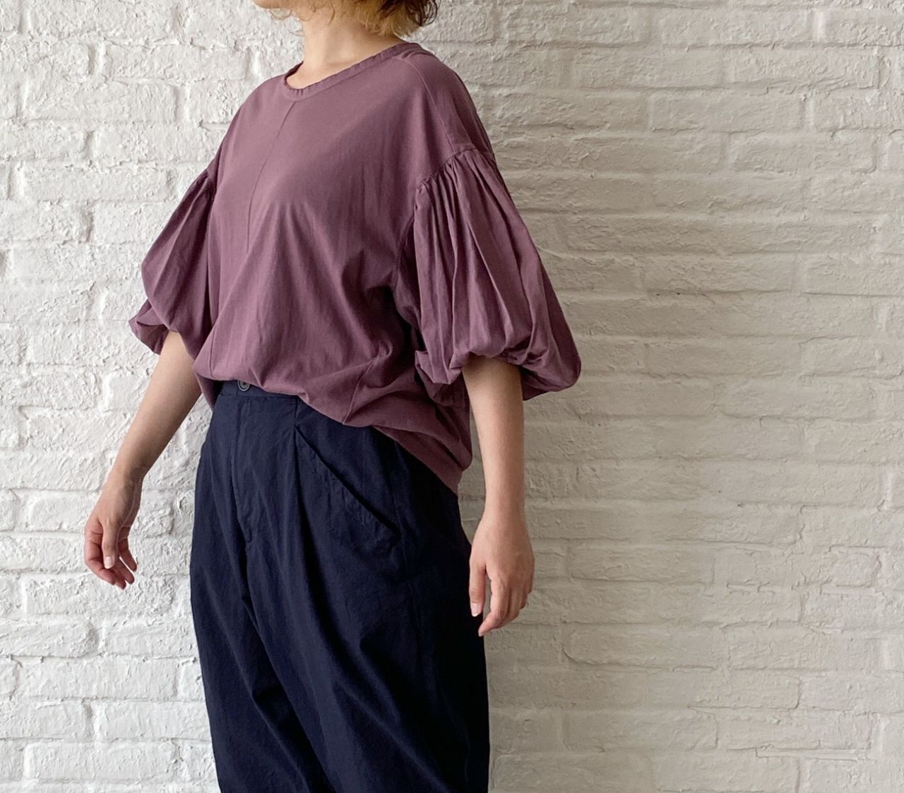 袖口のゴムを肘まで上げて五分袖にすると、よりふんわり感が出るシルエットに。