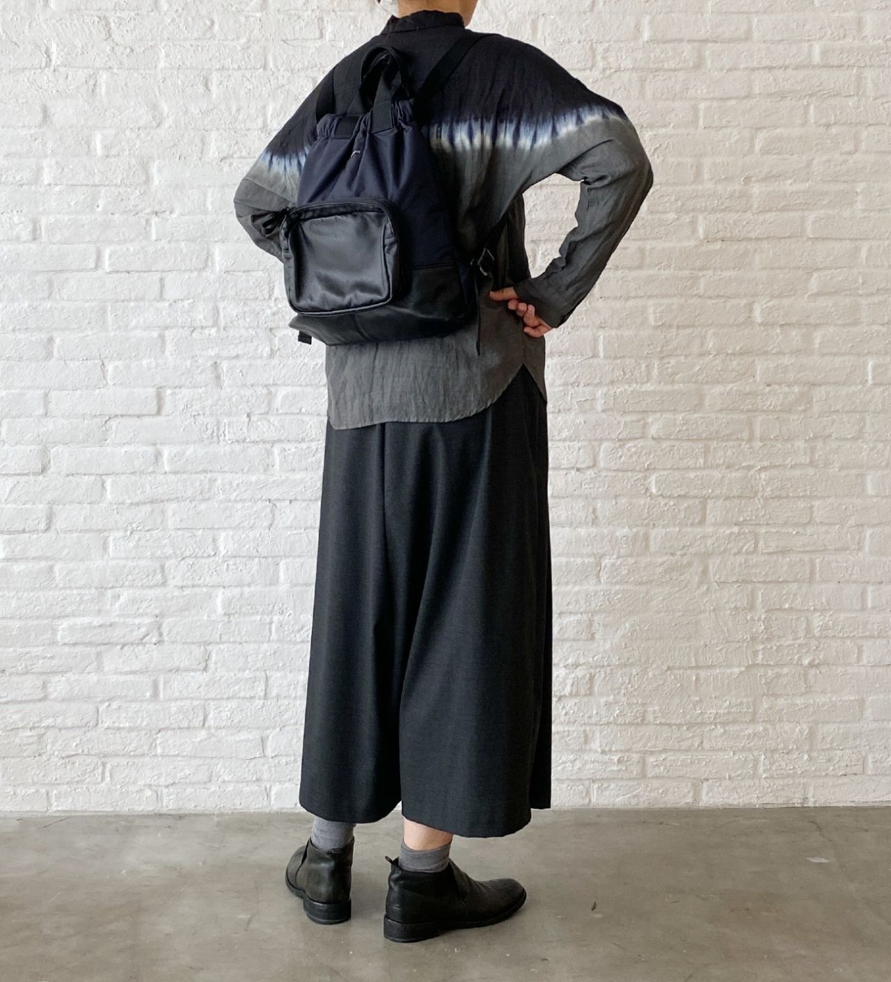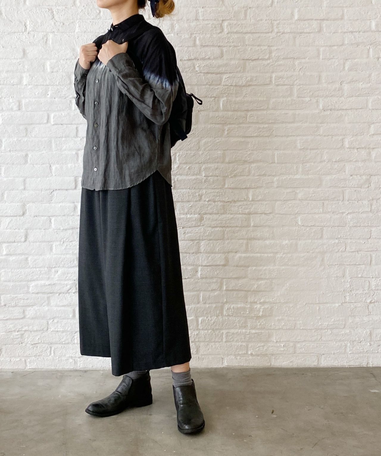 クロ×カーキの絞り染めで、グレーやデニム、カーキ・クロ・ホワイトと好相性です。