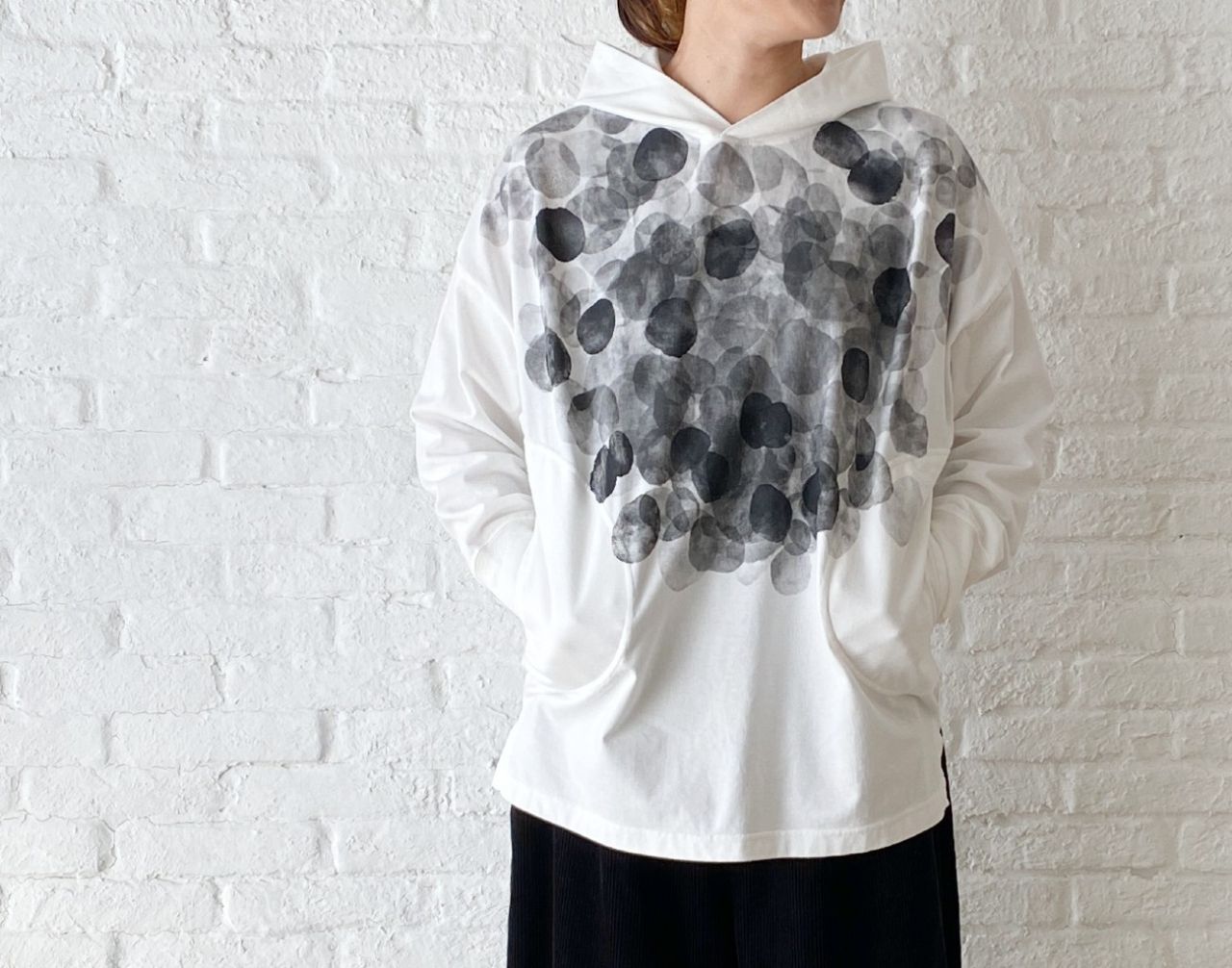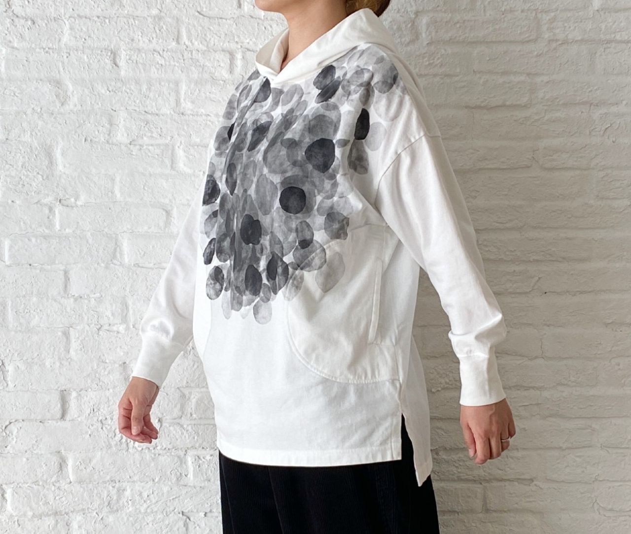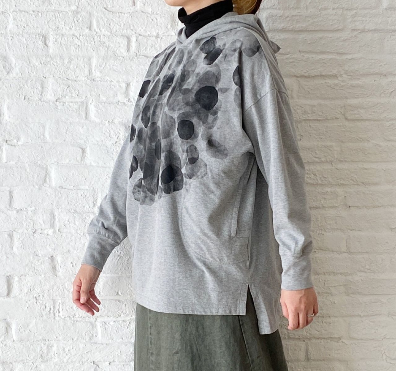 パーカープルオーバーのロング丈。後ろが長くなっています。