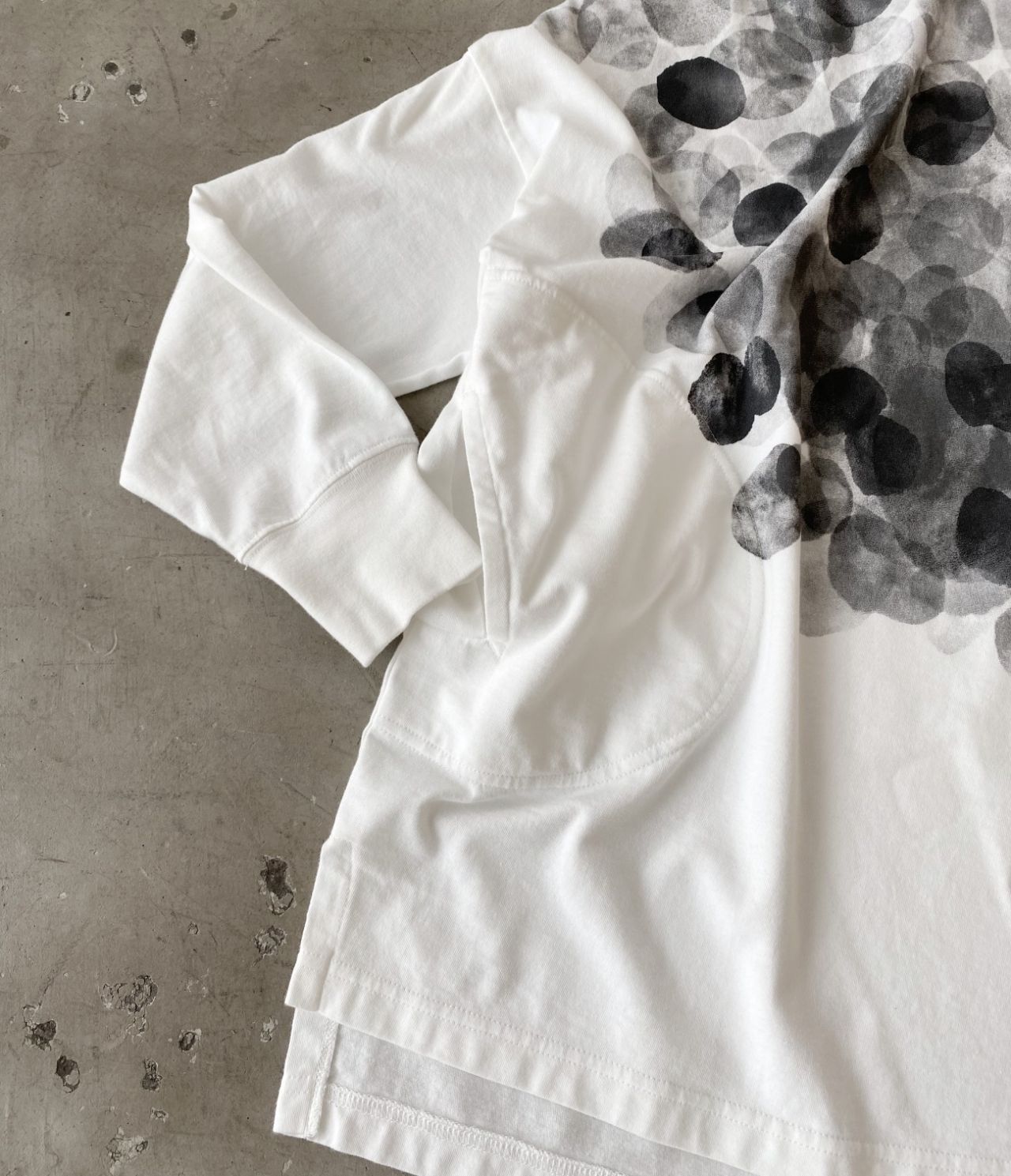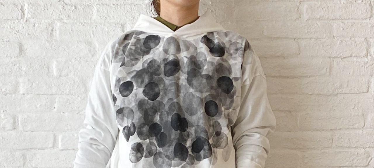 泡が噴出したようなドット柄を、胸元にグラデーションプリントしました。