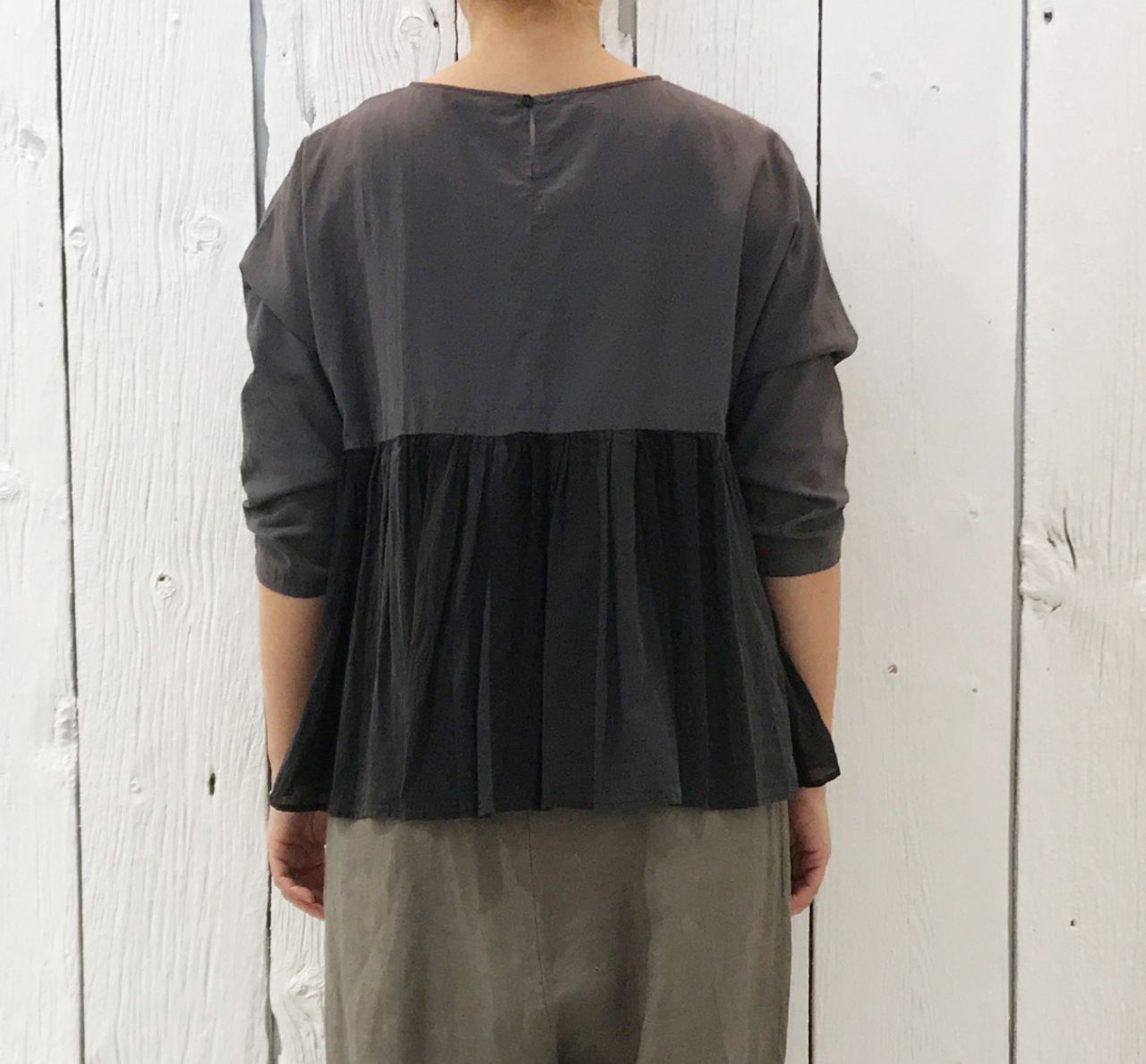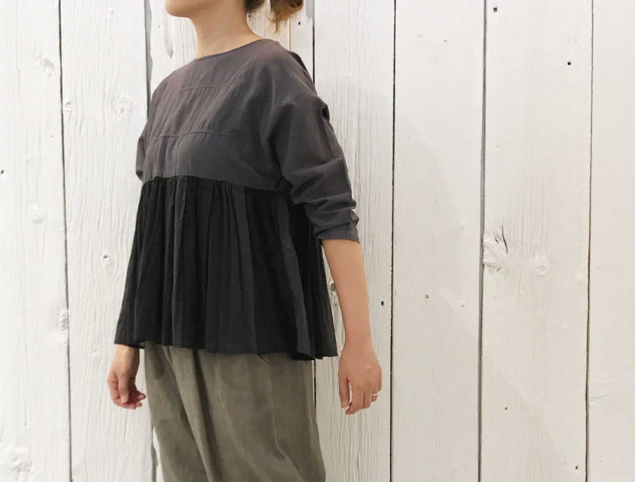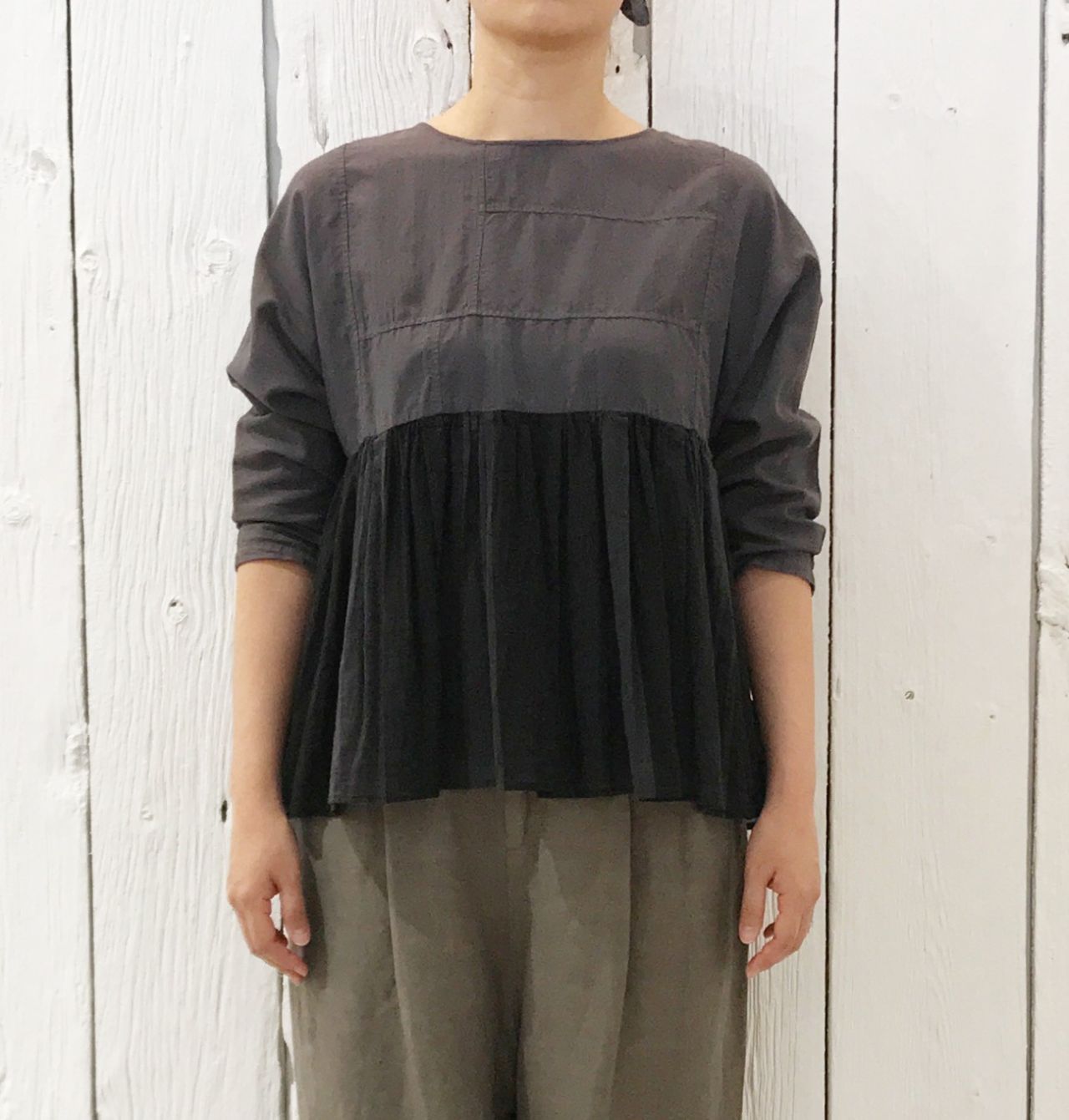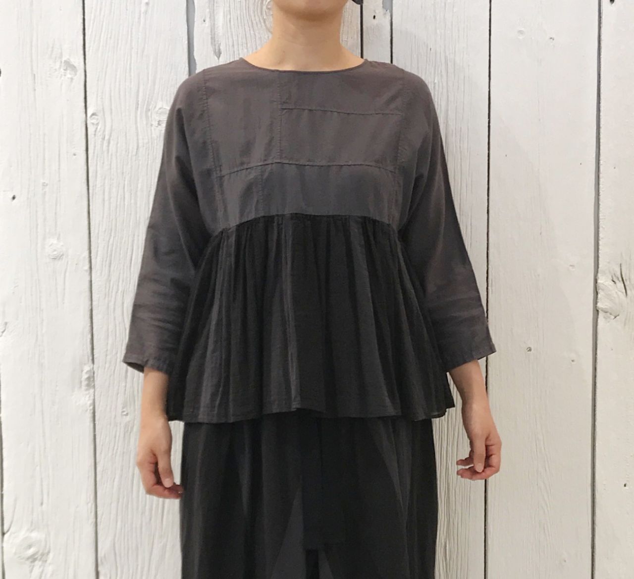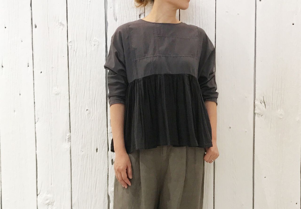 無地部分はパッチワークのような切替えがあり、胸下にはボーダー柄の向きをストライプ使いにしてボリューム感を出したデザインです。