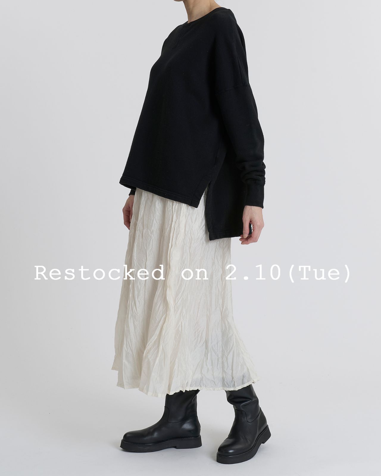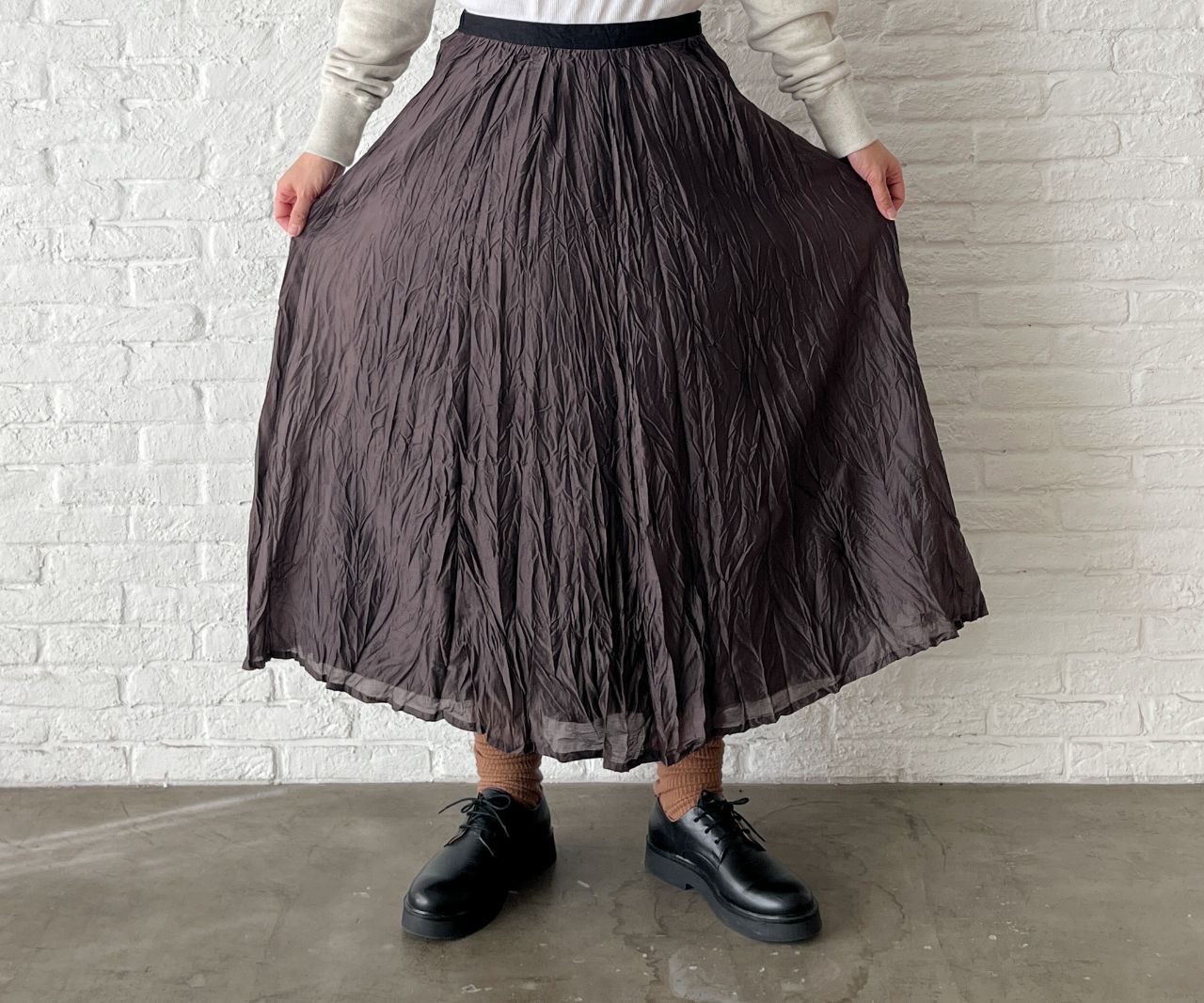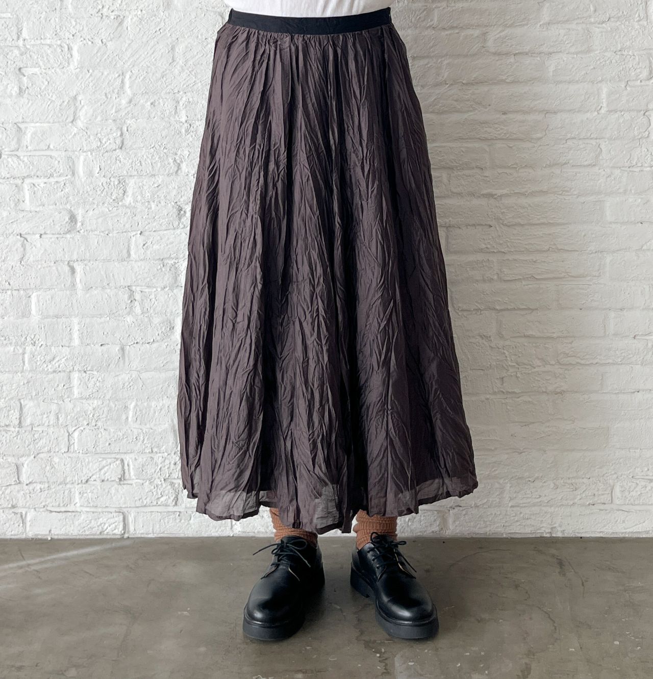 着心地も軽い、立体的なシワがポイントのロングスカート。