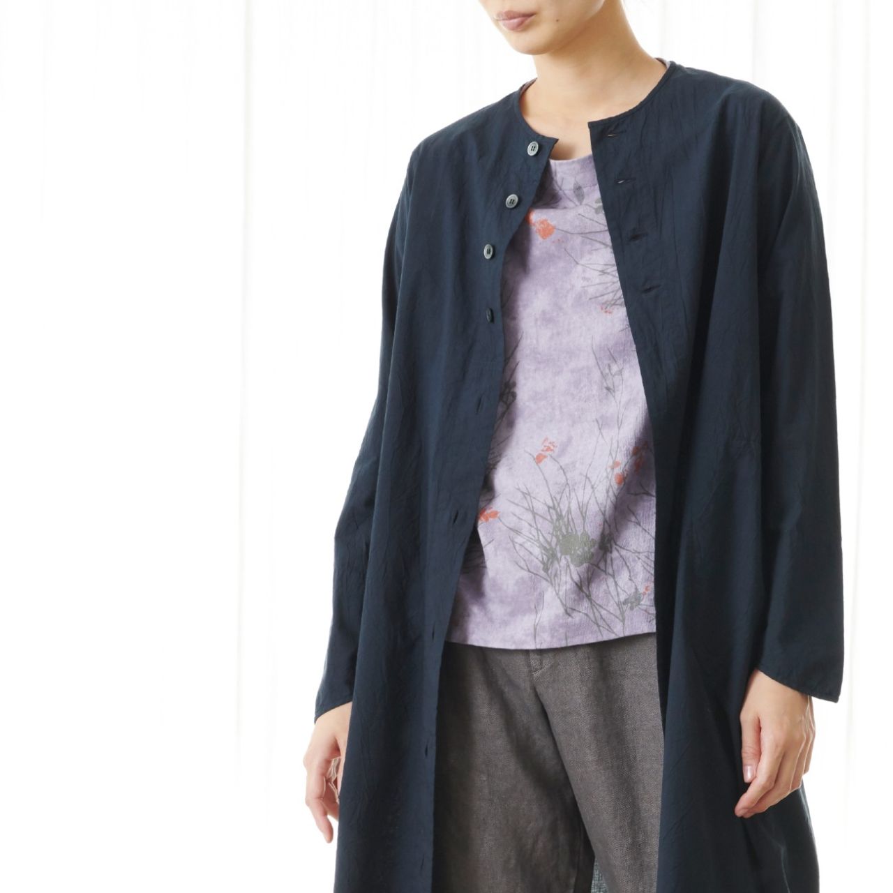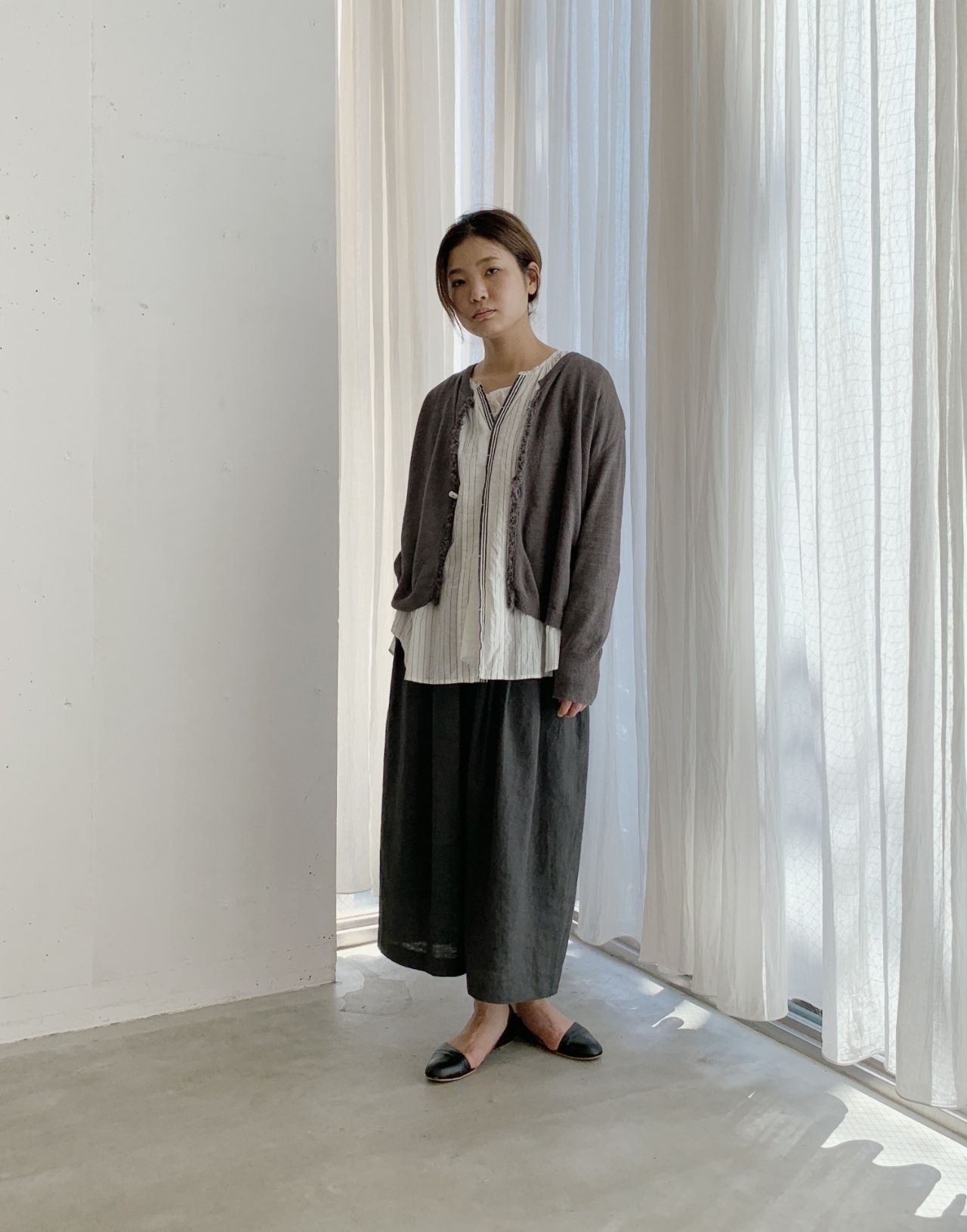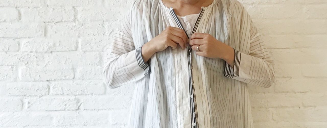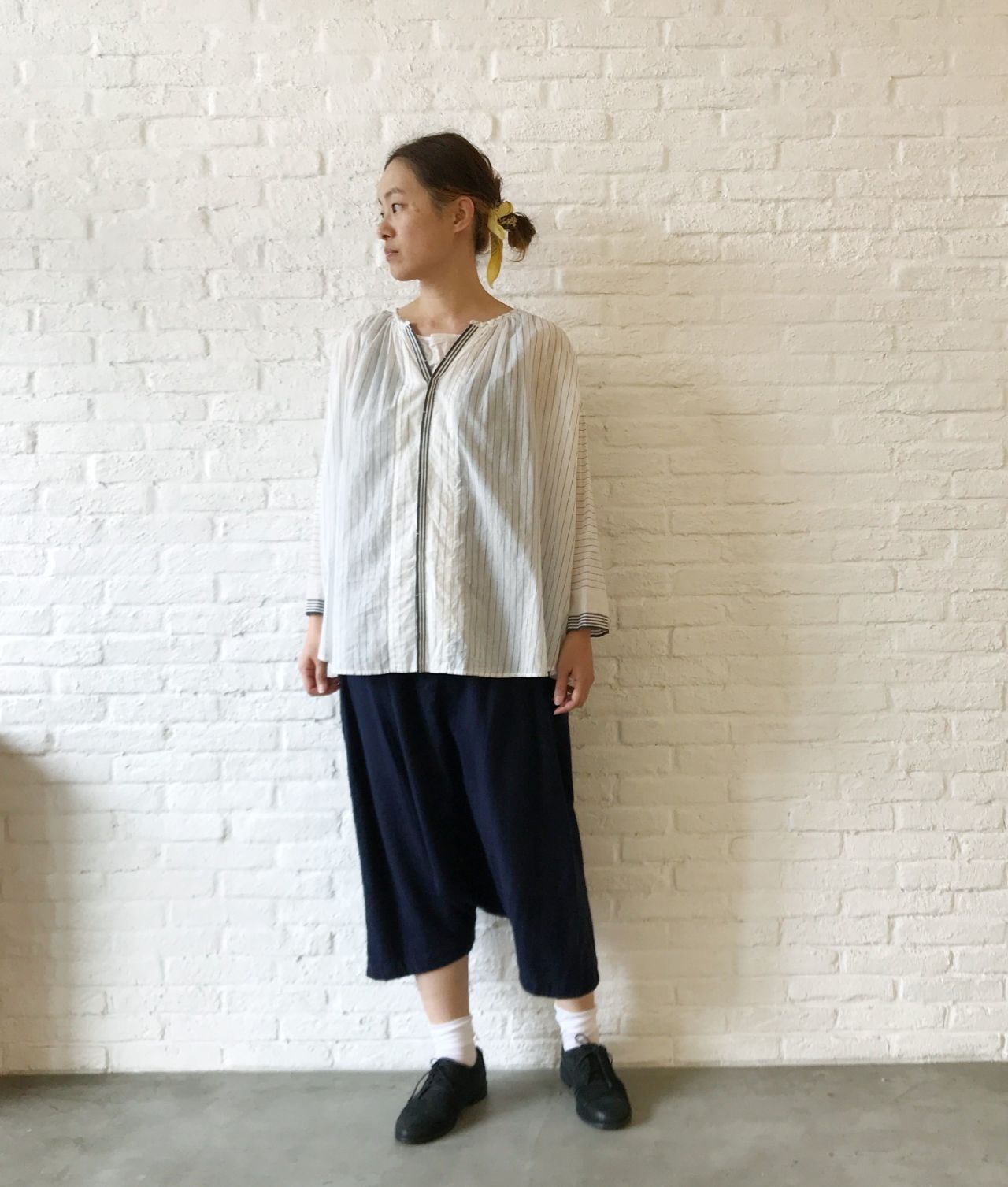 春夏に着やすい襟元があいたブラウスは、パドカレならではの”生地の耳使い”を活かしたディテールが特徴的です。