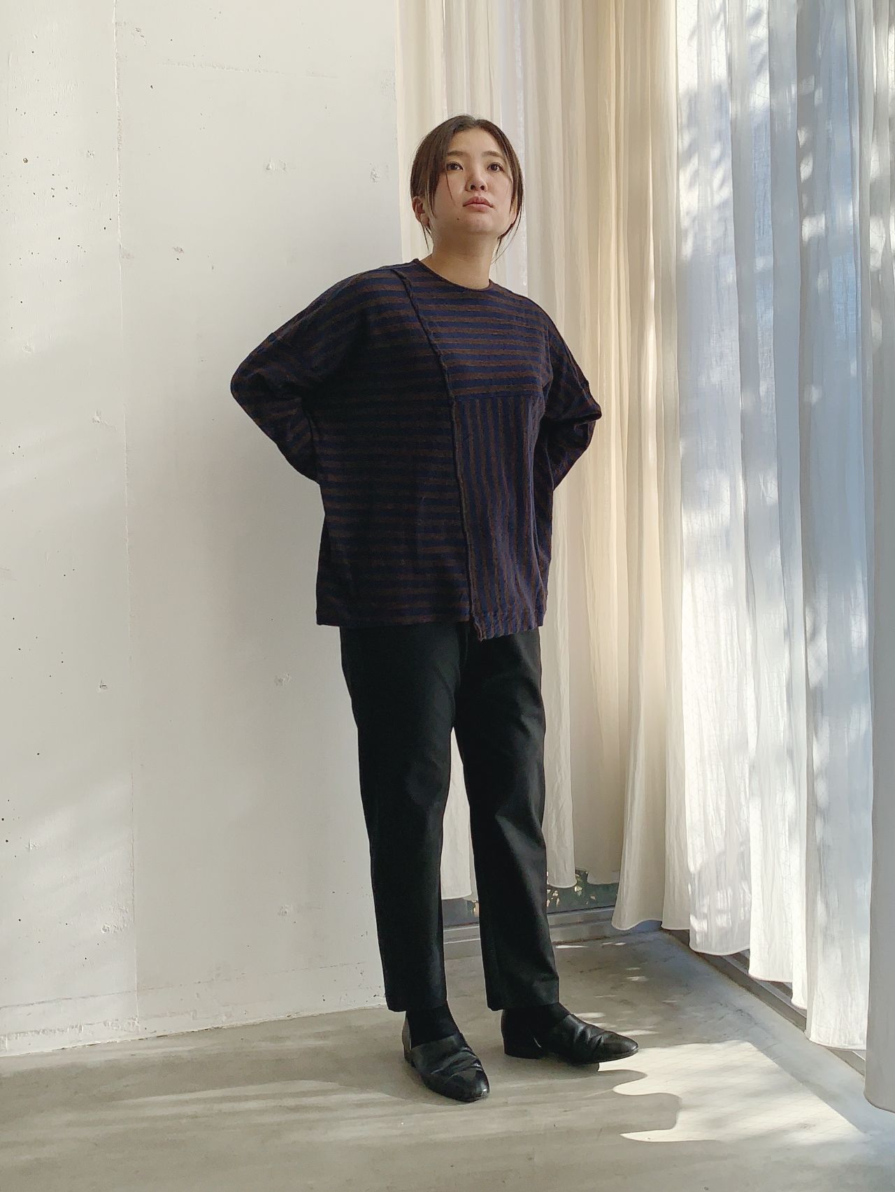 綿ウールの細ボーダー生地がつぎはぎで組み合わされている変形カットソーです。