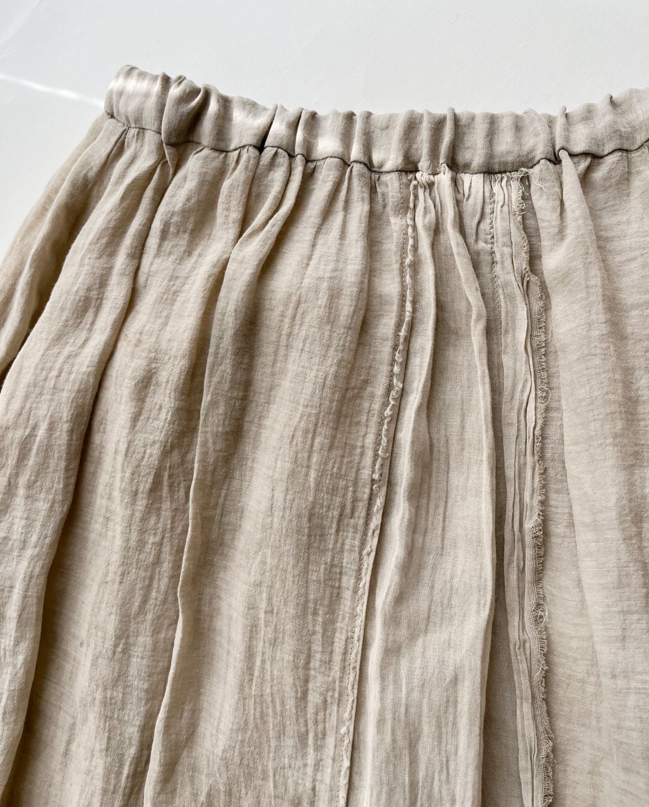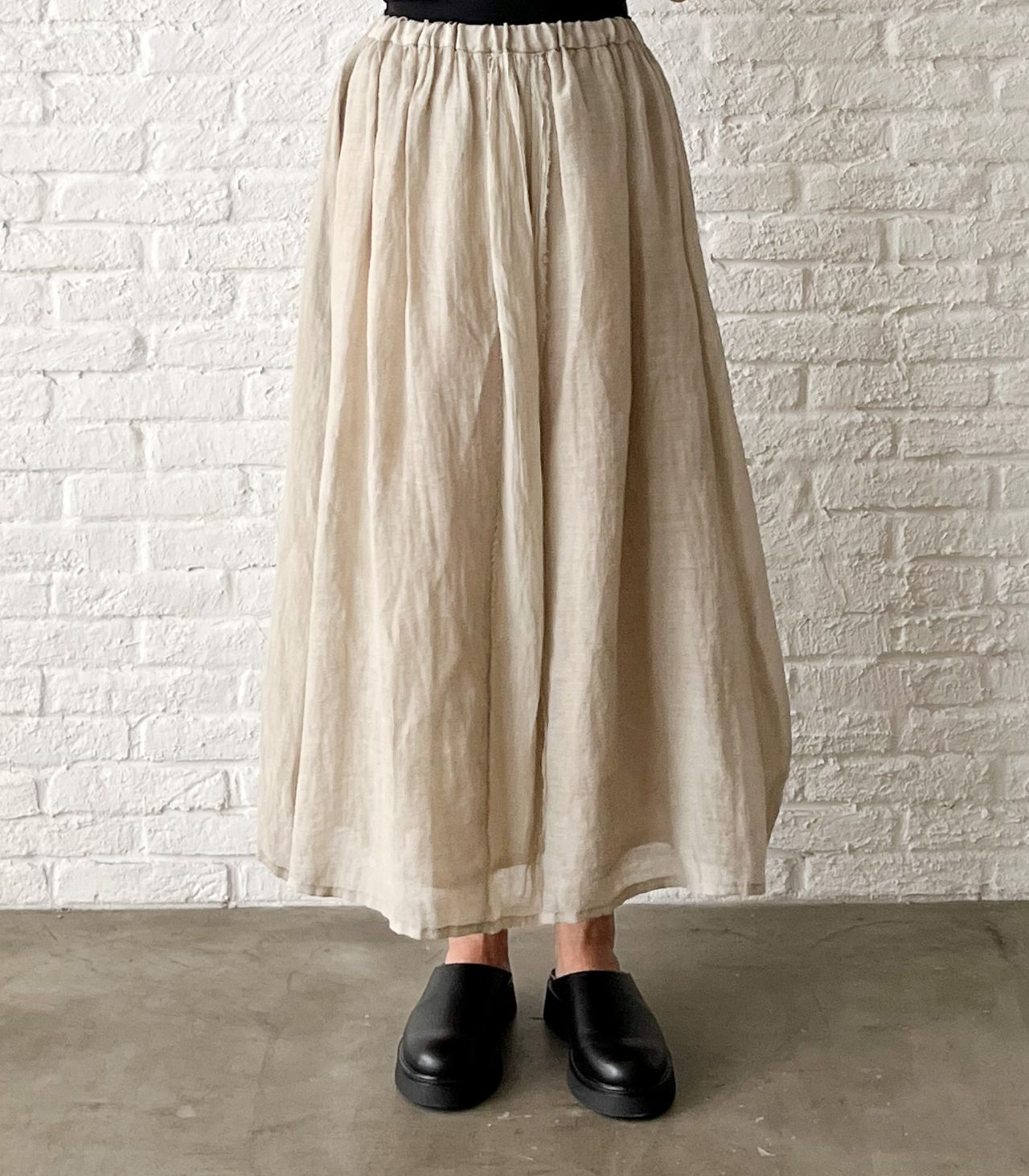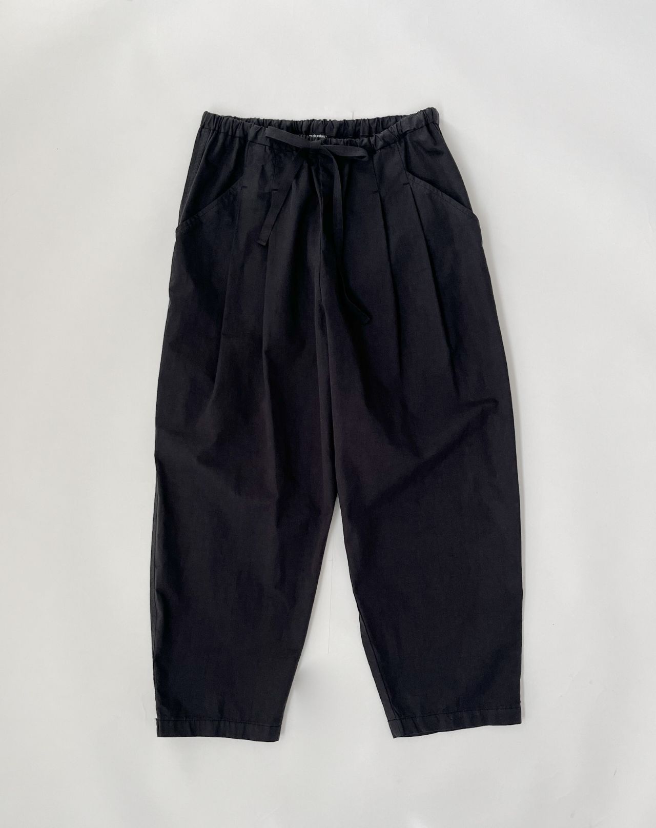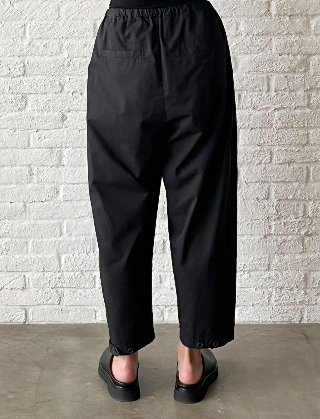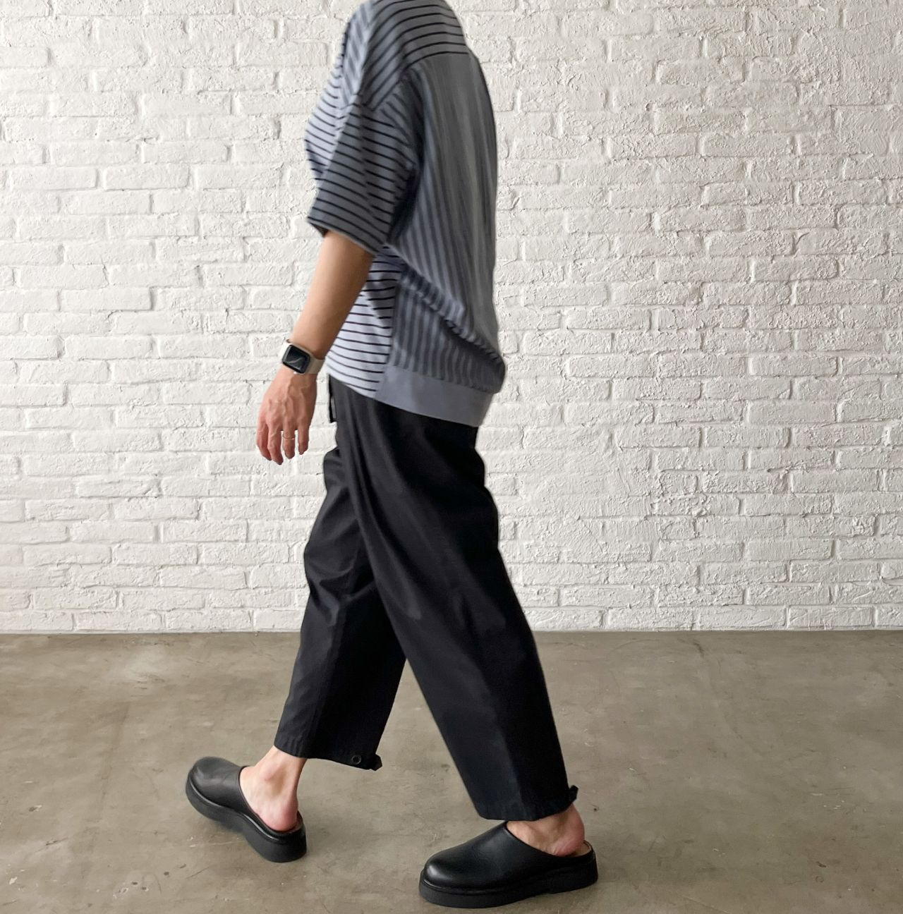 腰周りはタック+ウエストゴムでゆとりを持たせて、裾にはボタンが付いているので細めにしてメリハリあるシルエットをお楽しみいただいても。