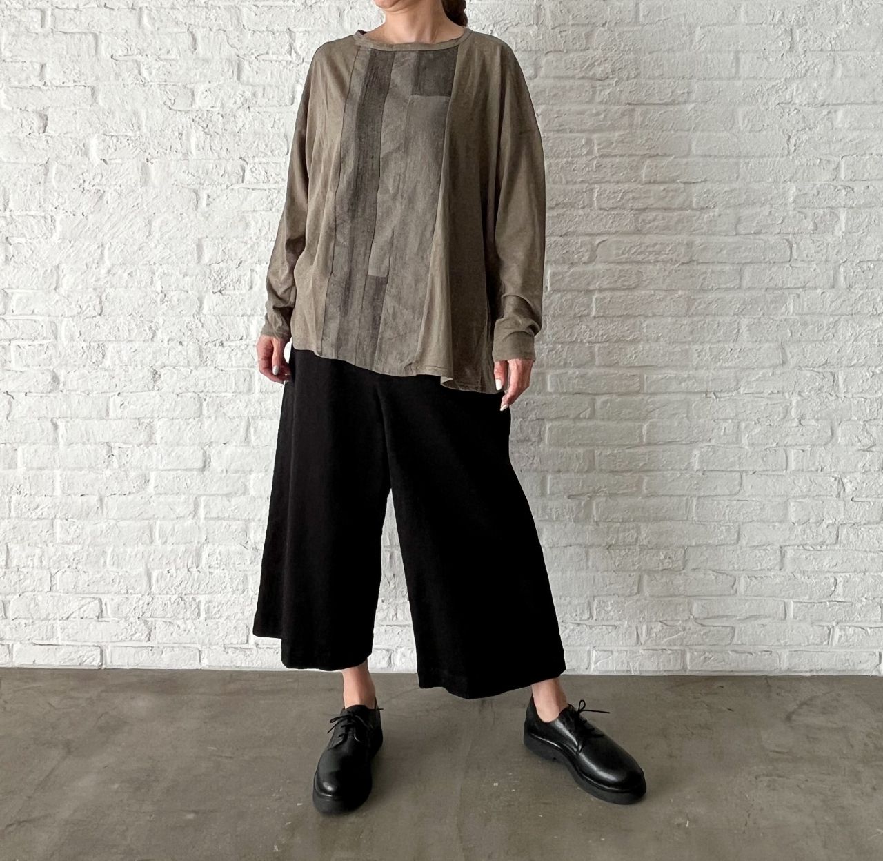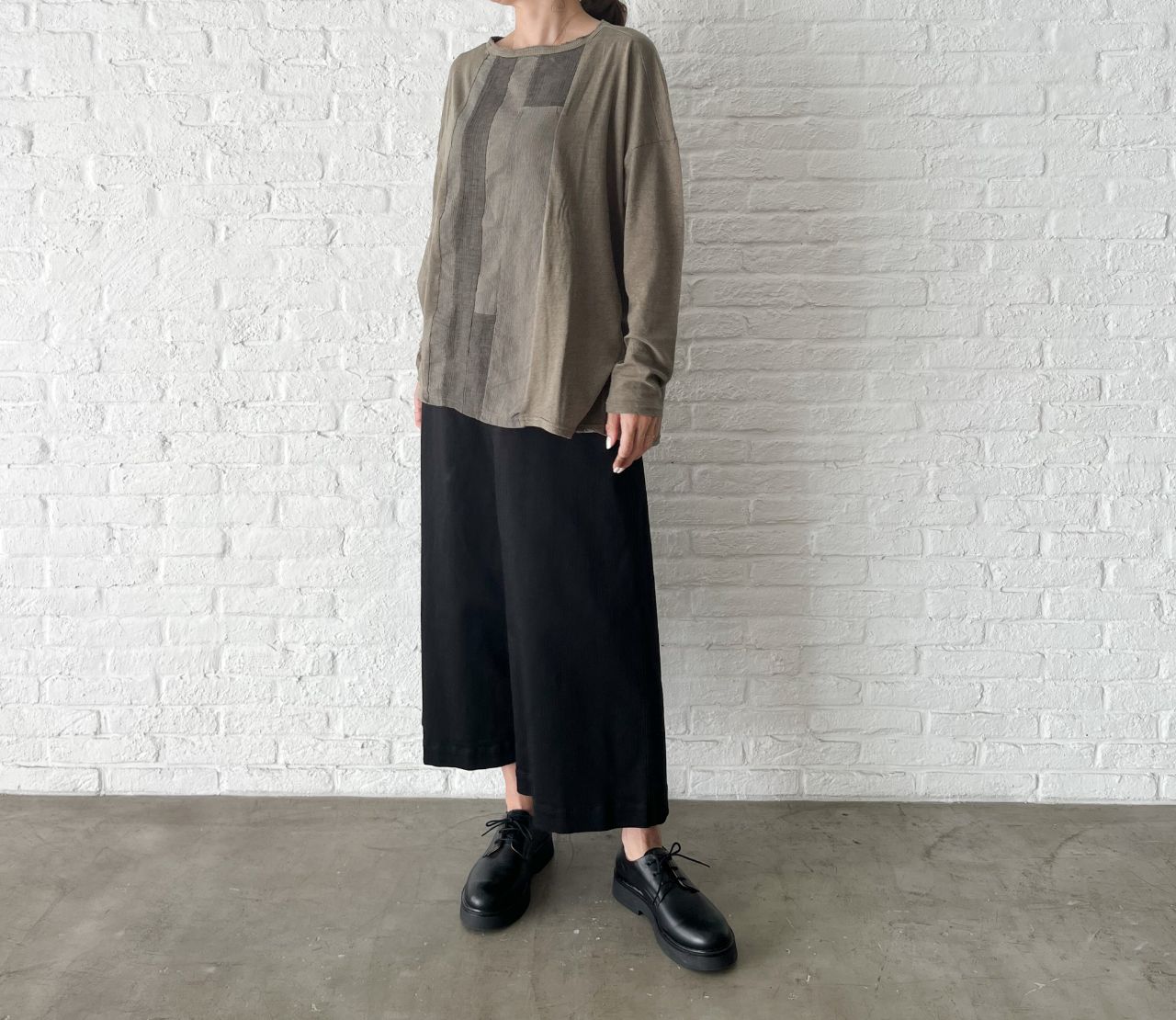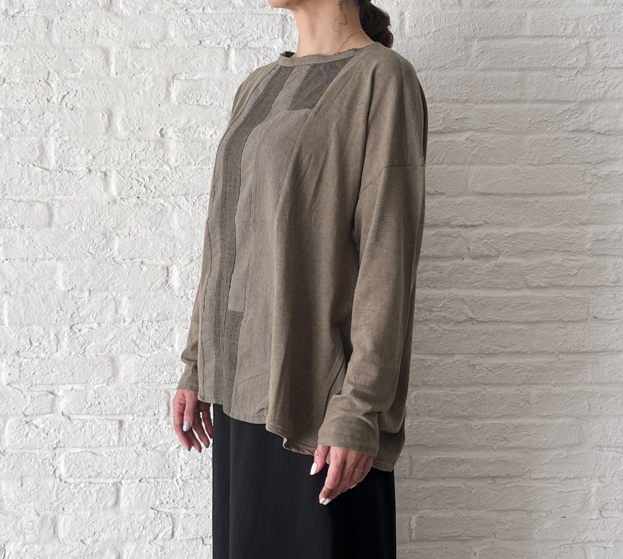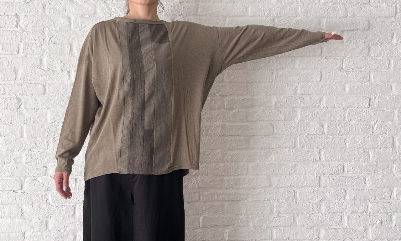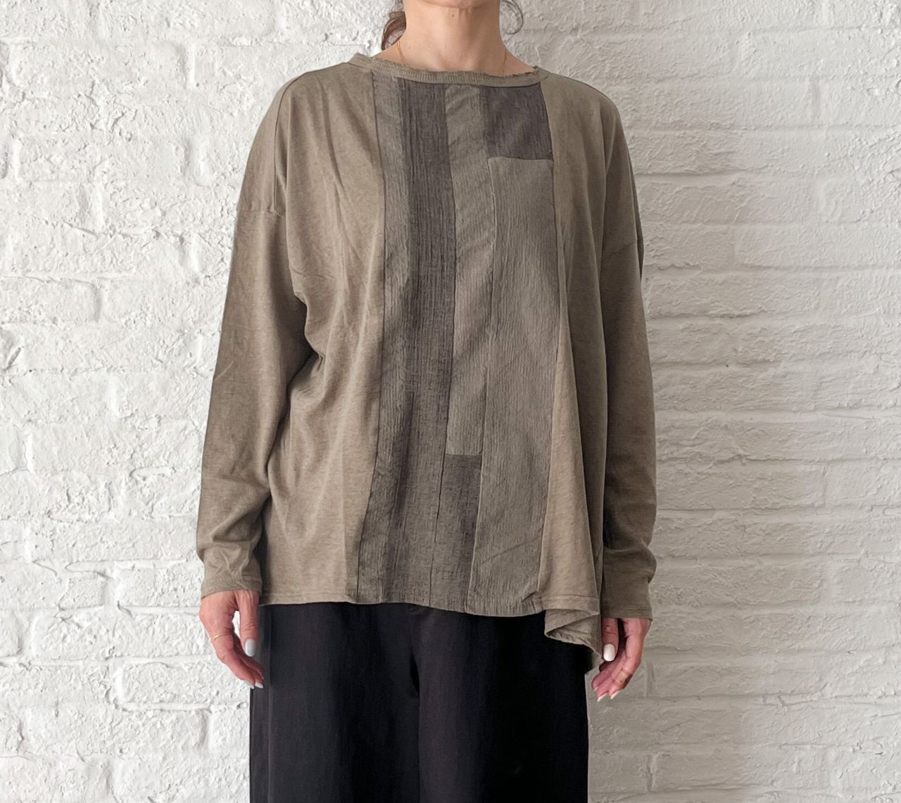 肌触りが柔らかく心地良いカットソーをメインに、前のパッチワークをポイントにした長袖カットソーです。