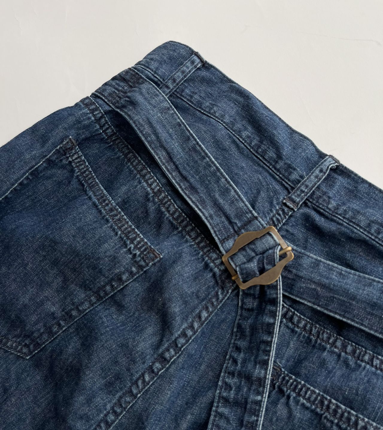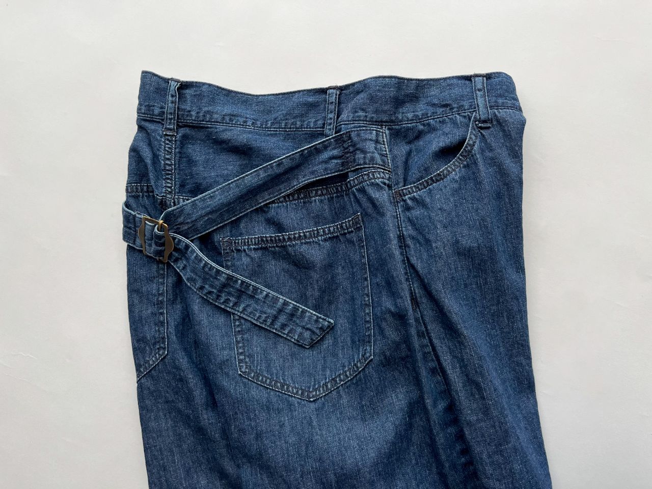 ウエストにゴムが入らないので、後ろのベルトでキュッと絞って履いていただけます。