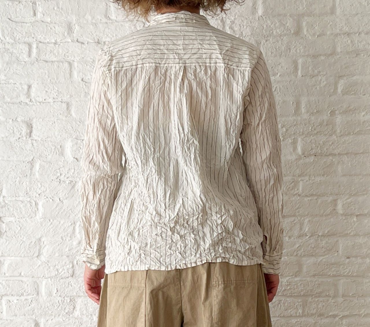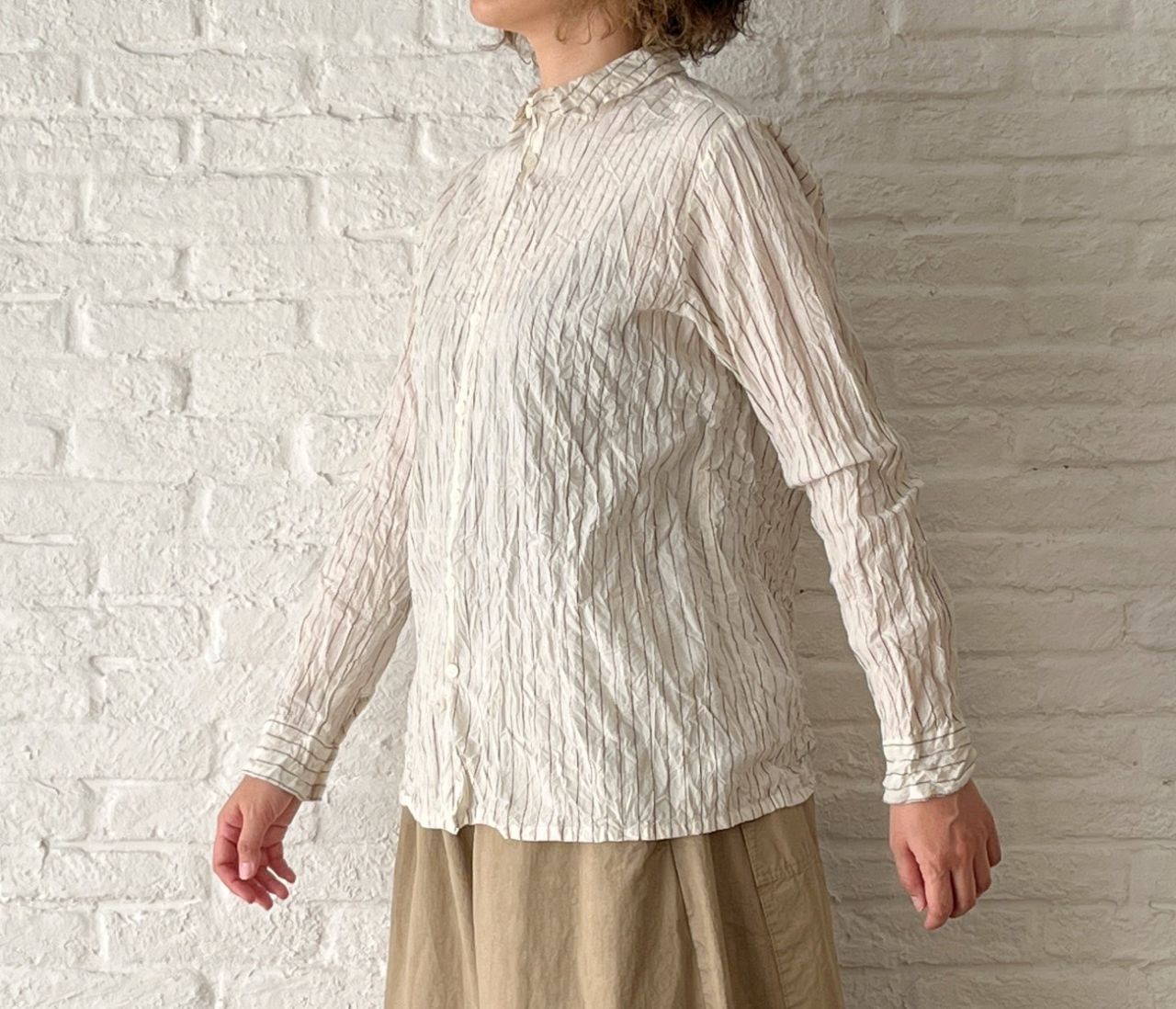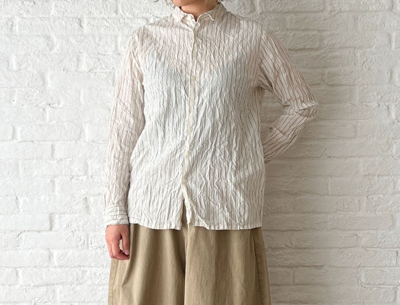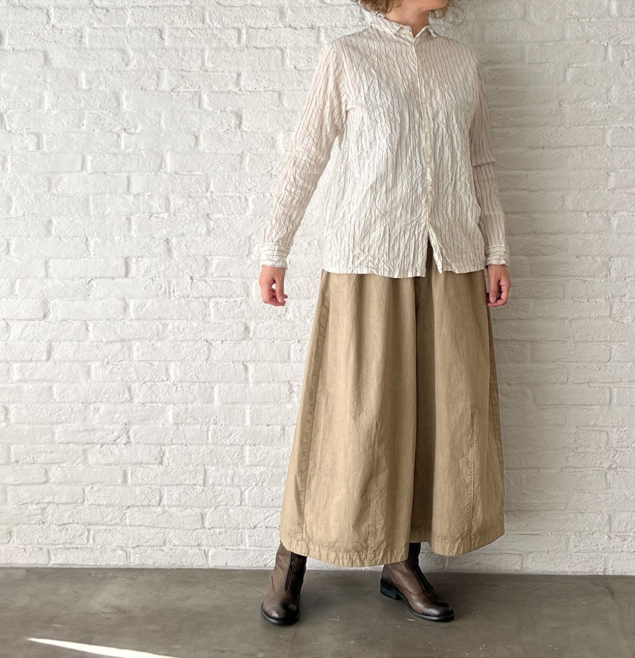 カットソーがペタッとしているので、シワをつけて表情を出したブラウスを中に着ました。