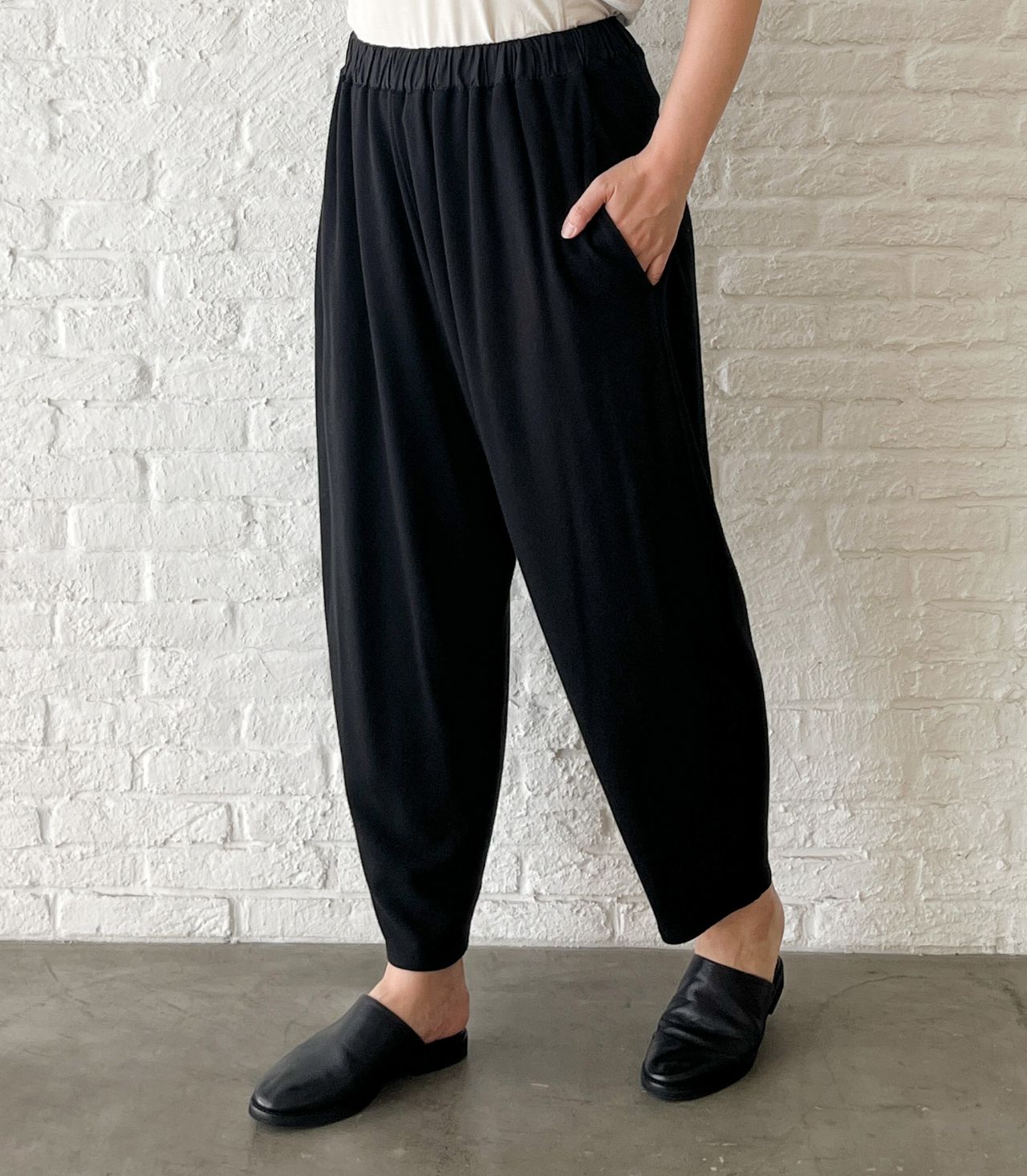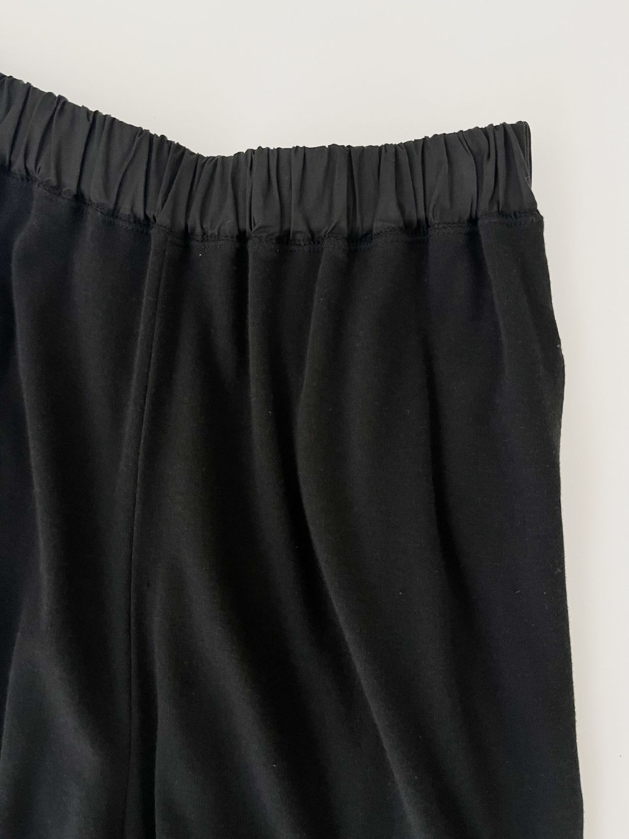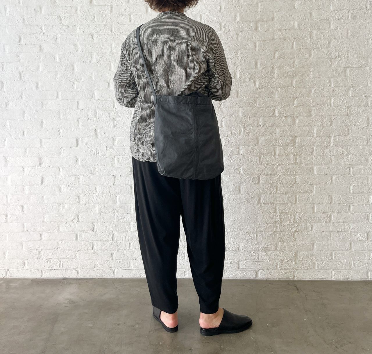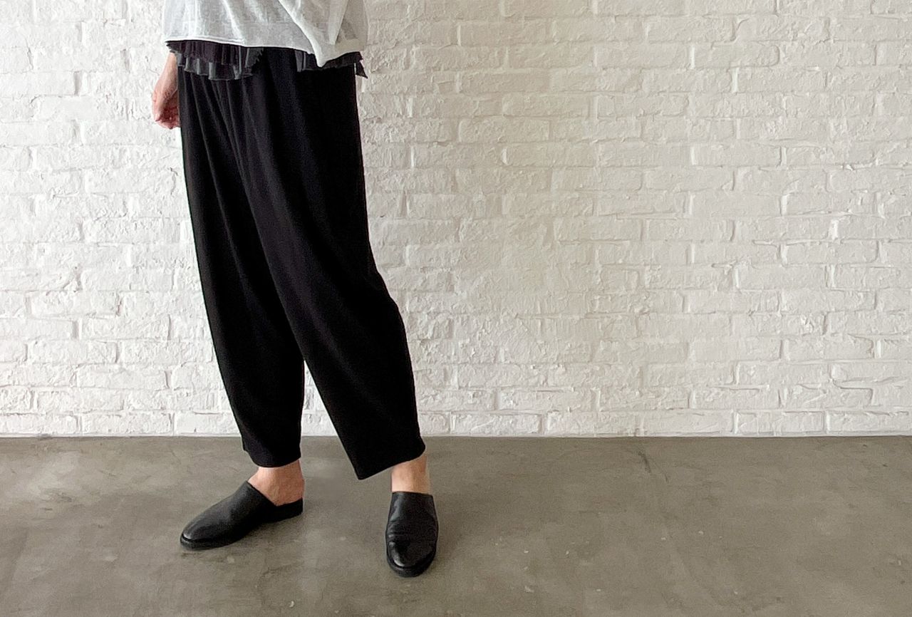 腰回りにゆとりがあり裾が細めになったシルエットなので、すっきりと。