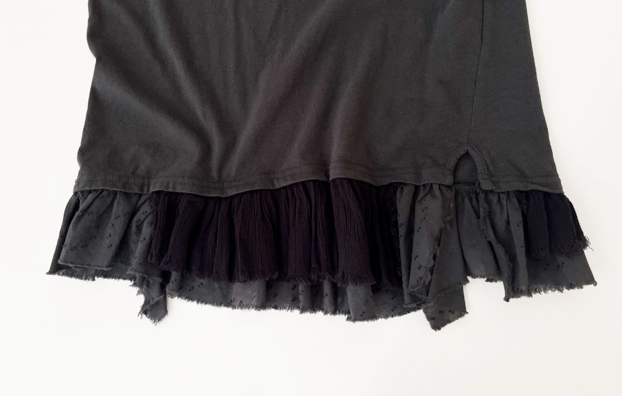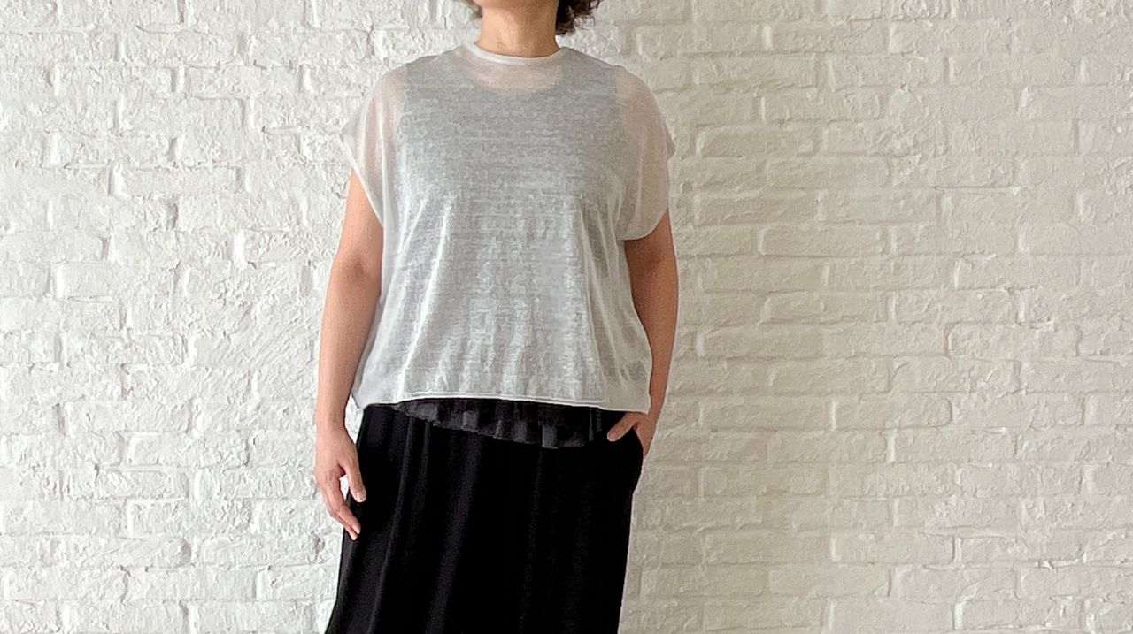 Tシャツだとカジュアル感が出るので、シアー感あるニットにしました。