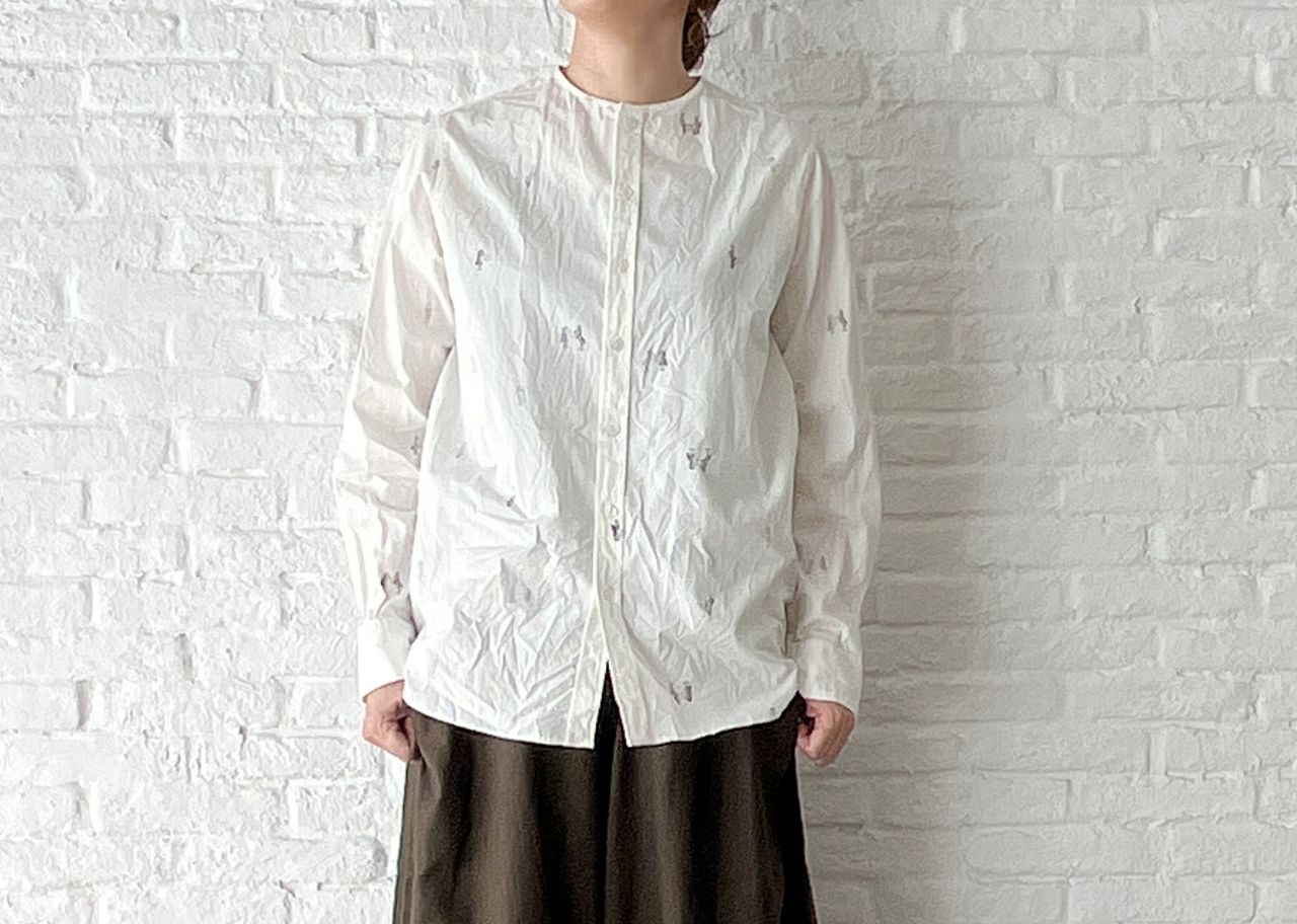 クルーネックのブラウスですと襟元がすっきり見えます。