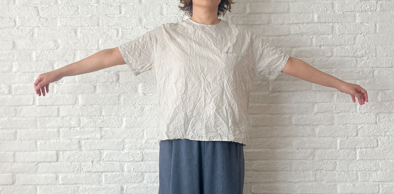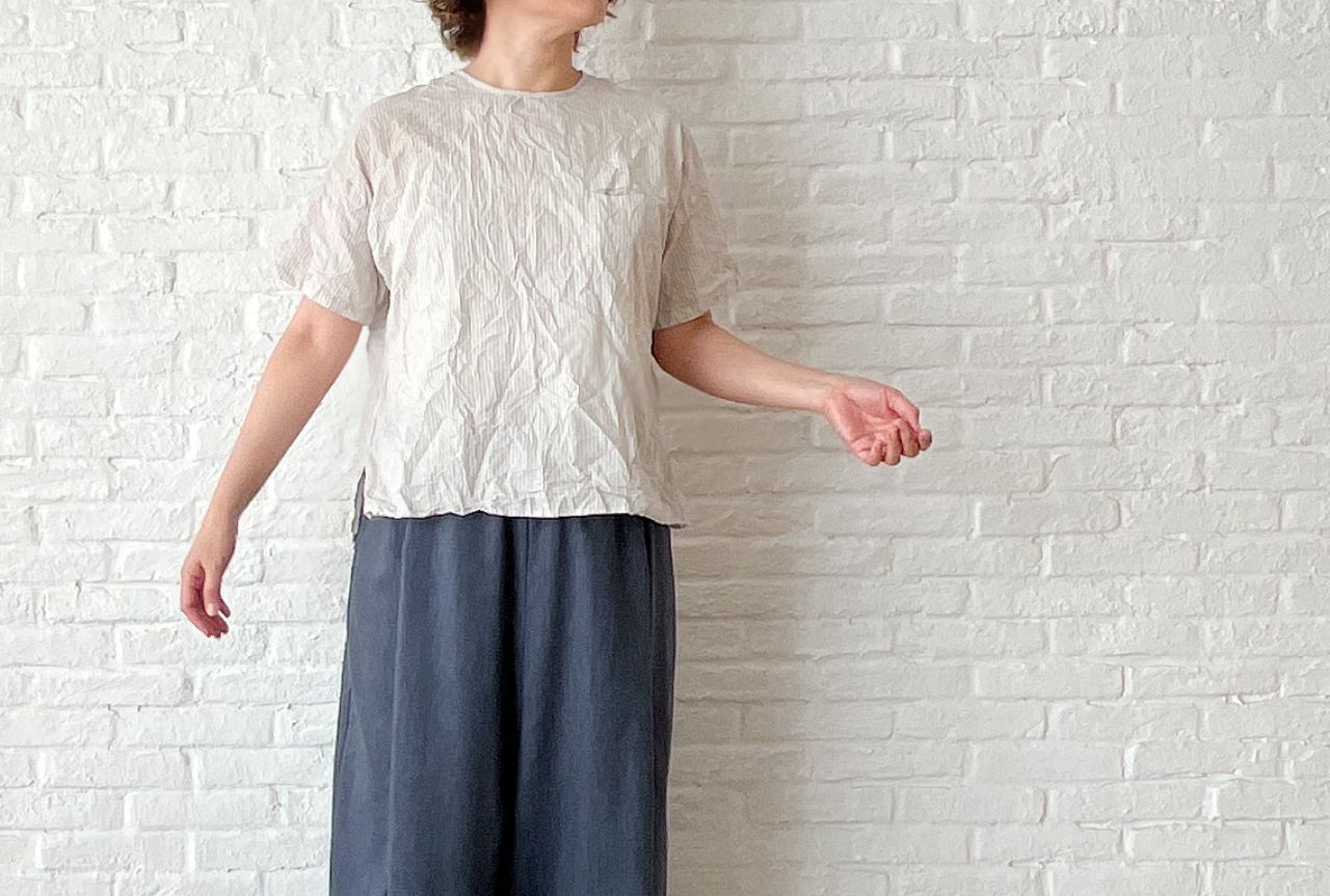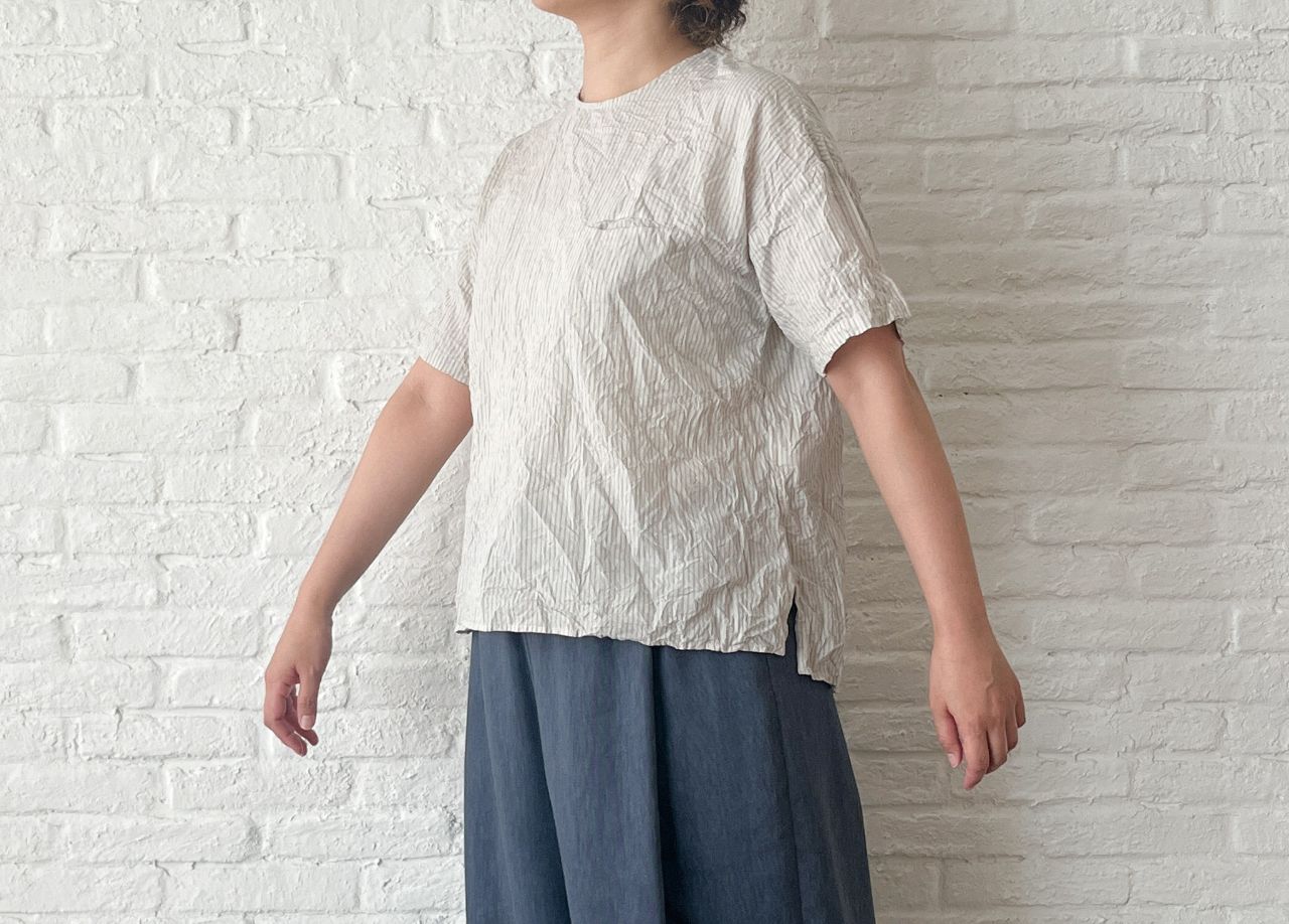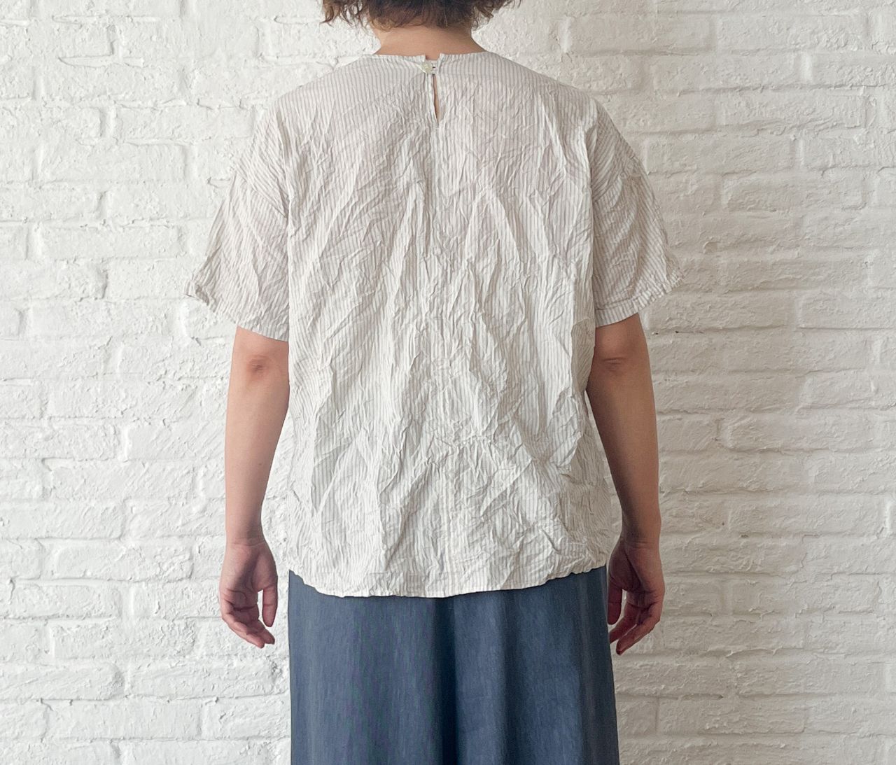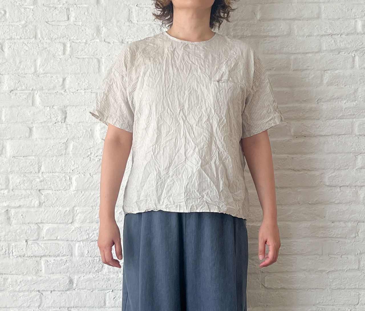Tシャツ感覚でガシガシ着れて洗える半袖ブラウスは、淡いストライプ柄が入った涼しげな表情。
