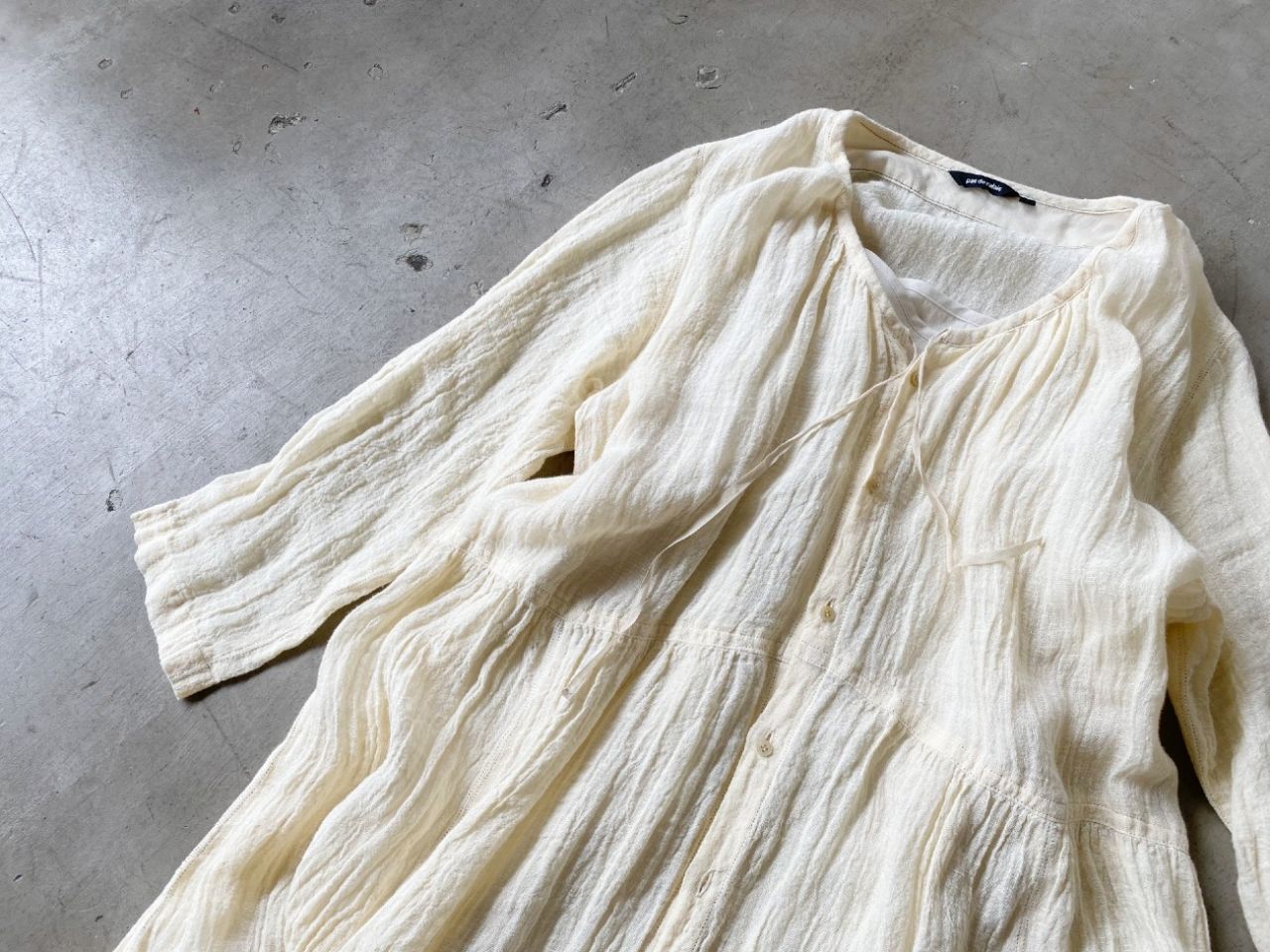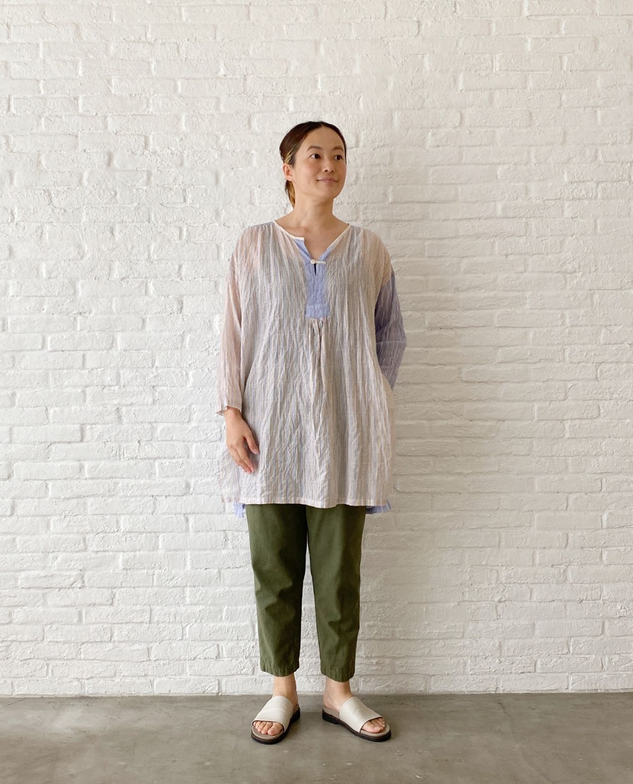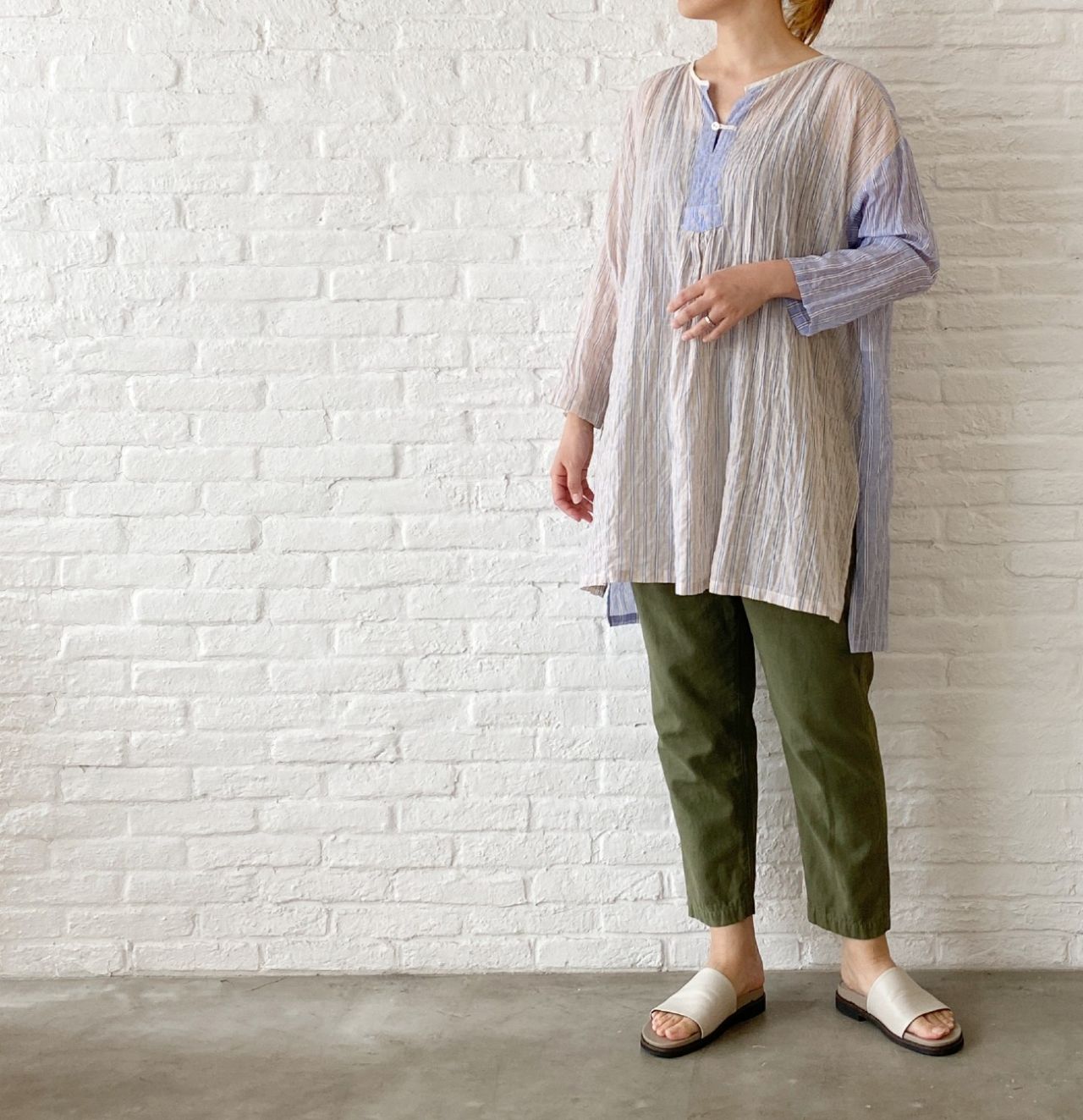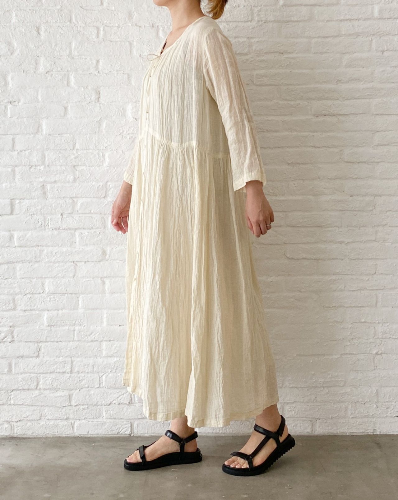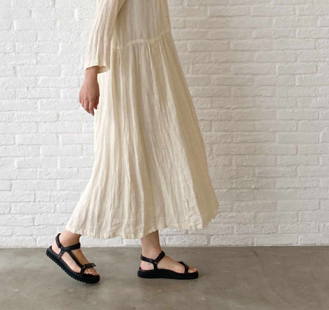 リネンボイルの柔らかな質感に、アイボリーだと、フェミニンなかわいらしいイメージになるので、あえてスポーツテイストが入った サンダル で合わせました。