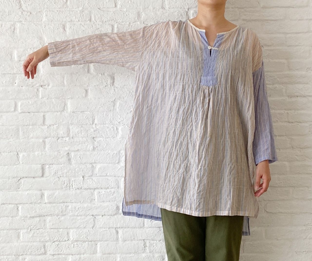 透けるほど薄手のストライプ柄を切り替えた、ロングブラウス。