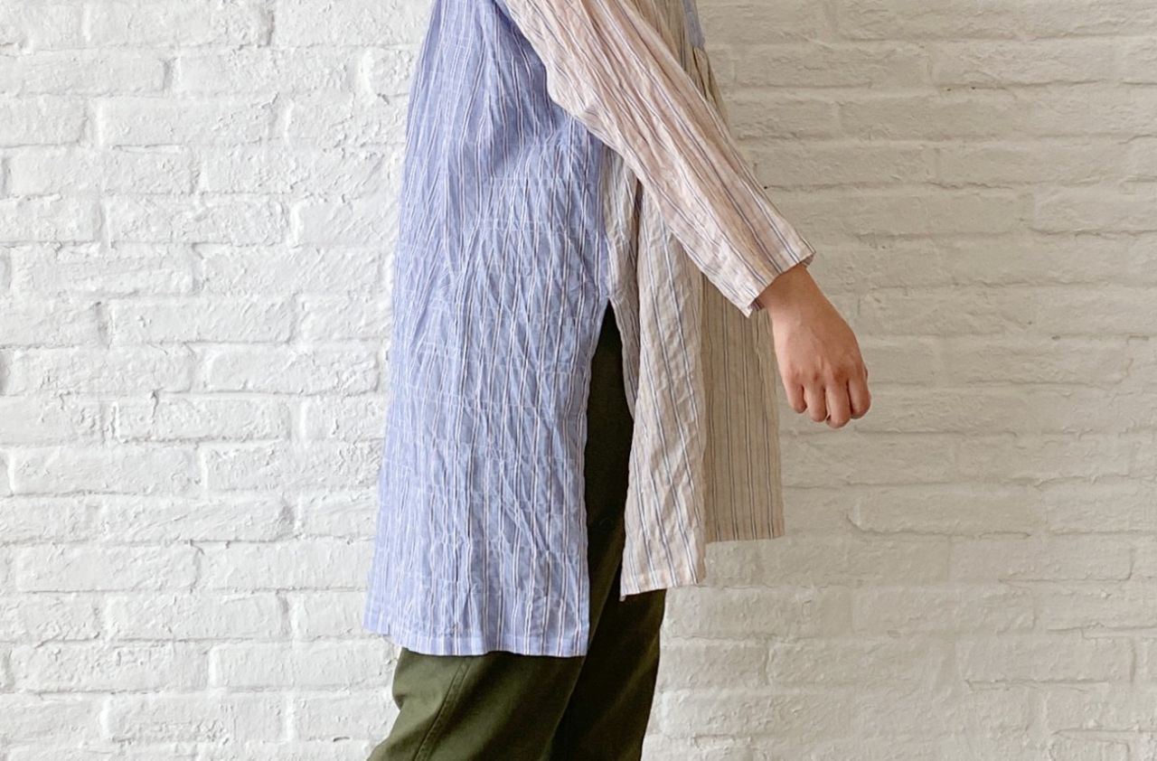 左右で色が異なる袖を一折してアクセントにしました。