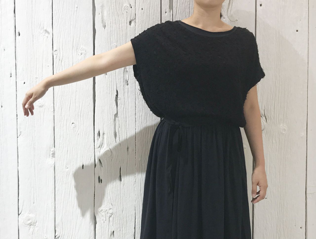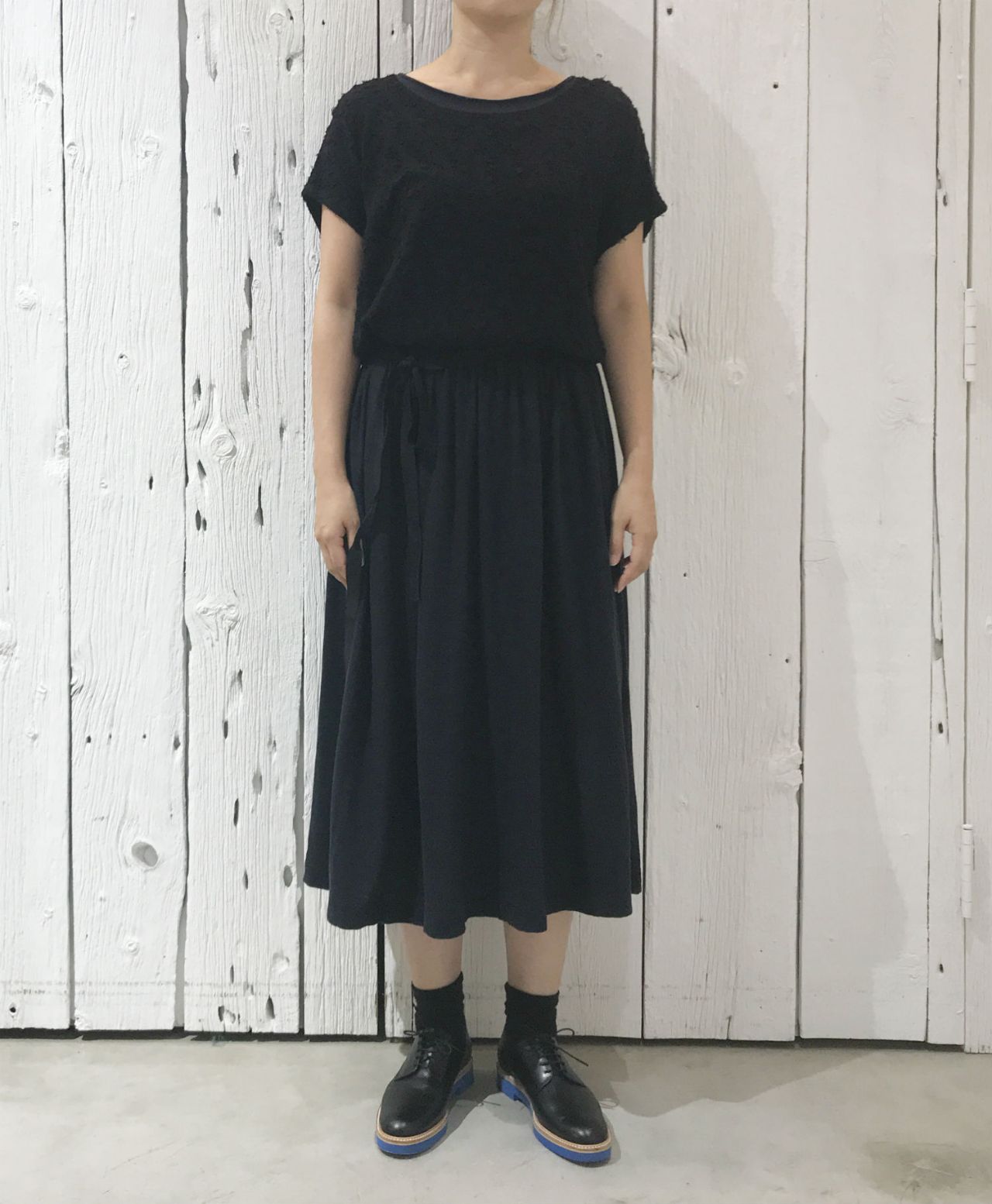 ウエストにゴムが入っているので、自然とブラウジングしてバランス良くしてくれるワンピース。
