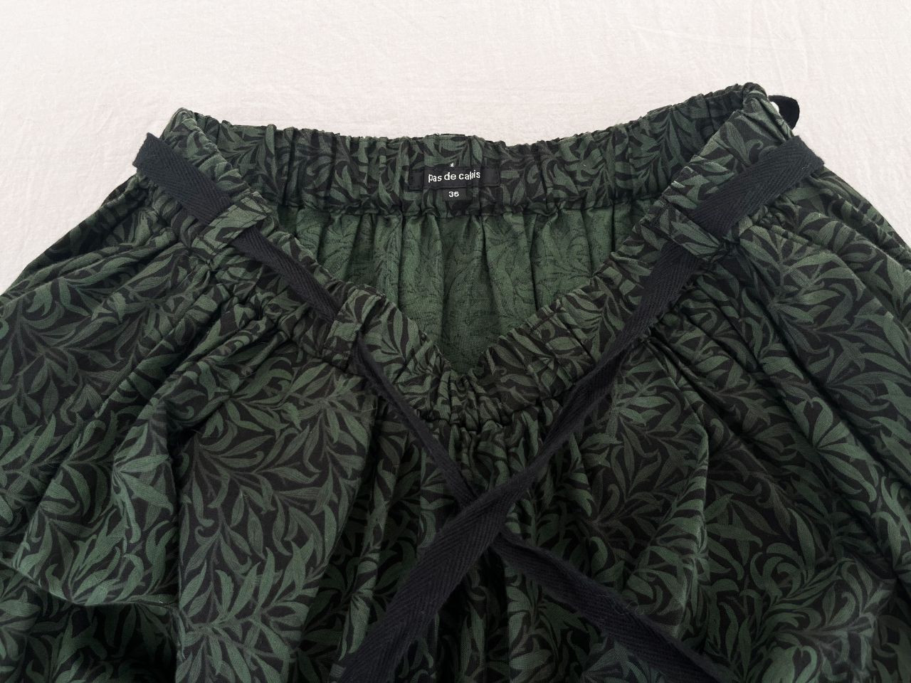 ウエストはゴム仕様で、飾りの紐ベルトをつけています。