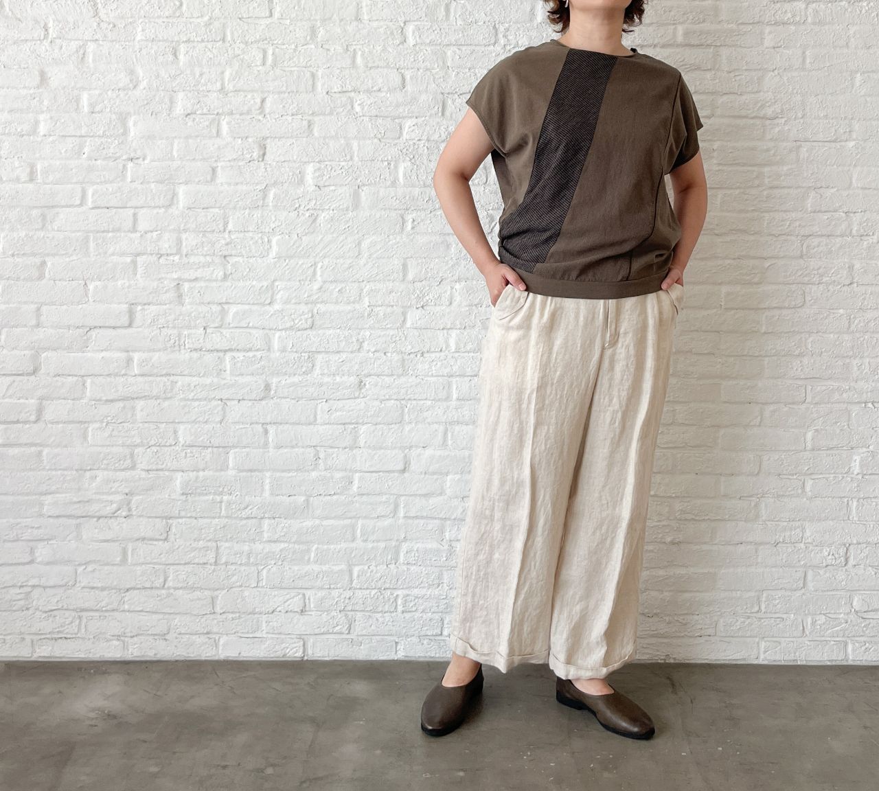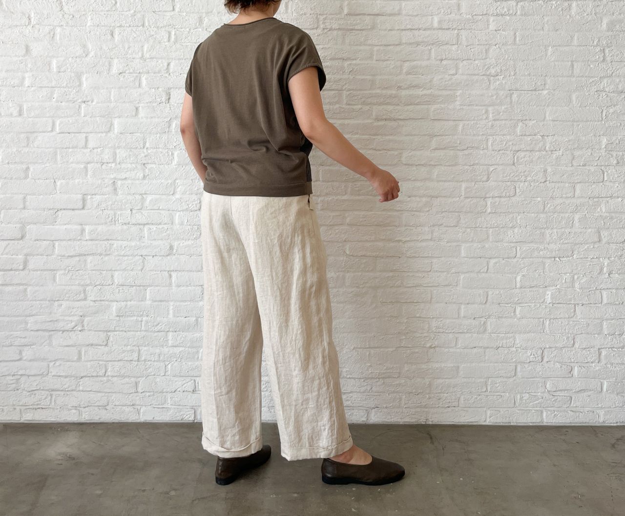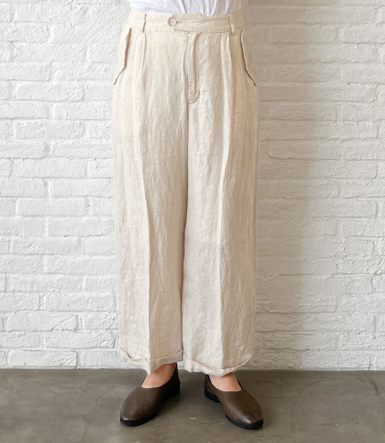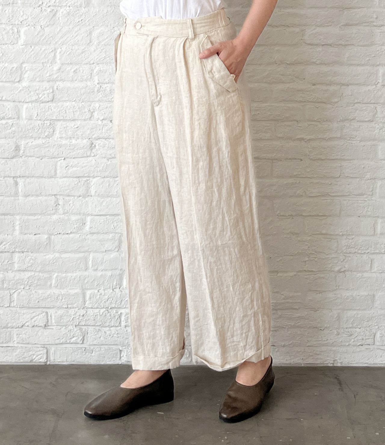 麻素材のパンツは、パドカレでは珍しいダブルの裾。