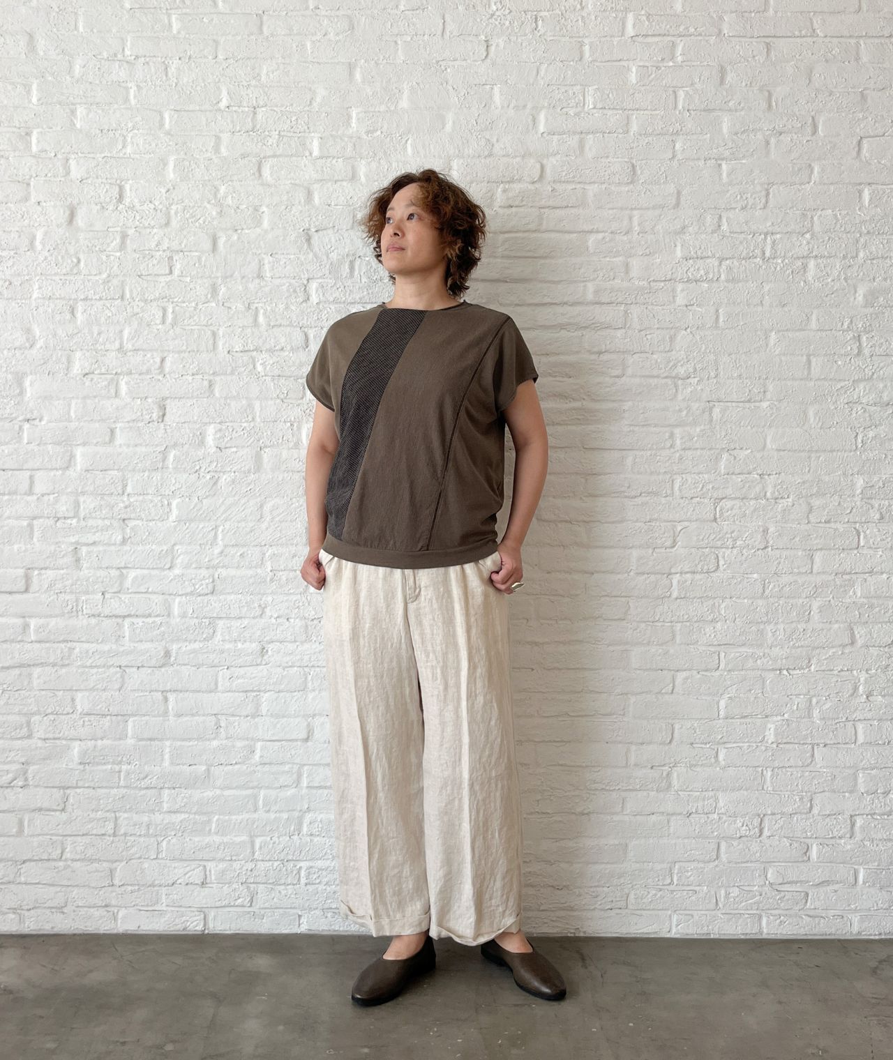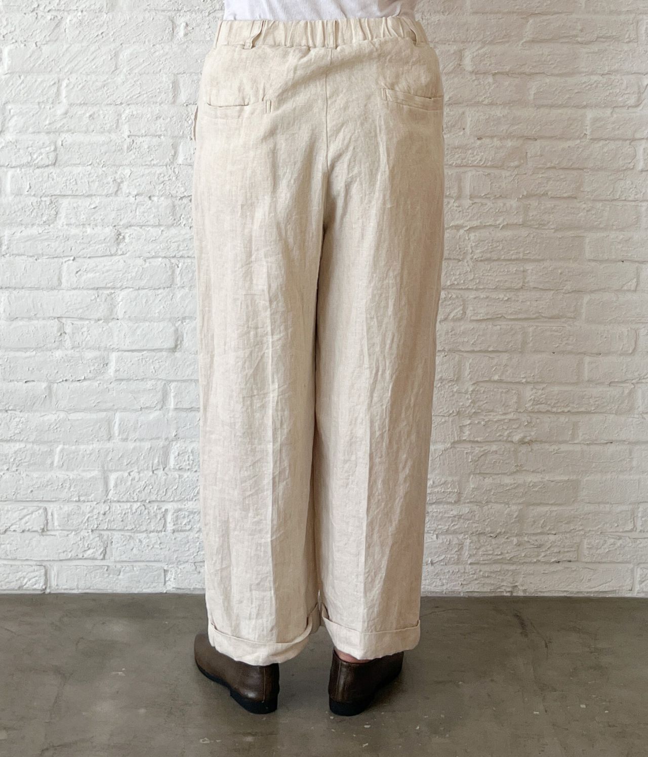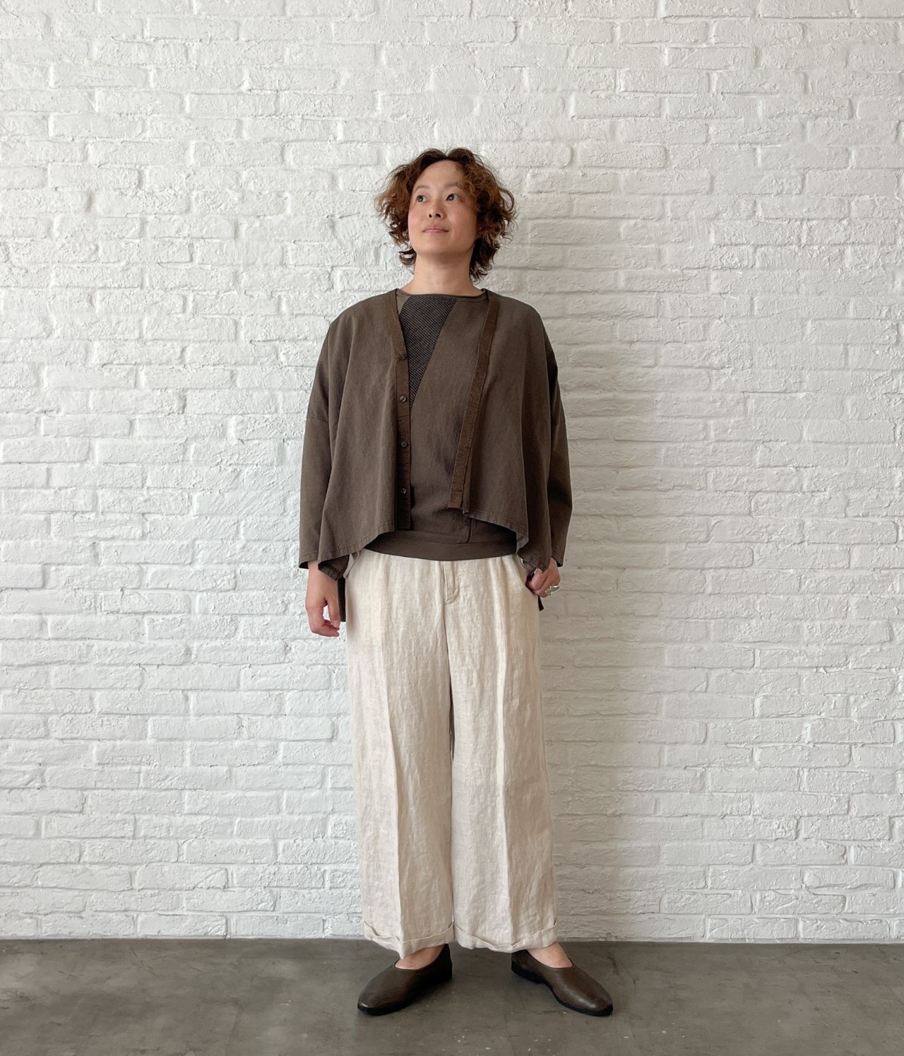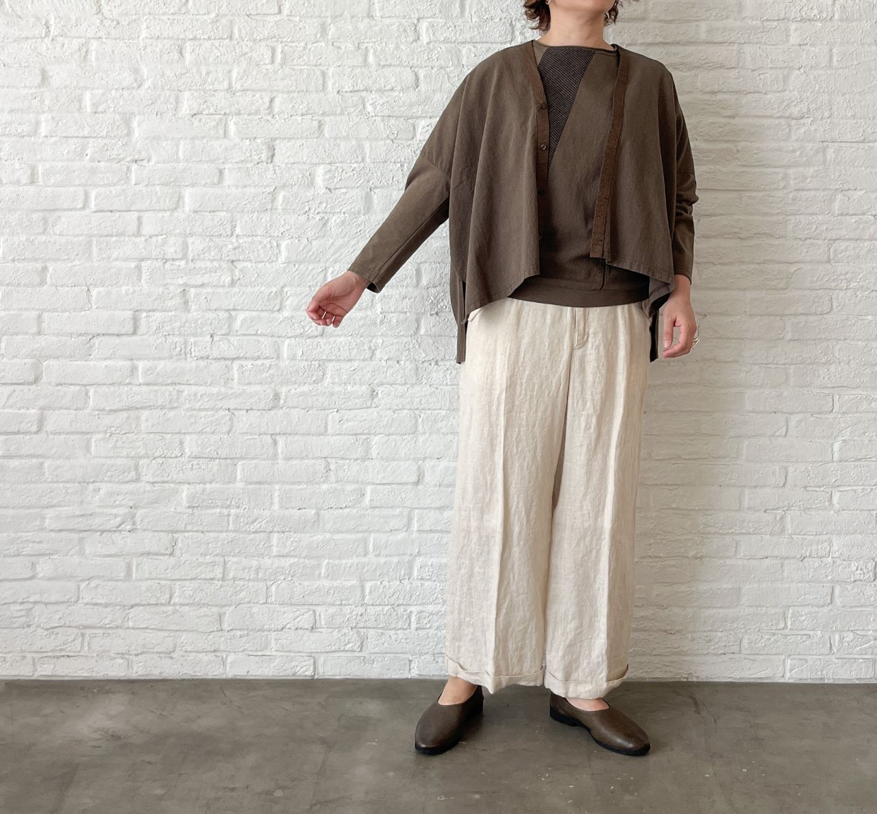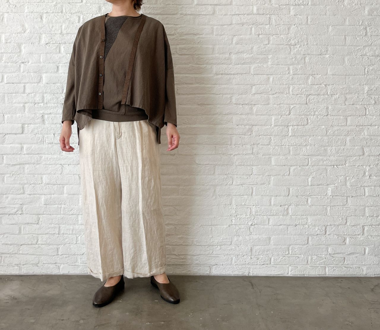 麻素材のパンツは、パドカレでは珍しいダブルの裾。