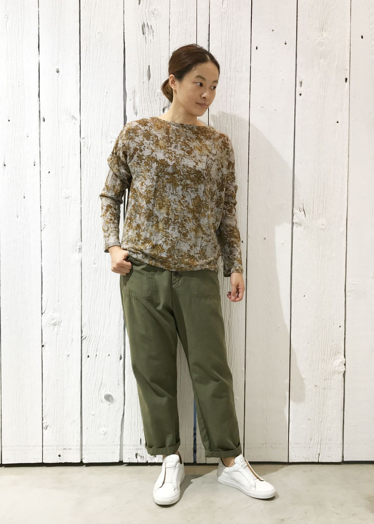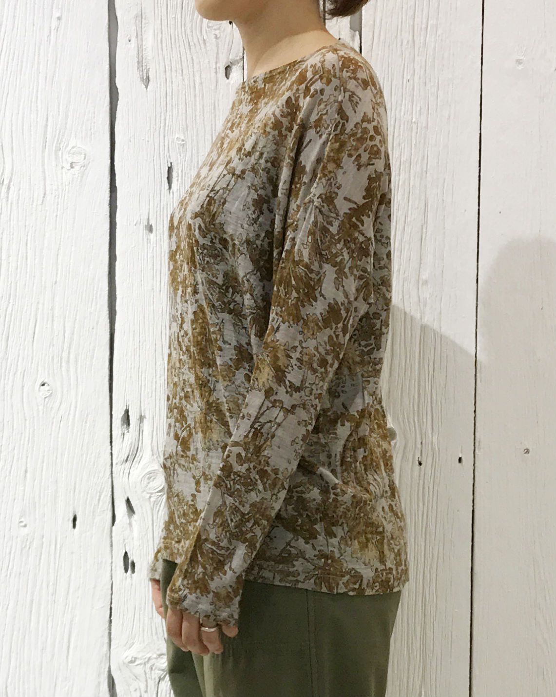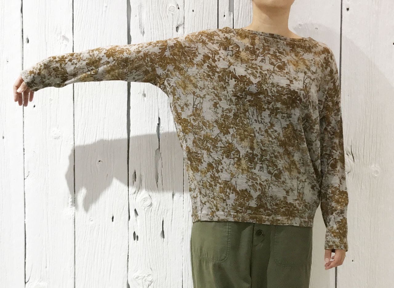 プリントが入った薄手のウールカットソーが目を惹きます。