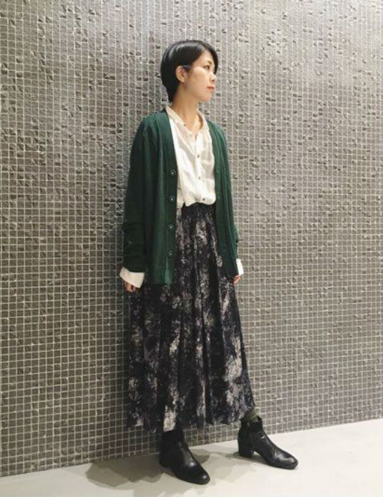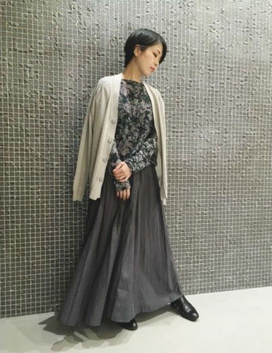 全体的に馴染むような、ベージュ系のカーディガンを。